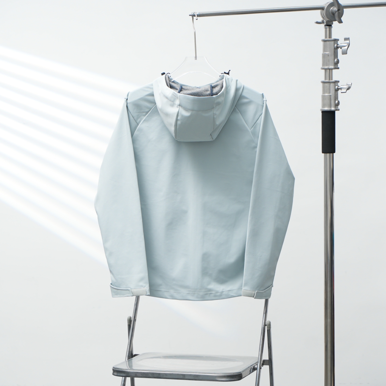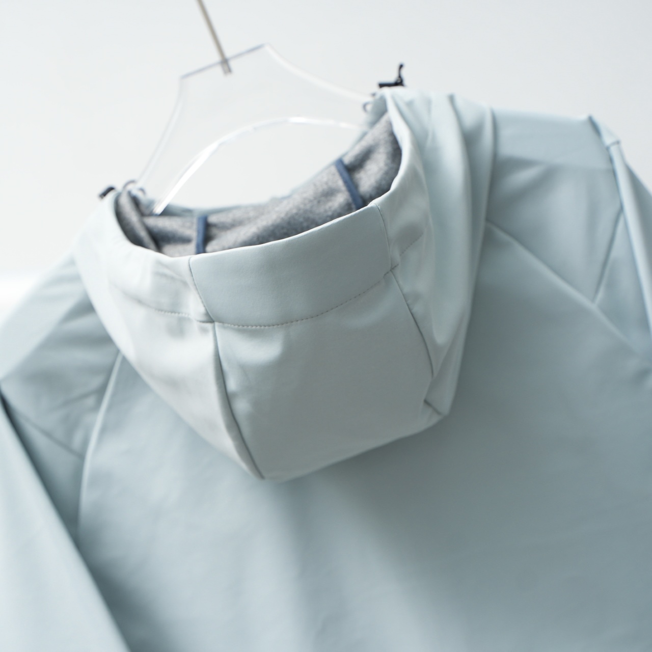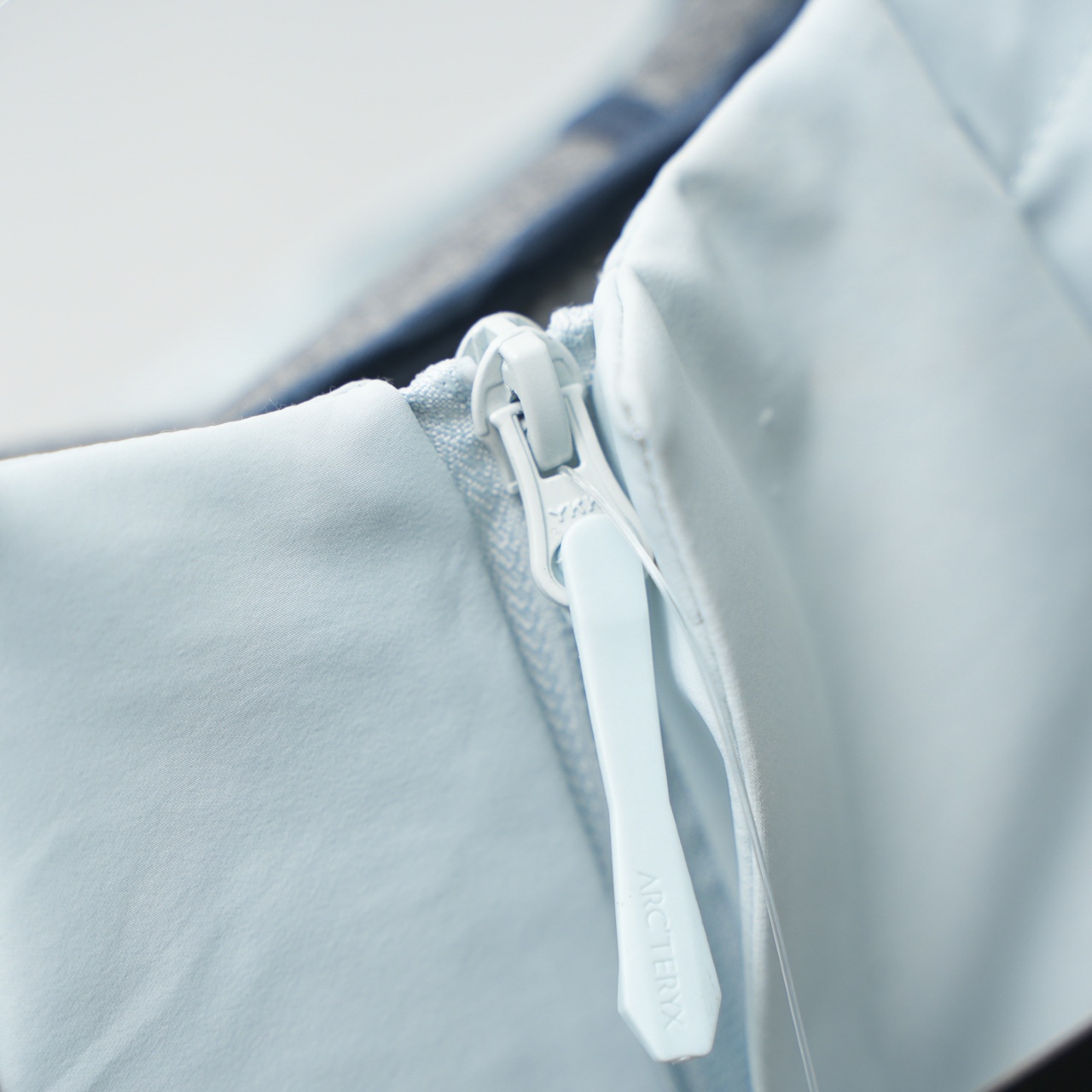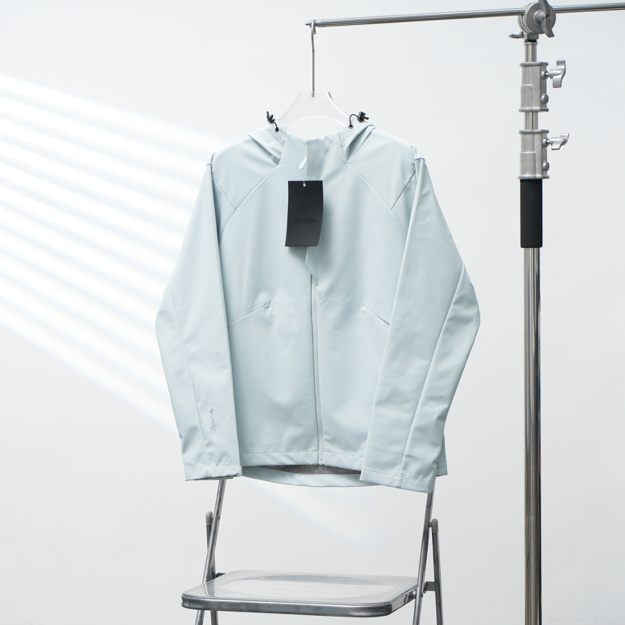 Factory direct Arc'teryx embroidered outdoor softshell hooded jacket. Color: Daybreak Blue. Sizes: S-XXL.