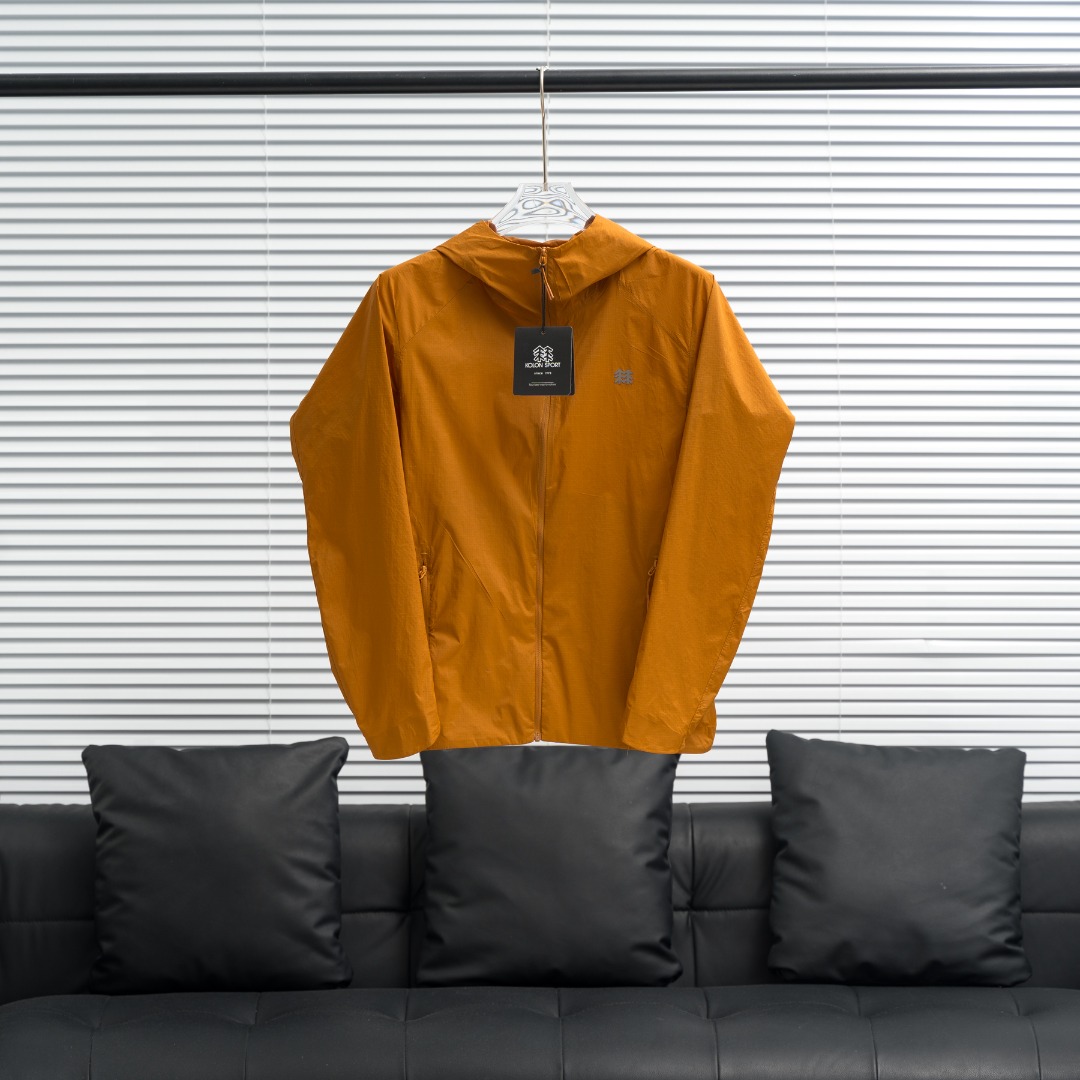 KOLON SPORT small logo solid color sun protection hoodie. Colors: Black, Gray White, Yellow. Sizes: S-XXL.