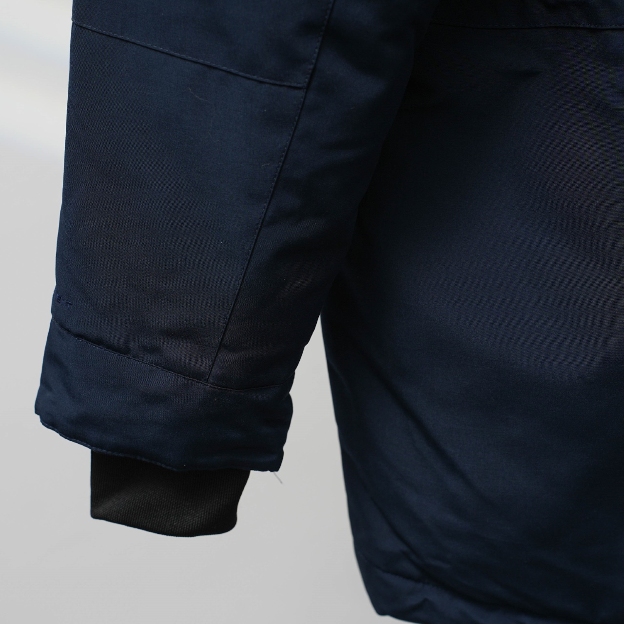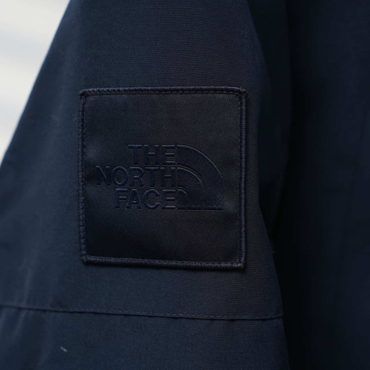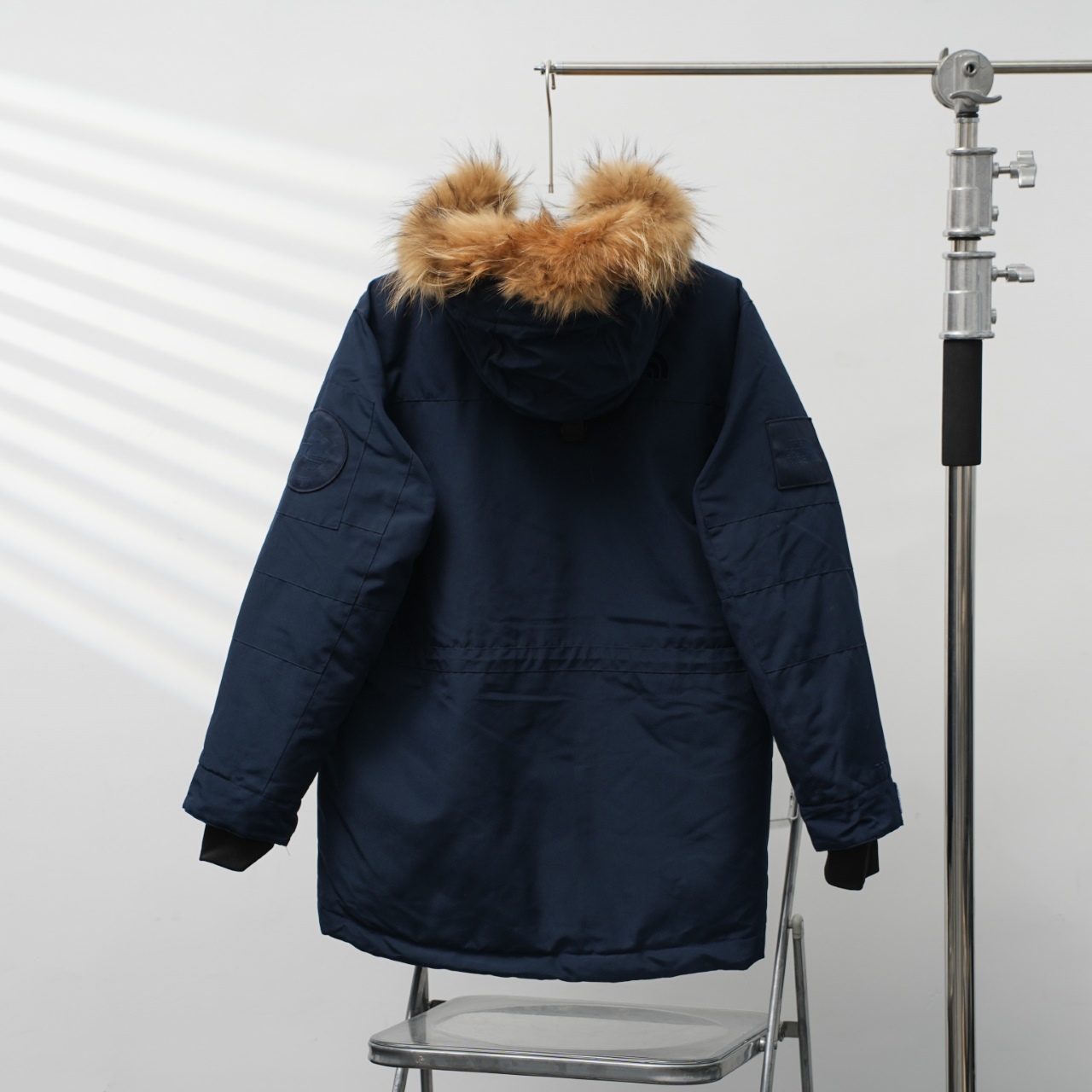 The North Face Expedition Hooded Down Jacket with Fur Trim in Navy Blue, sizes XS-XXL.
