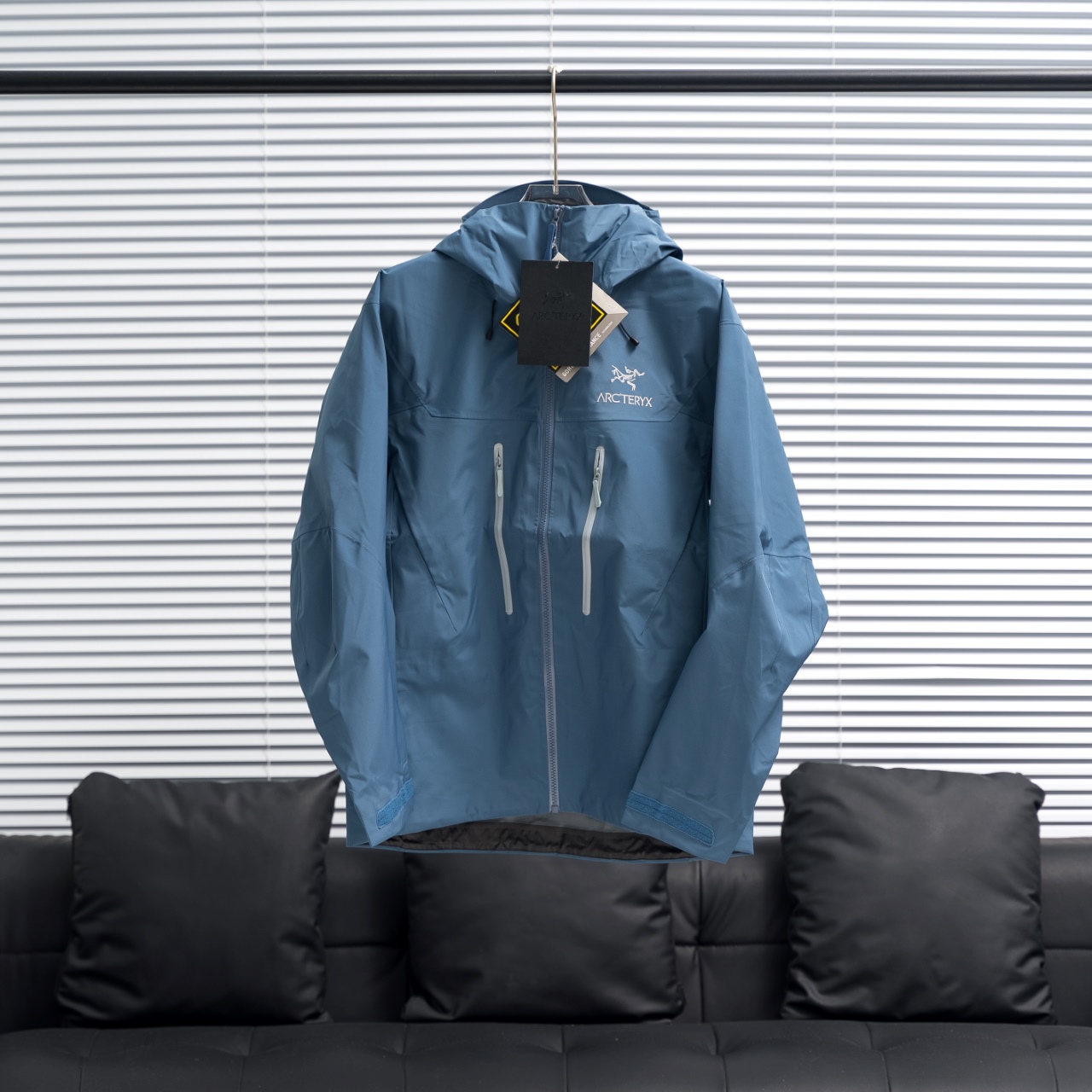Factory direct ARC'TERYX Alpha SV6 hooded jacket in Moon Blue, sizes S-XXL.
