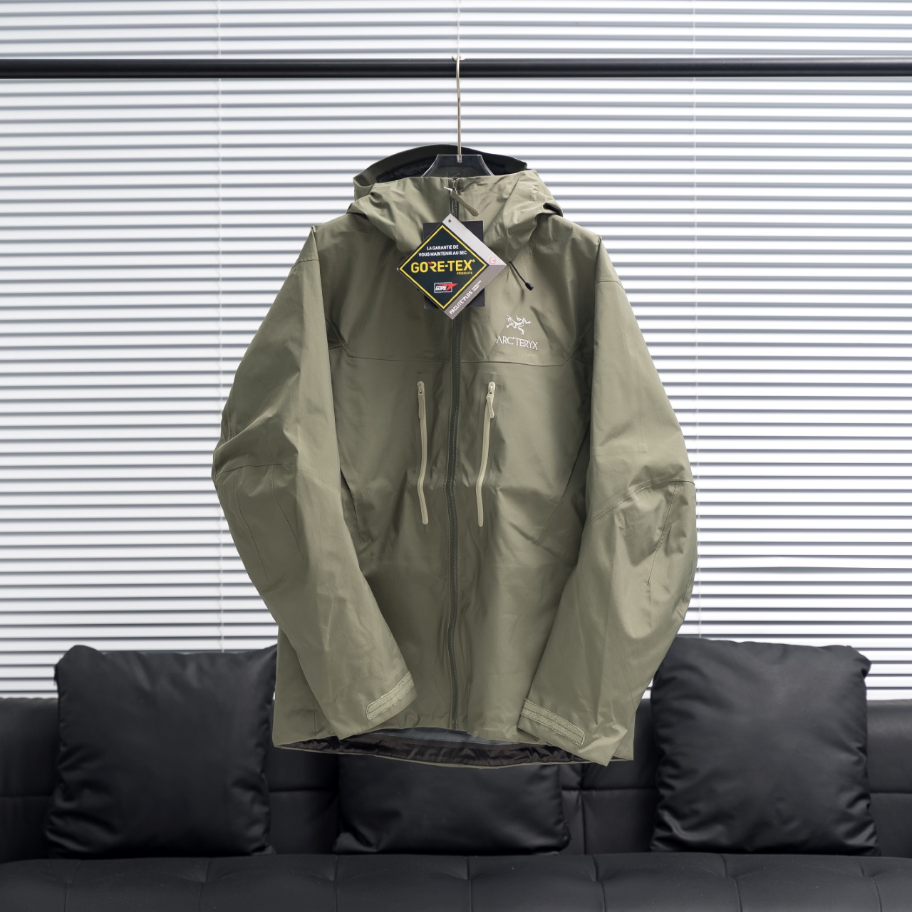 Factory direct ARC'TERYX Alpha SV6 hooded jacket in Misty Green, sizes S-XXL.