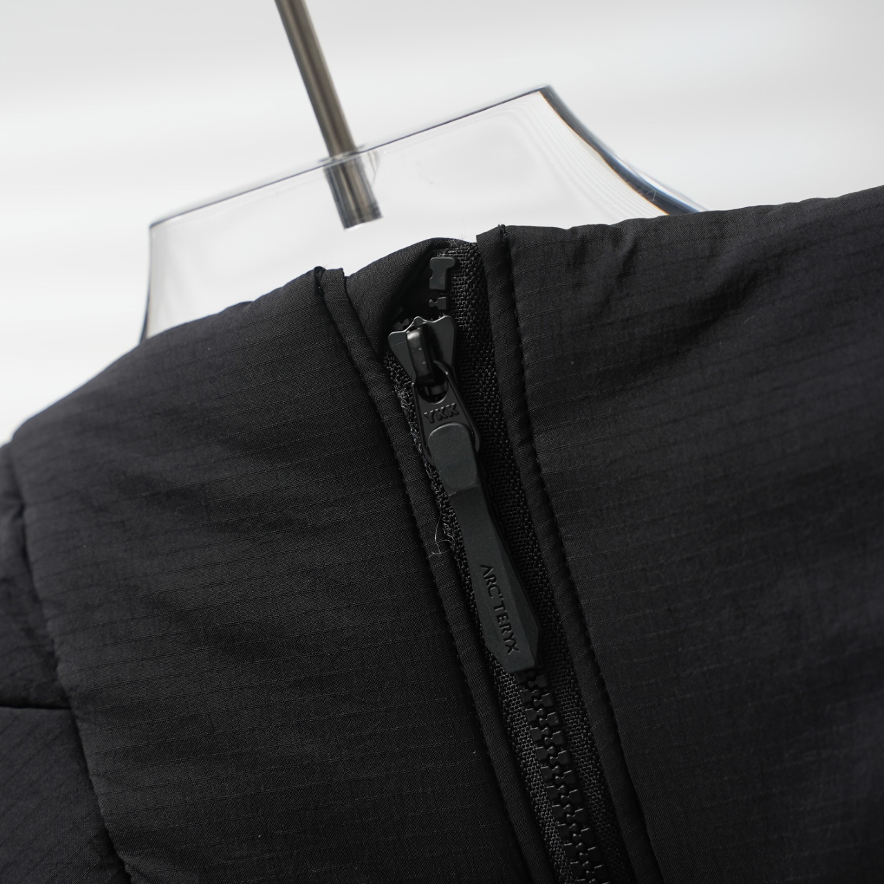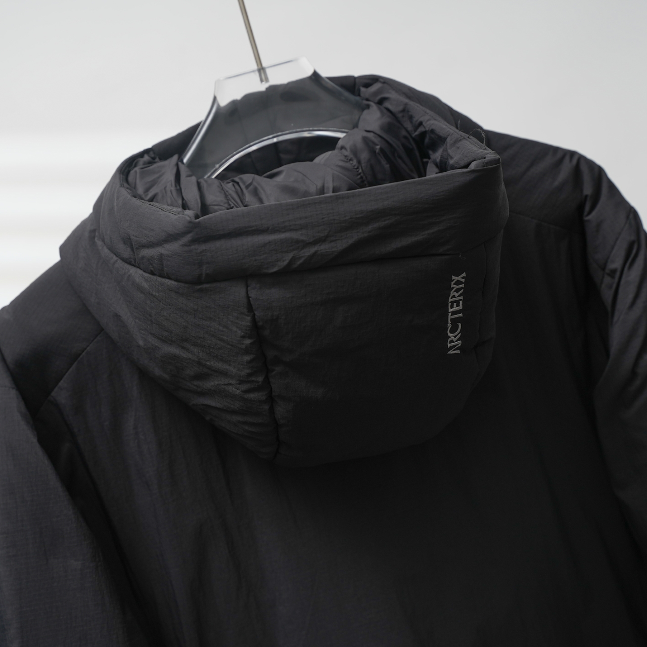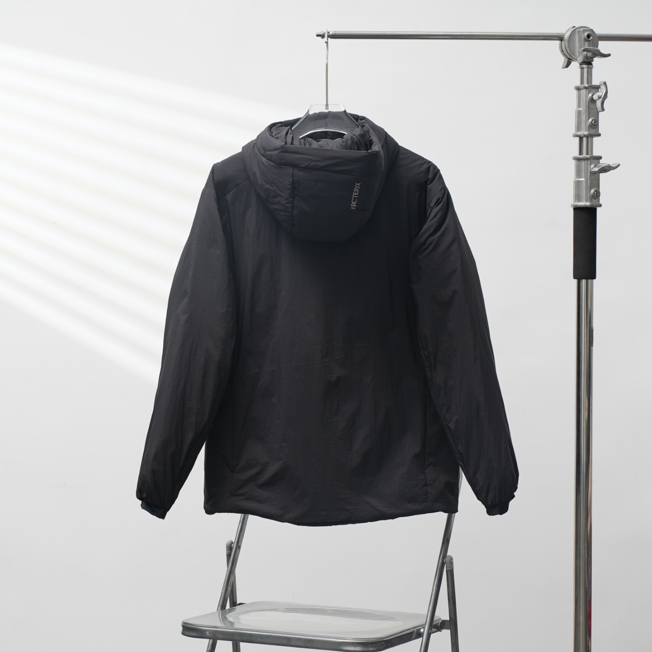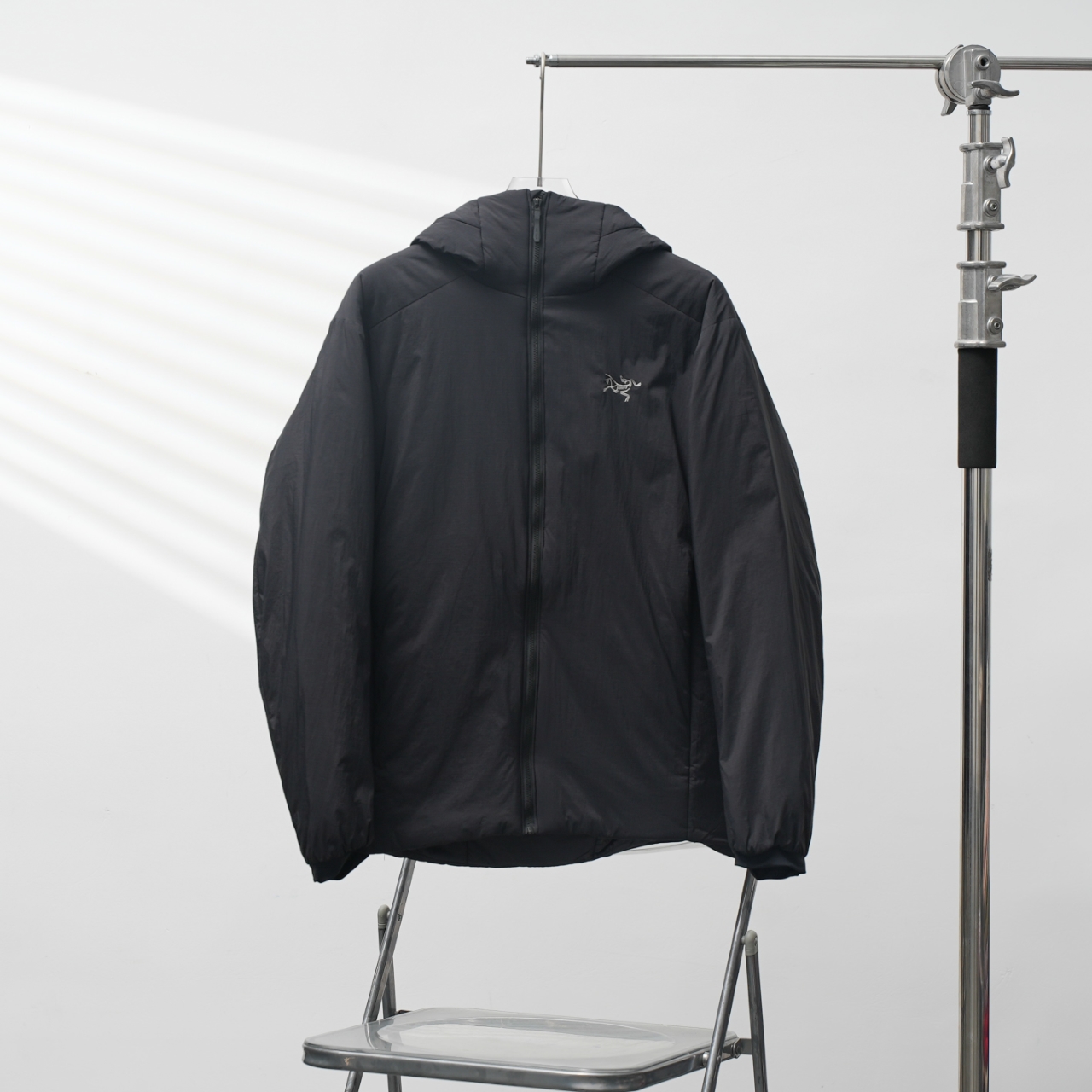 Factory direct Arc'teryx ATOM SV Coreloft hooded jacket in black, sizes S-2XL.