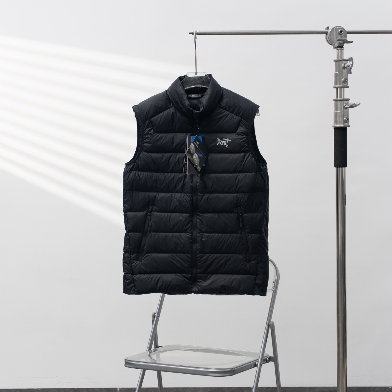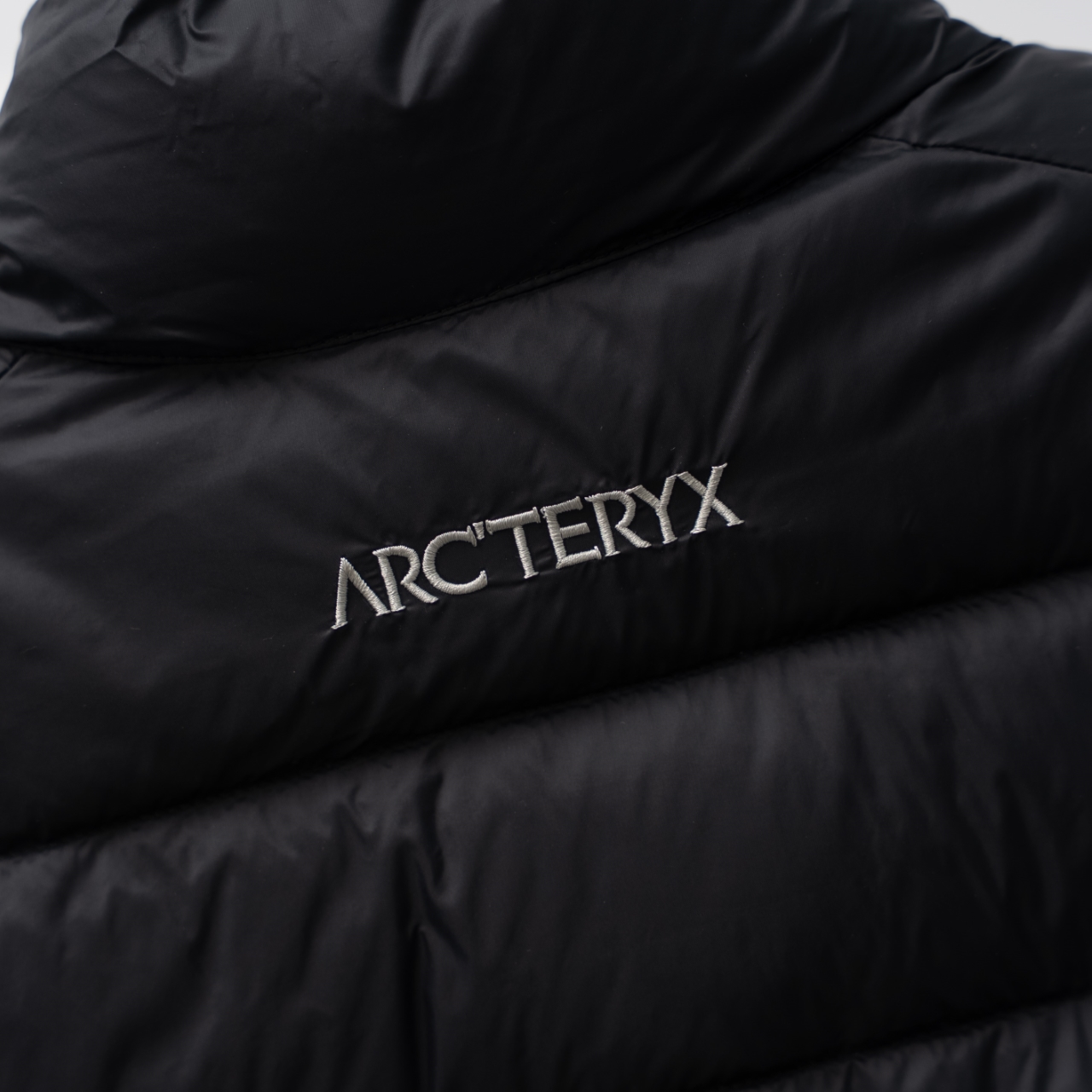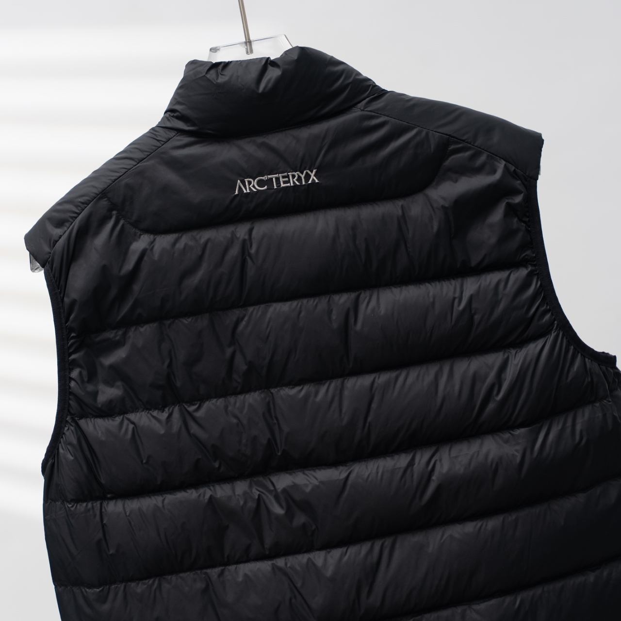 Factory direct ARC'TERYX down vest in black/silver, sizes S-XXL.