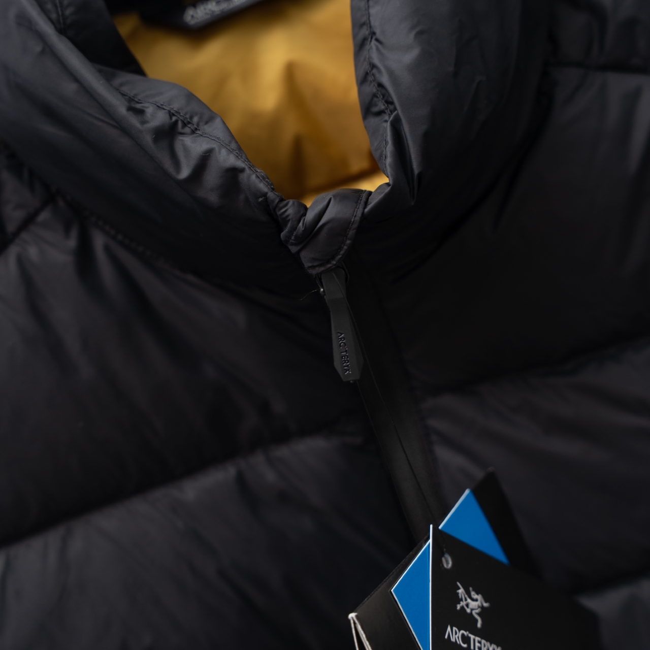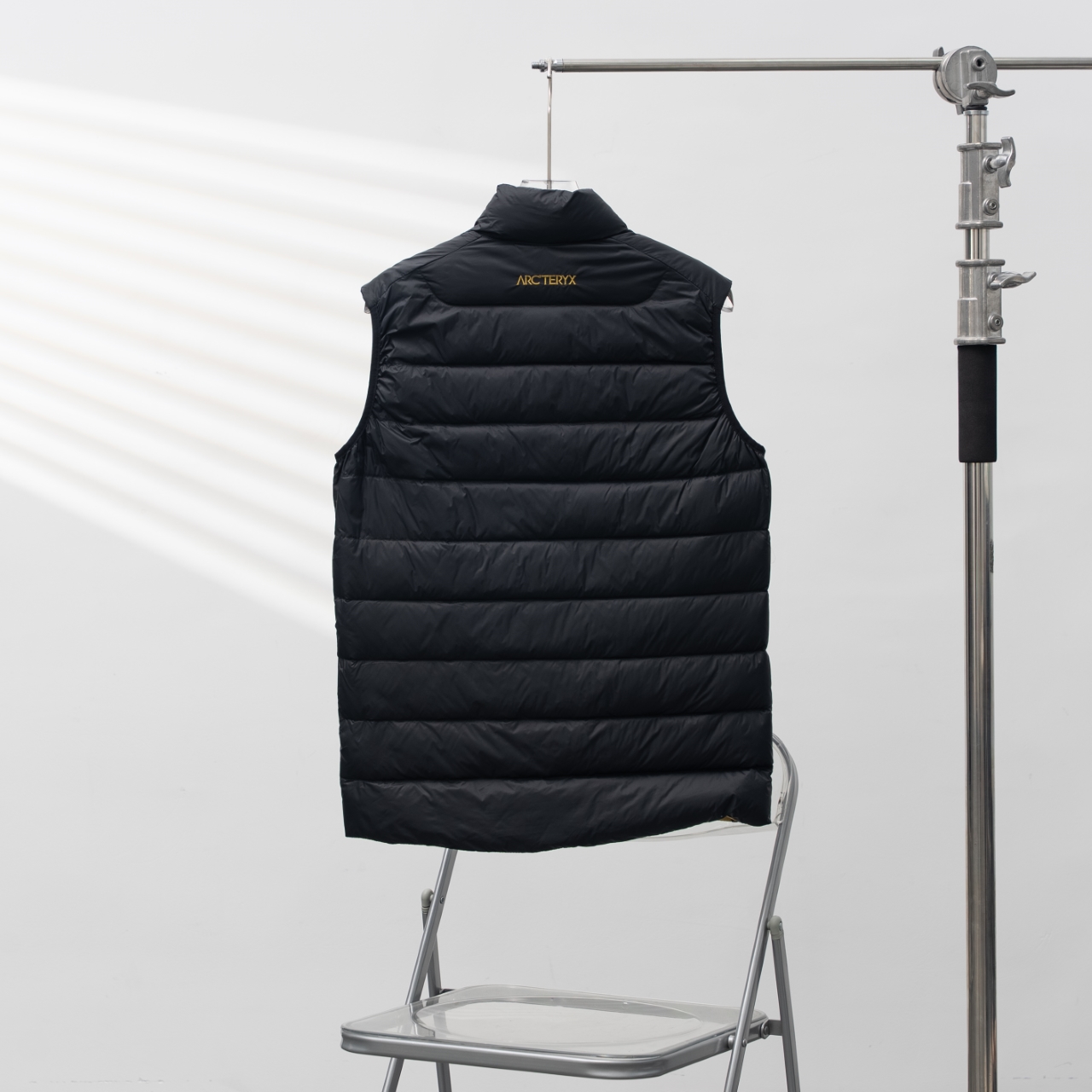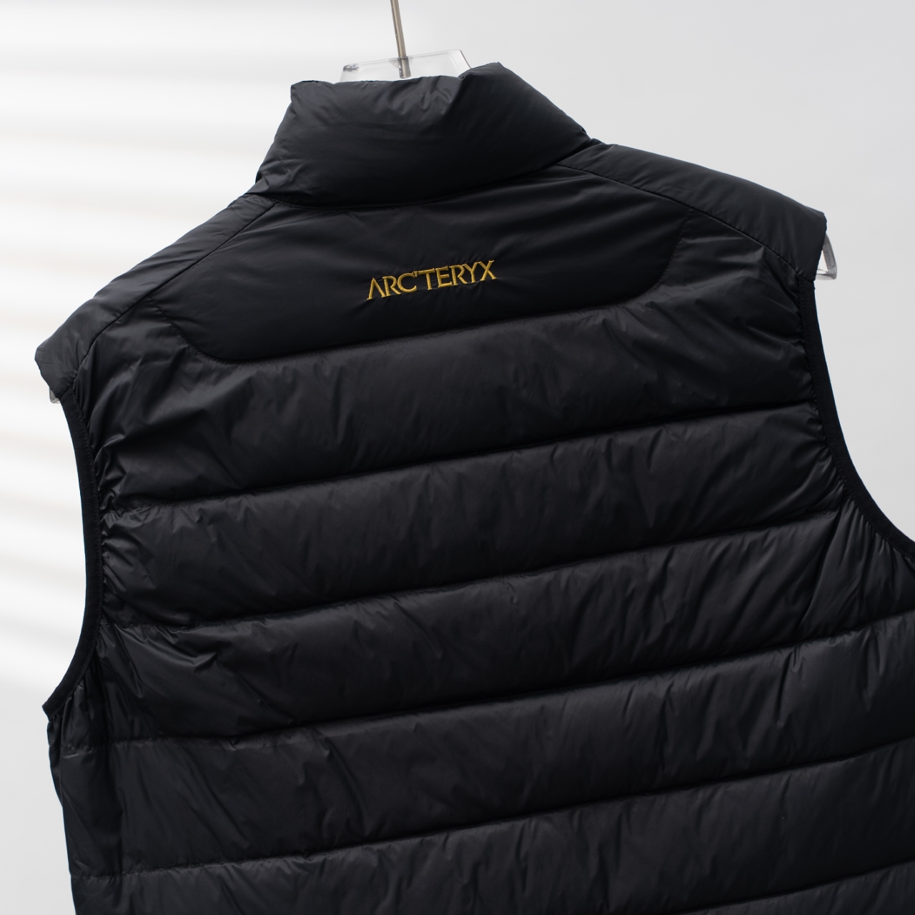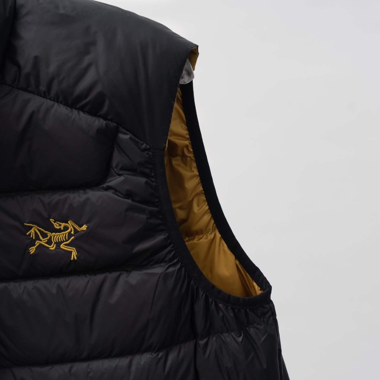 Factory direct ARC'TERYX down vest in black/gold, sizes S-XXL.