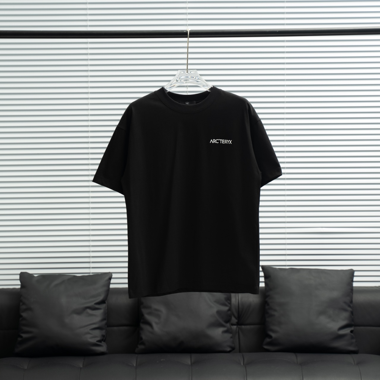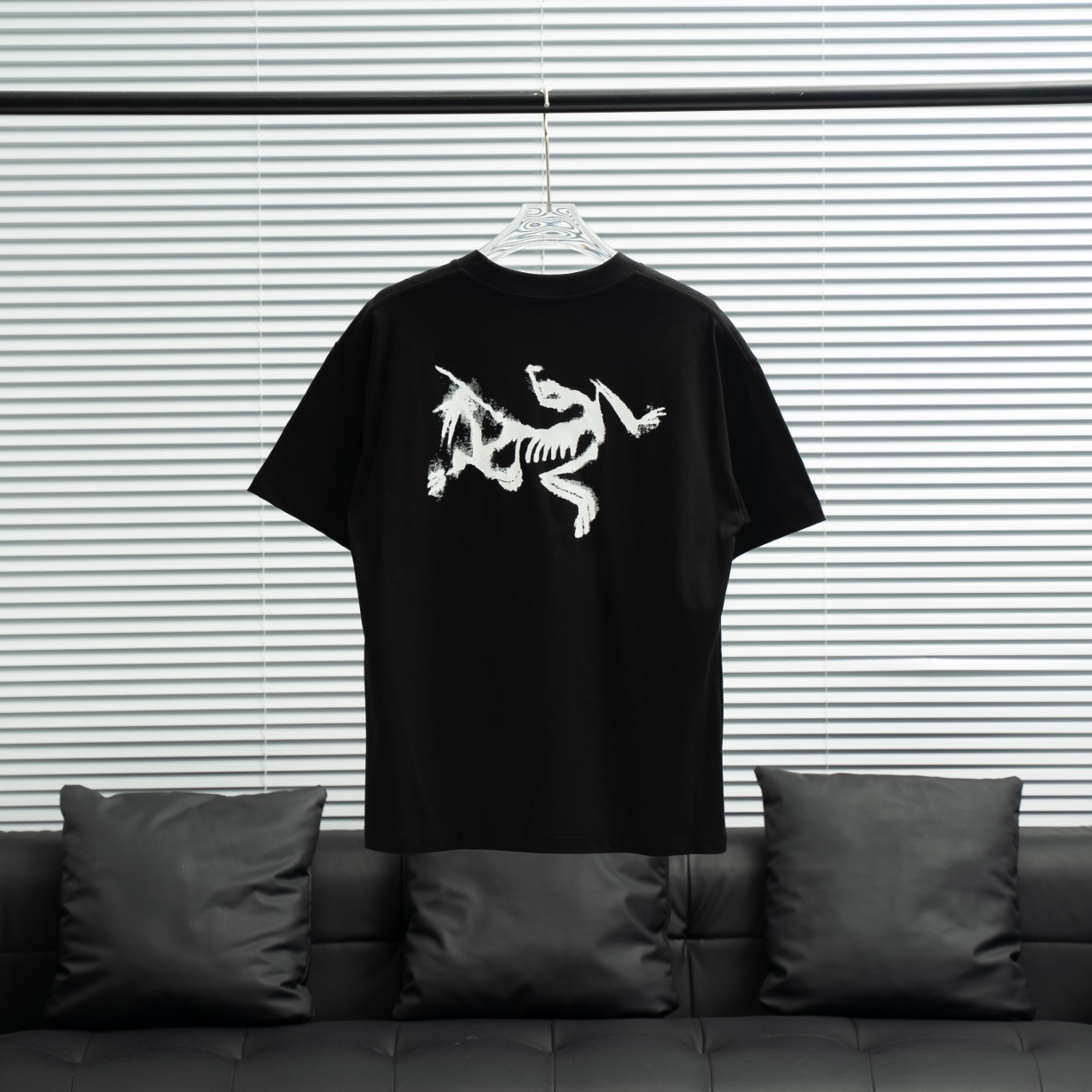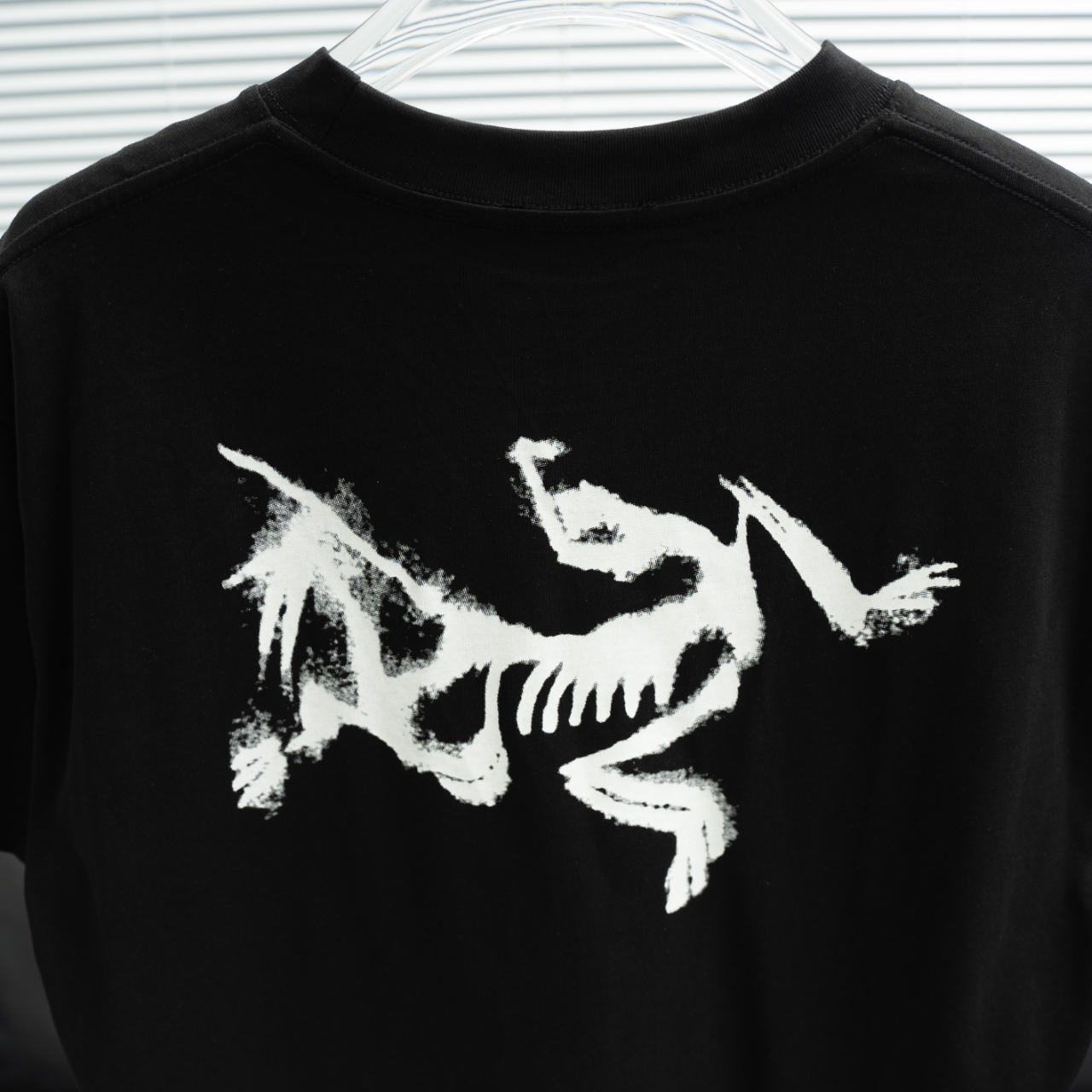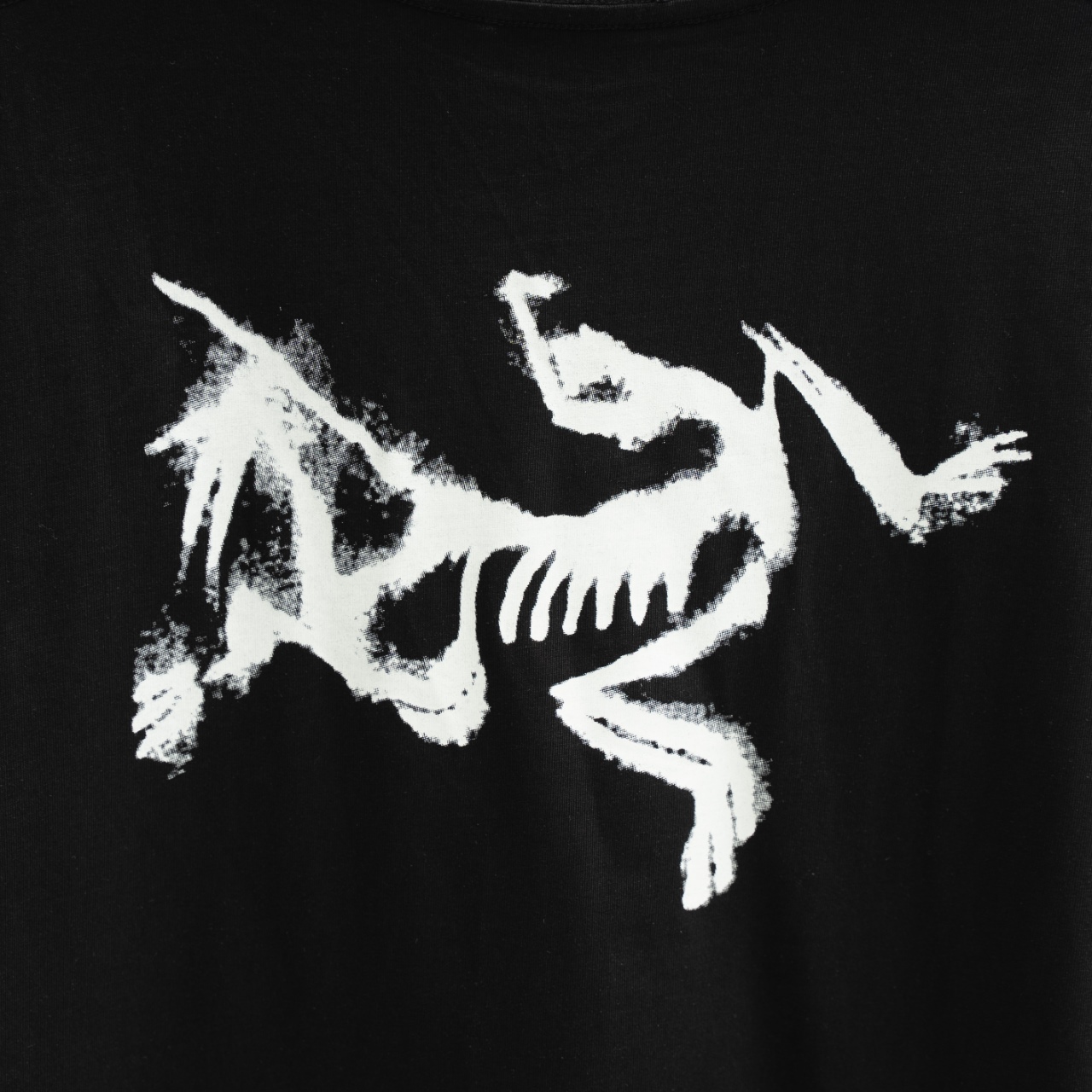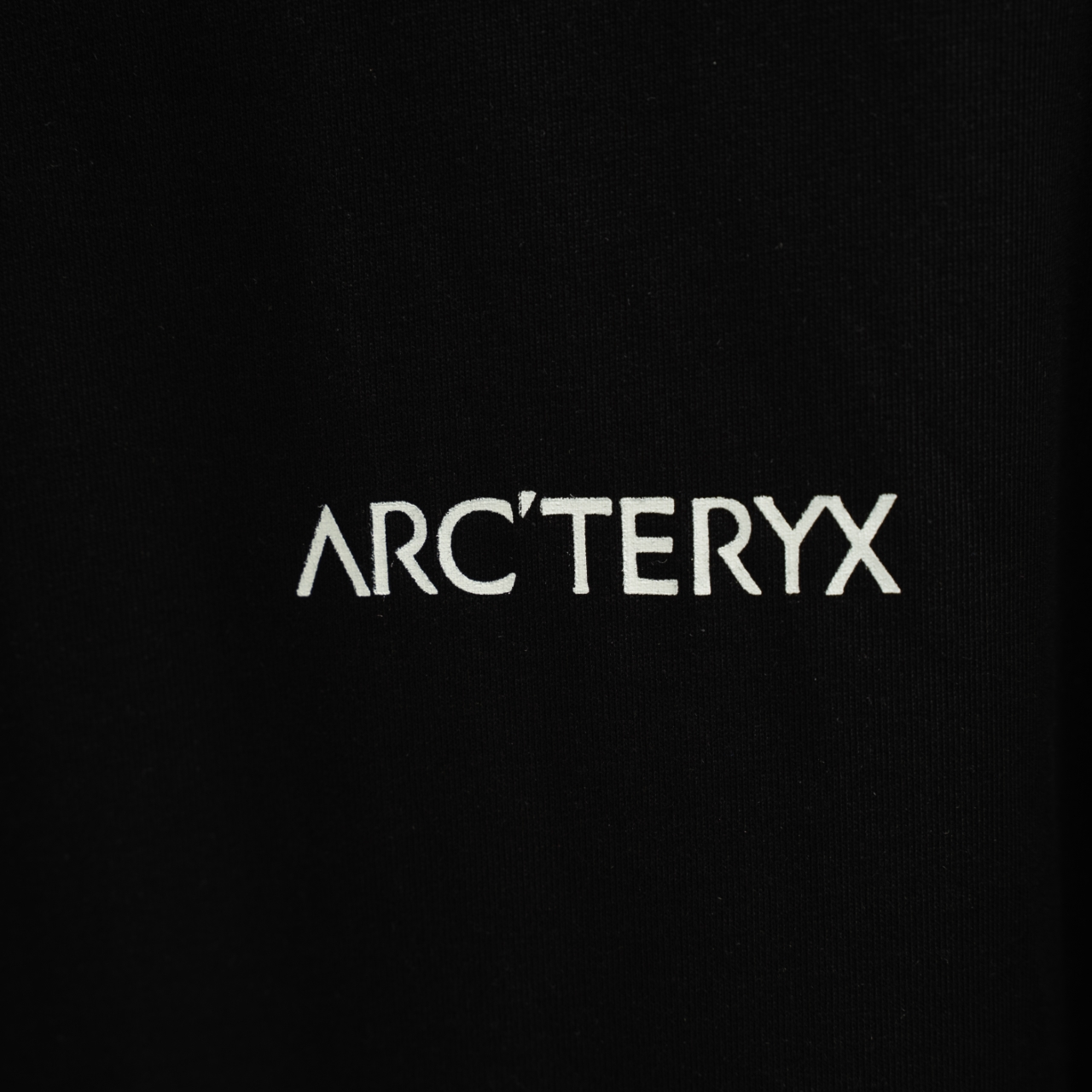 Factory direct Arc'teryx short sleeve T-shirt with graffiti logo. Sizes: S-XXL. Colors: Black, White.