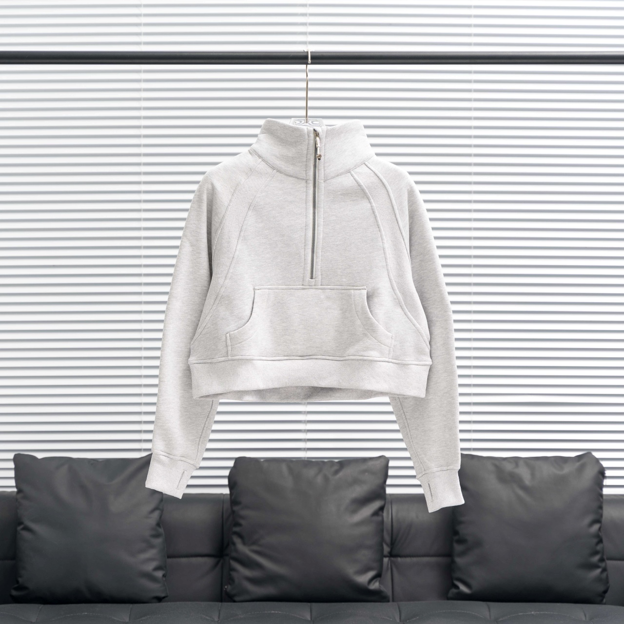 Lululemon half-zip hoodie. Colors: White, Grey, Sky Blue, Orange, Black. Sizes: XS-XL.