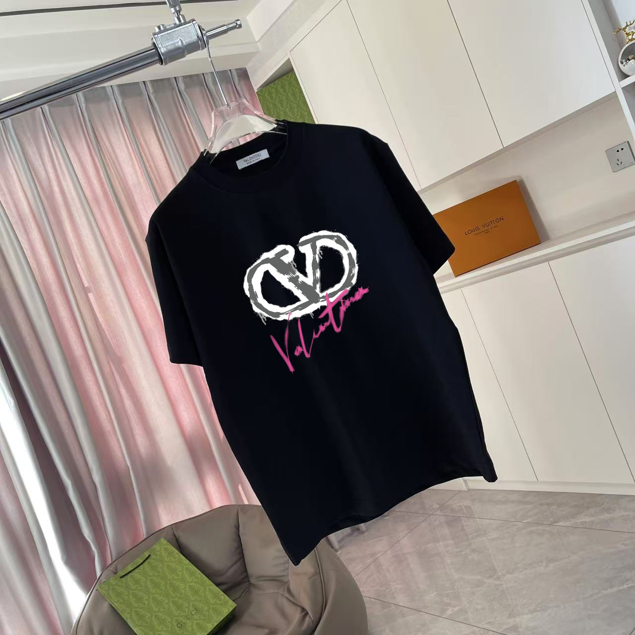 VALENTIN* Valentino 2025 Autumn New Style Personalized Letter Logo Print Custom Fabric 300g Short Sleeve T-shirt Unisex