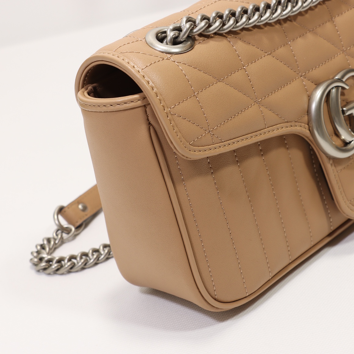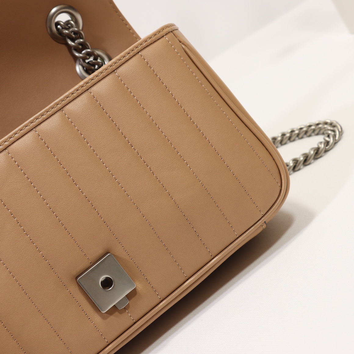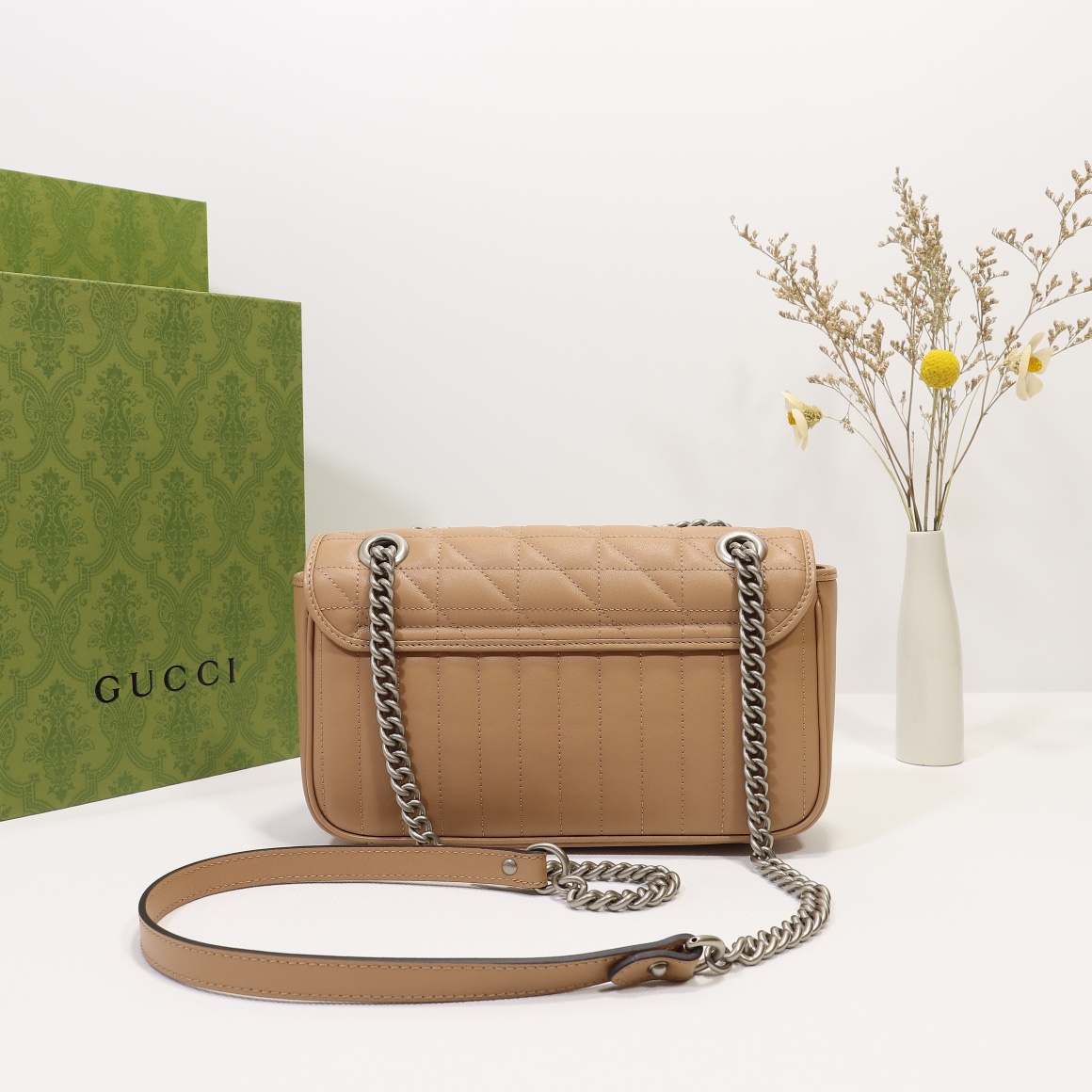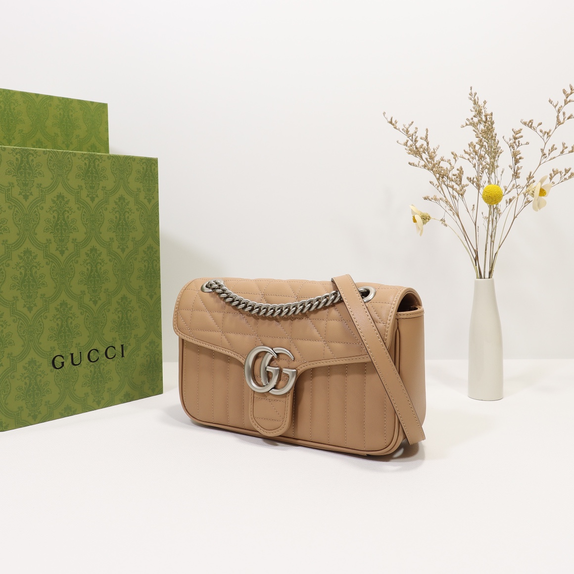 High-quality counter-grade, original factory leather, style number 443497 beige check. Size: width 26 x height 15 x side width 7. Ready stock available for shipment!