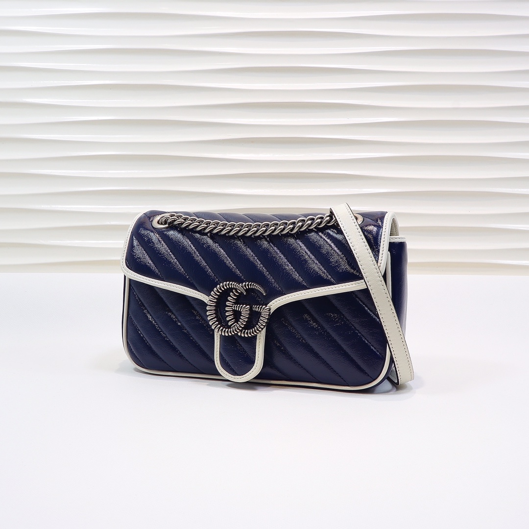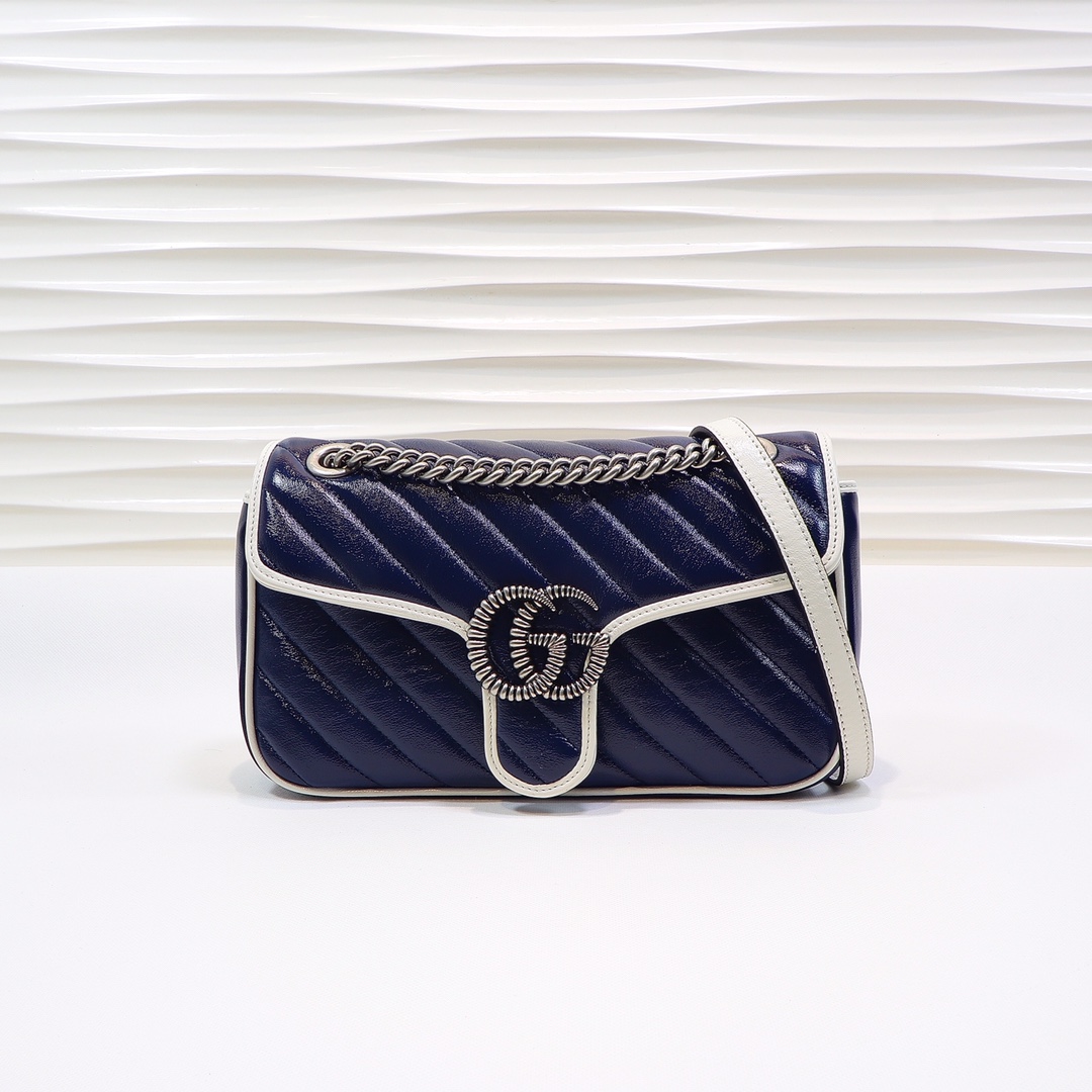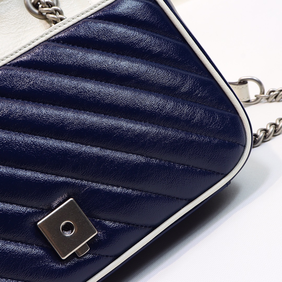 High-quality, genuine leather, style number 443497 blue and white. Dimensions: width 26 x height 15 x side width 7. Ready stock available!