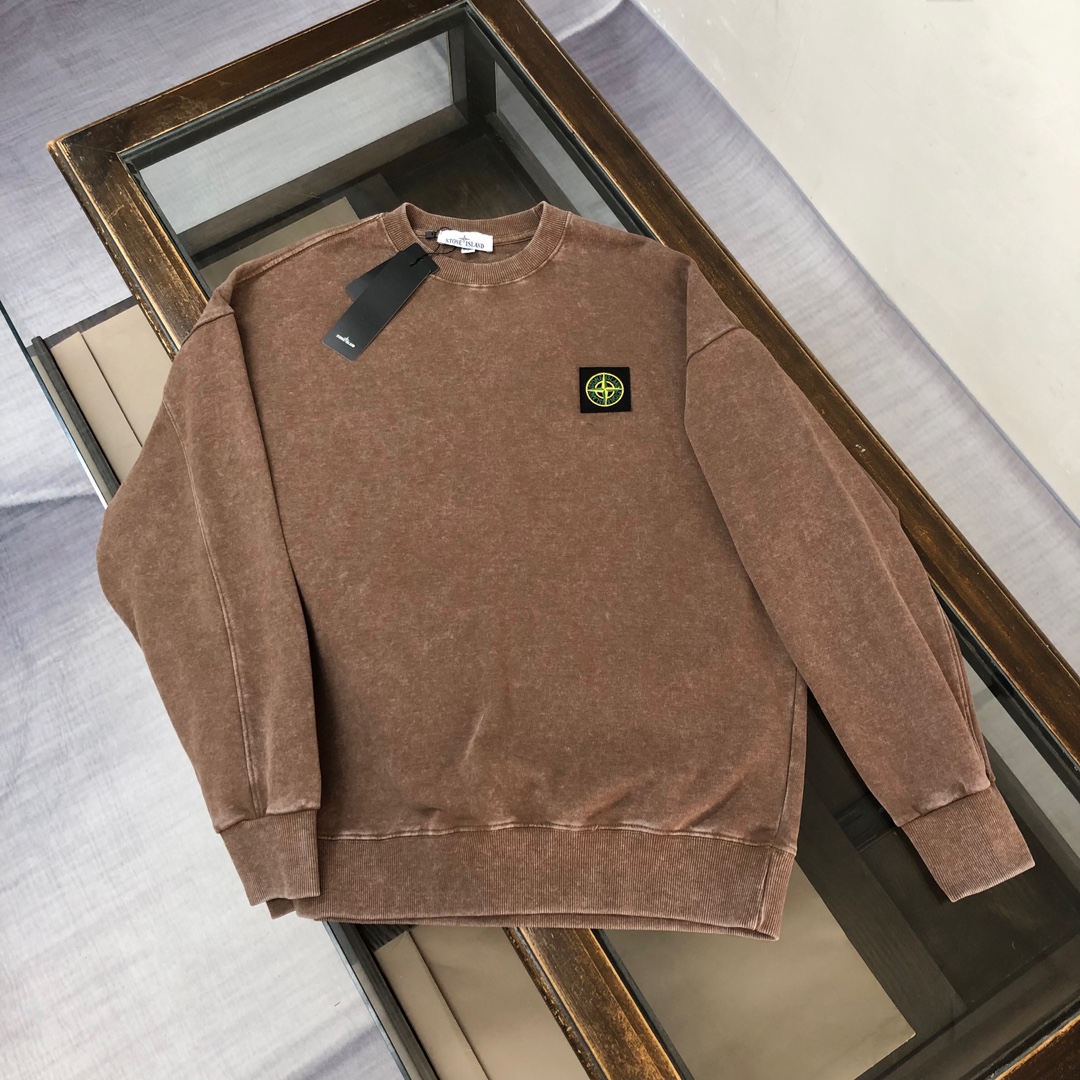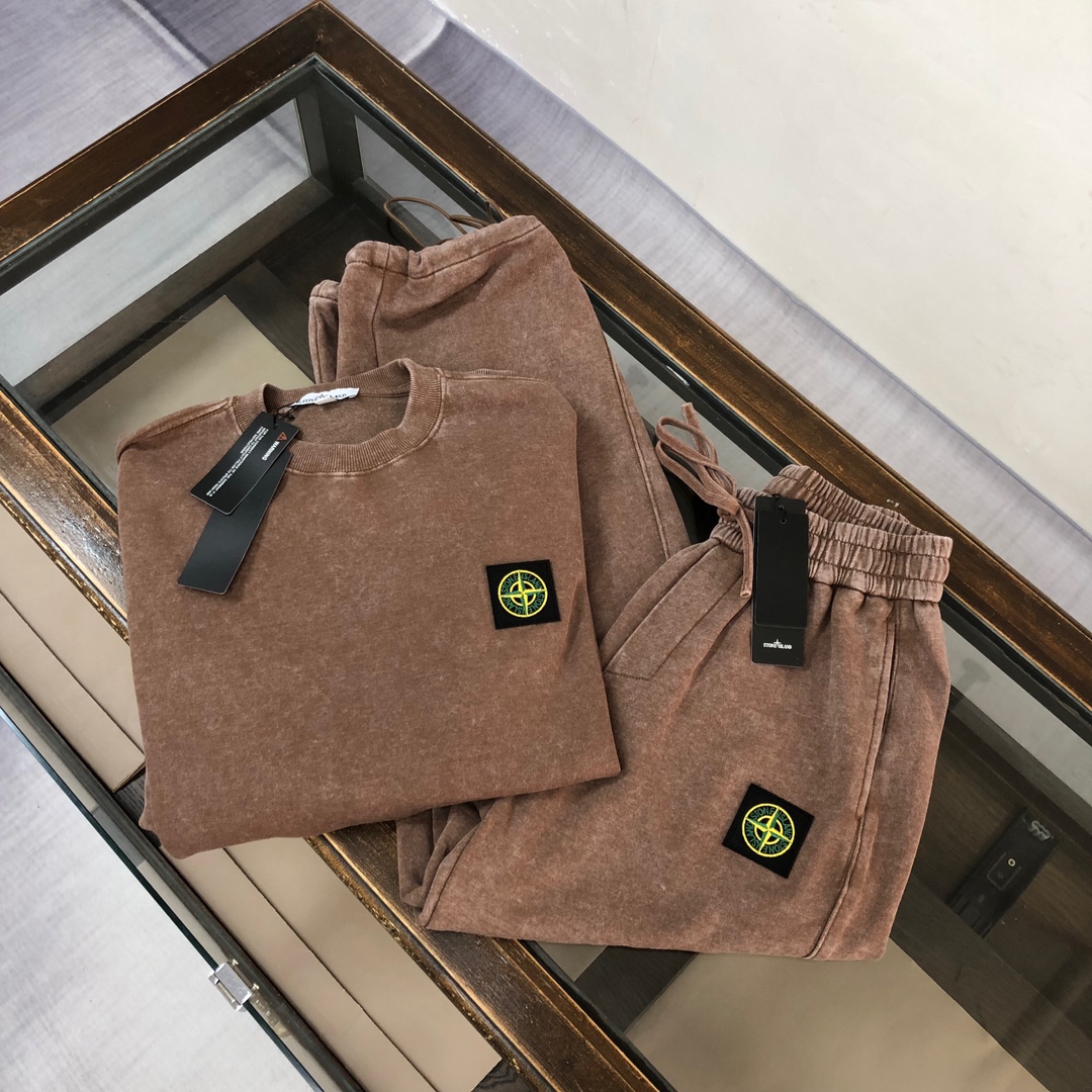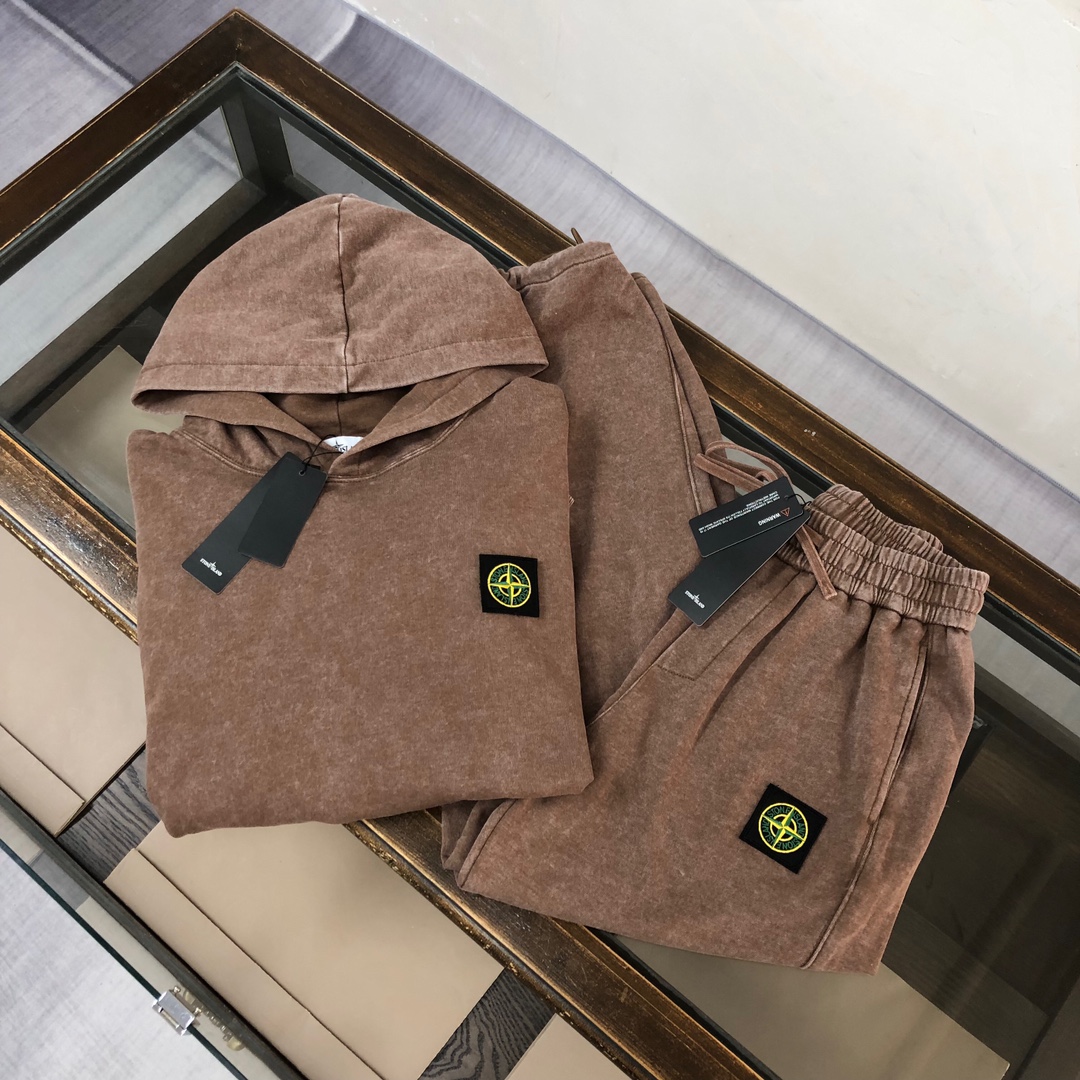 Stone Island 2025 early autumn couple's set with washed hoodie and straight-leg pants. Custom fabric, breathable, embroidered logo, vintage fade. Sizes S-XXL.