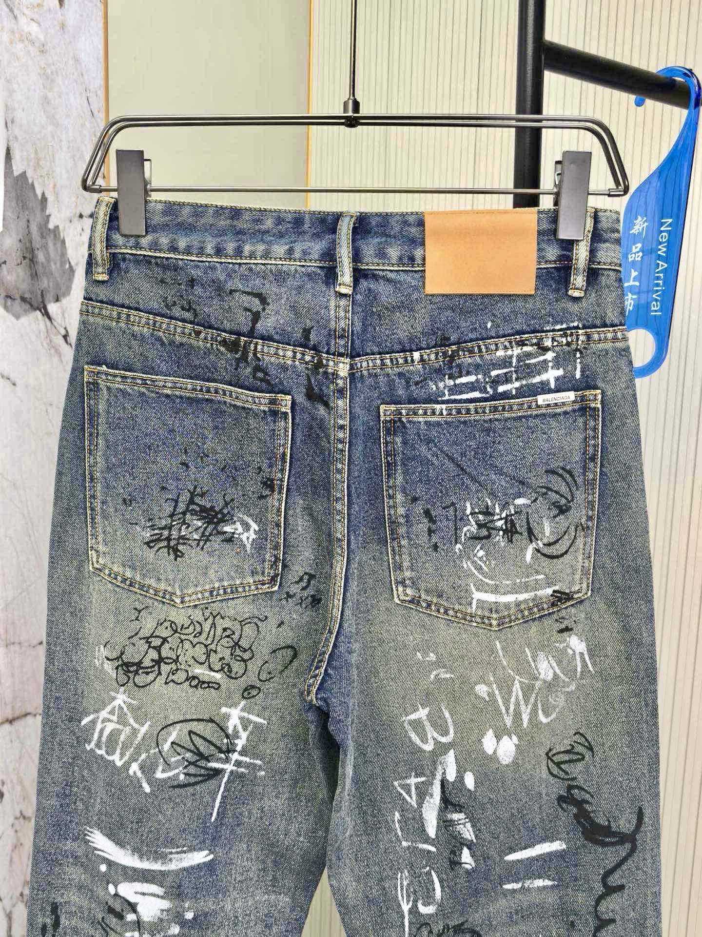 Balenciaga 2025 Fall/Winter embroidered men's jeans. Custom soft denim, distressed embroidery, top-tier craftsmanship. Sizes: 28-38 (no 35/37/39, 40 custom).