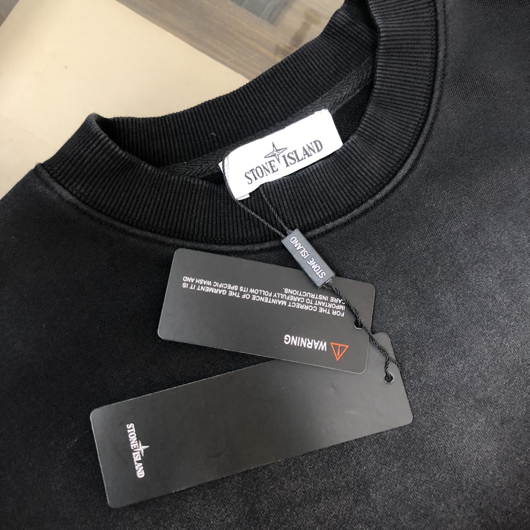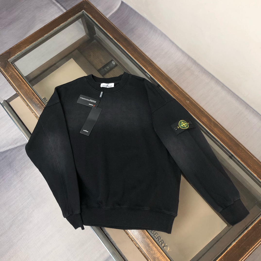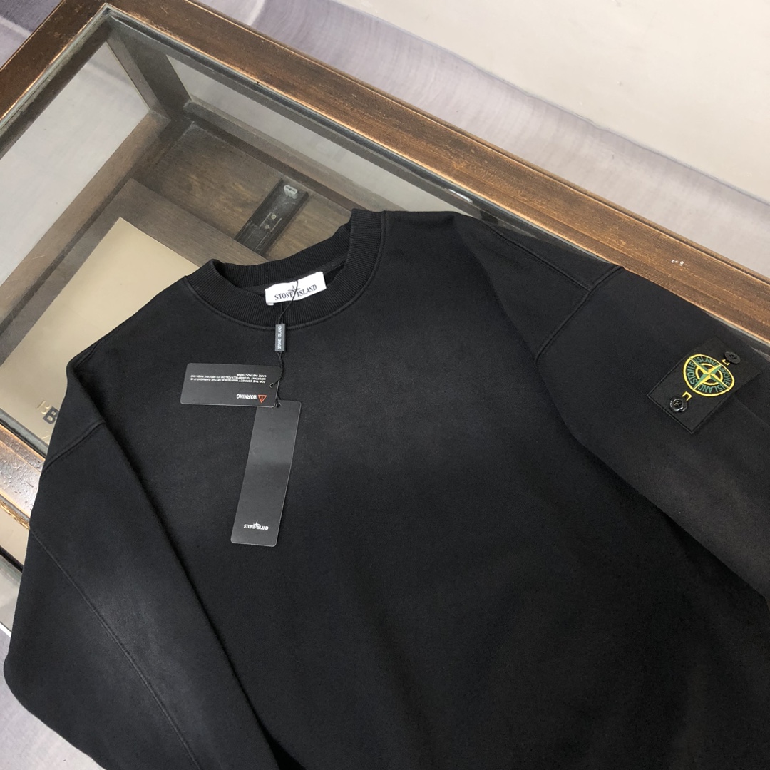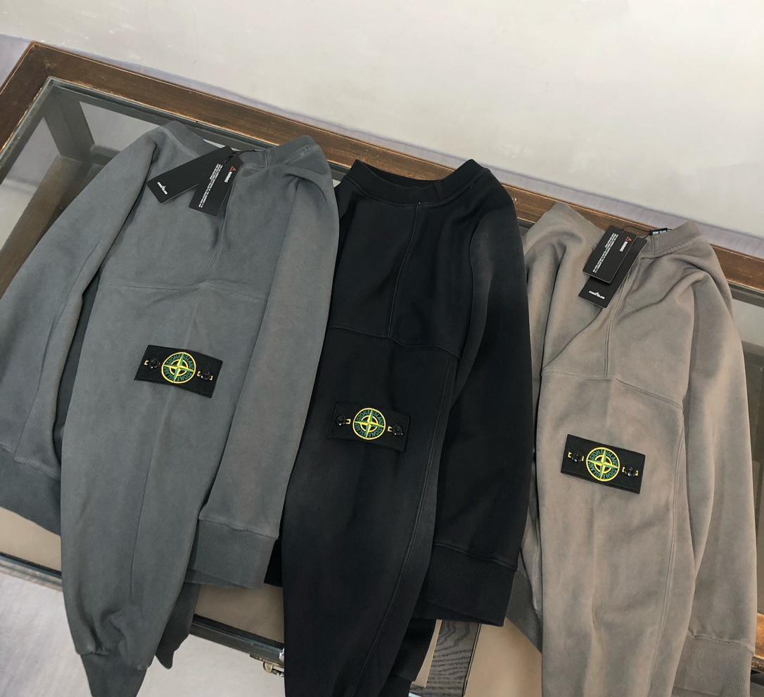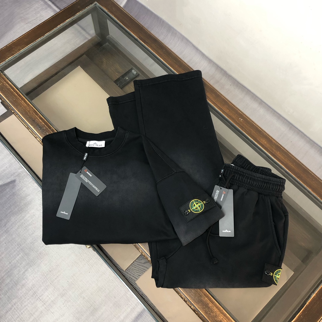 Stone Island 2025 early autumn couples washed cotton hoodie & straight-leg pants set. Custom 420g fabric, relaxed fit. Sizes: S,M,L,XL.