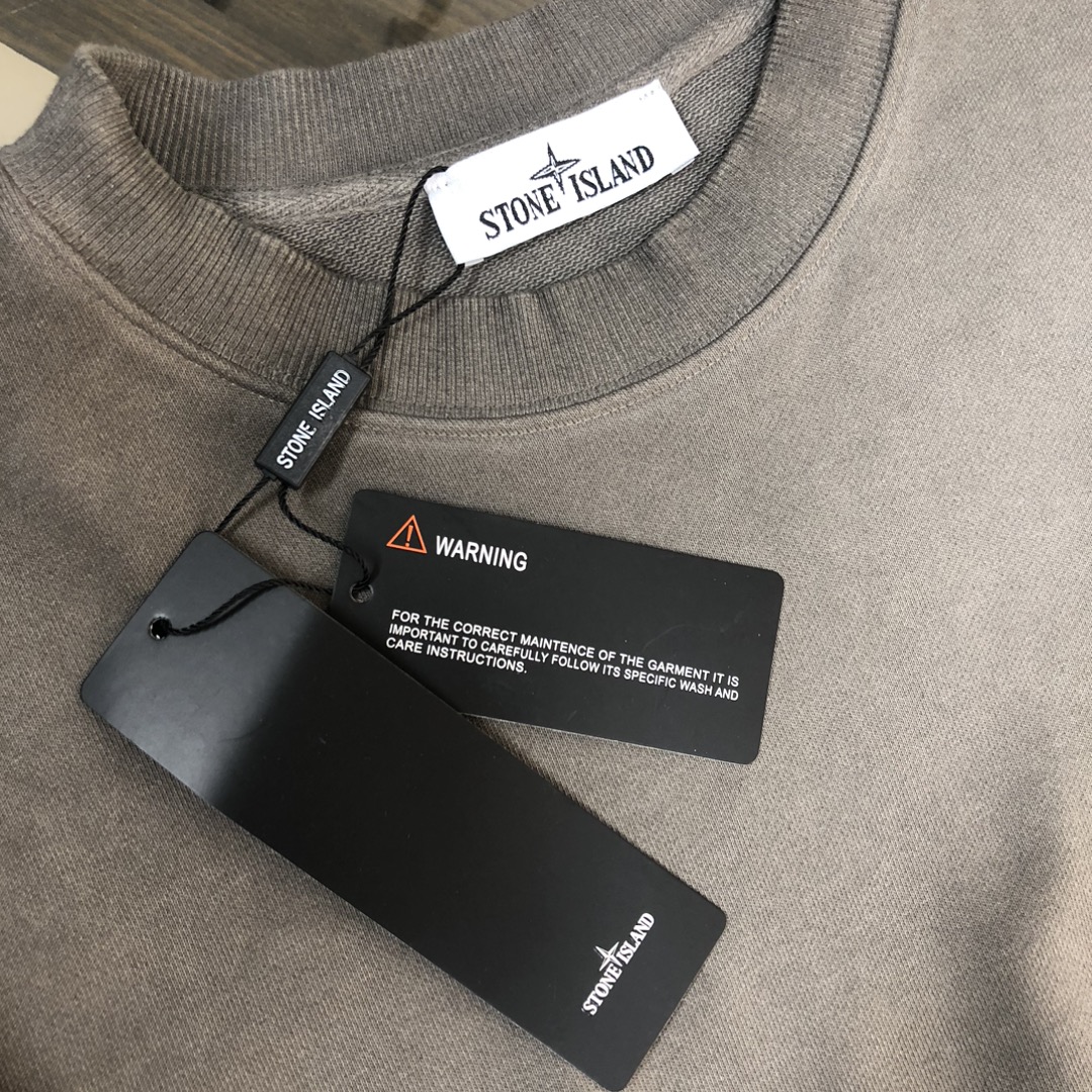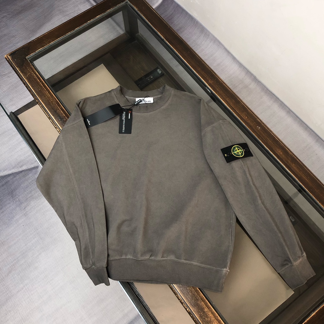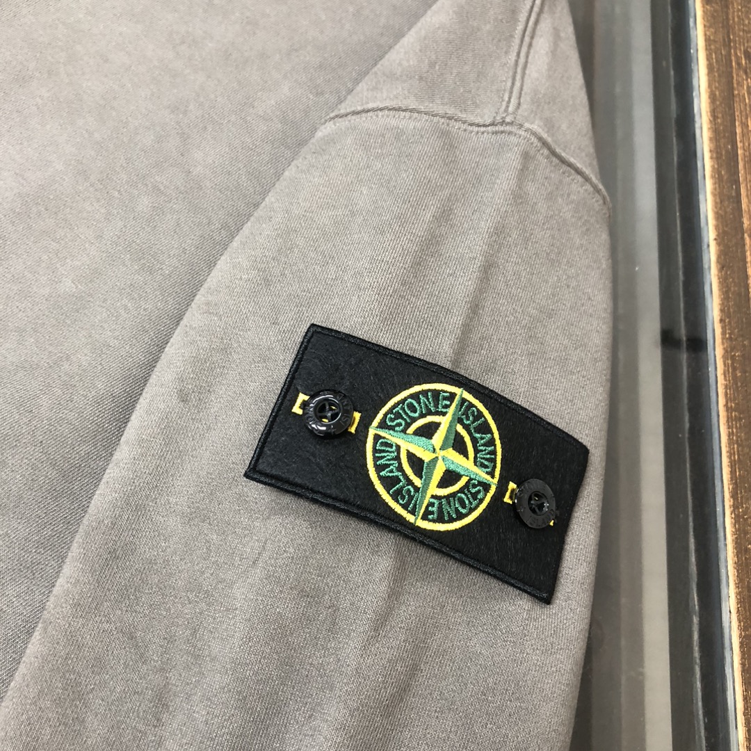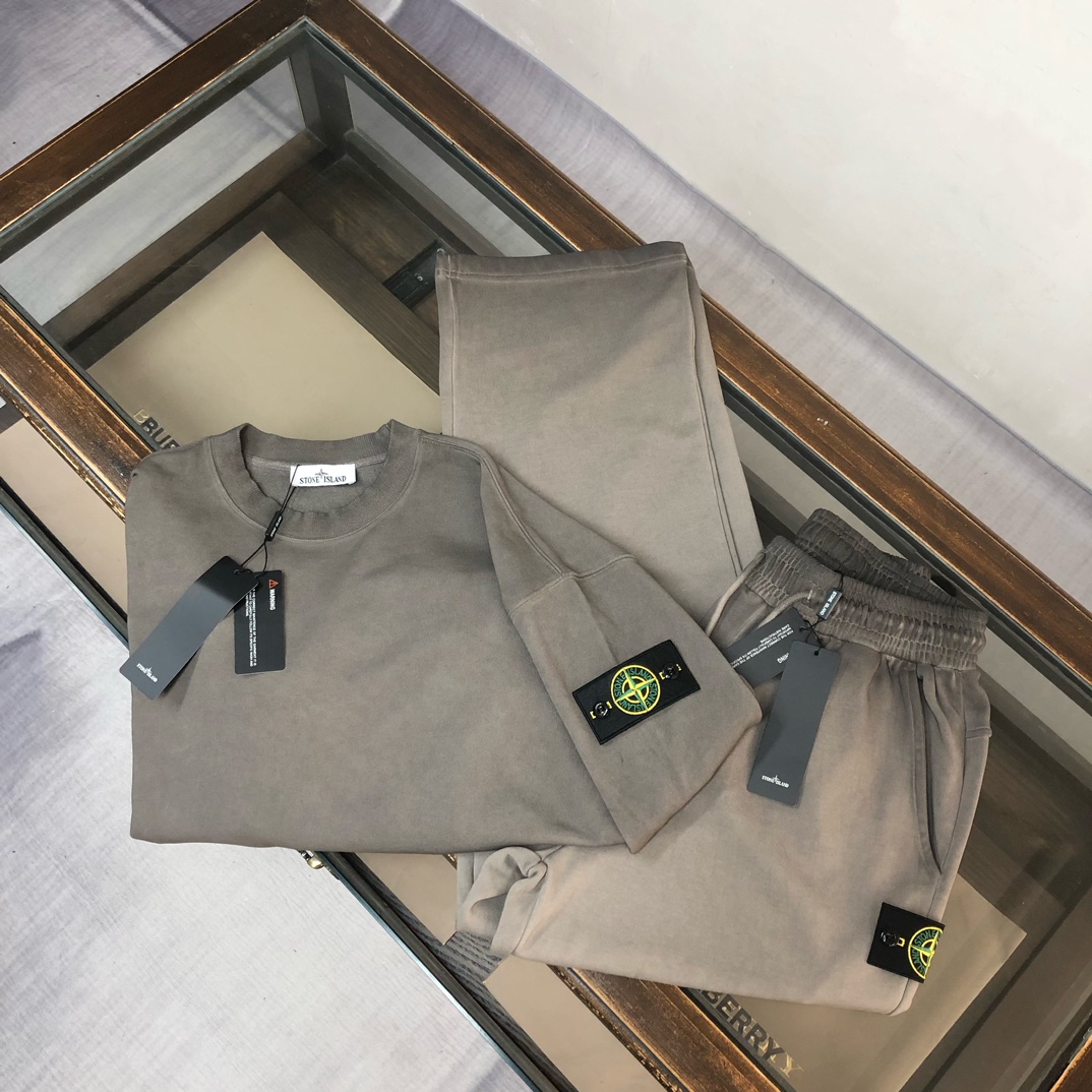 Stone Island 2025 early autumn couples set, heavyweight washed cotton hoodie and straight-leg pants. Custom 420g fabric, relaxed fit. Sizes S M L XL.
