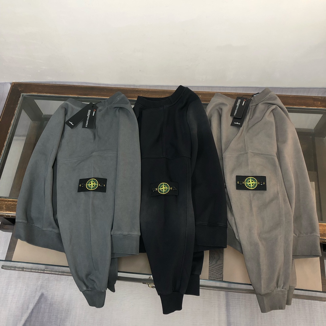 Stone Island 2025 early autumn couples washed cotton hoodie & straight-leg pants set. Custom 420g fabric, relaxed fit. Sizes S/M/L/XL.
