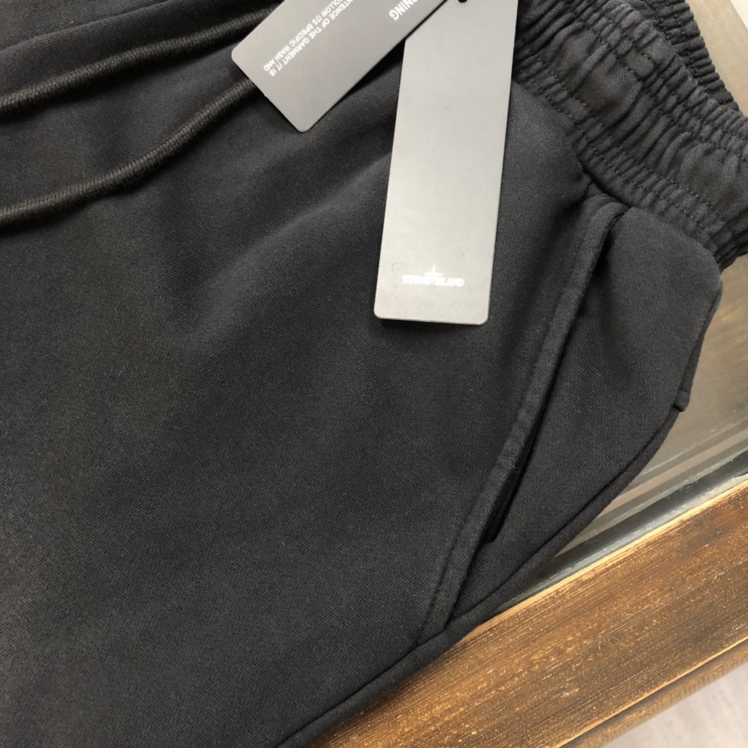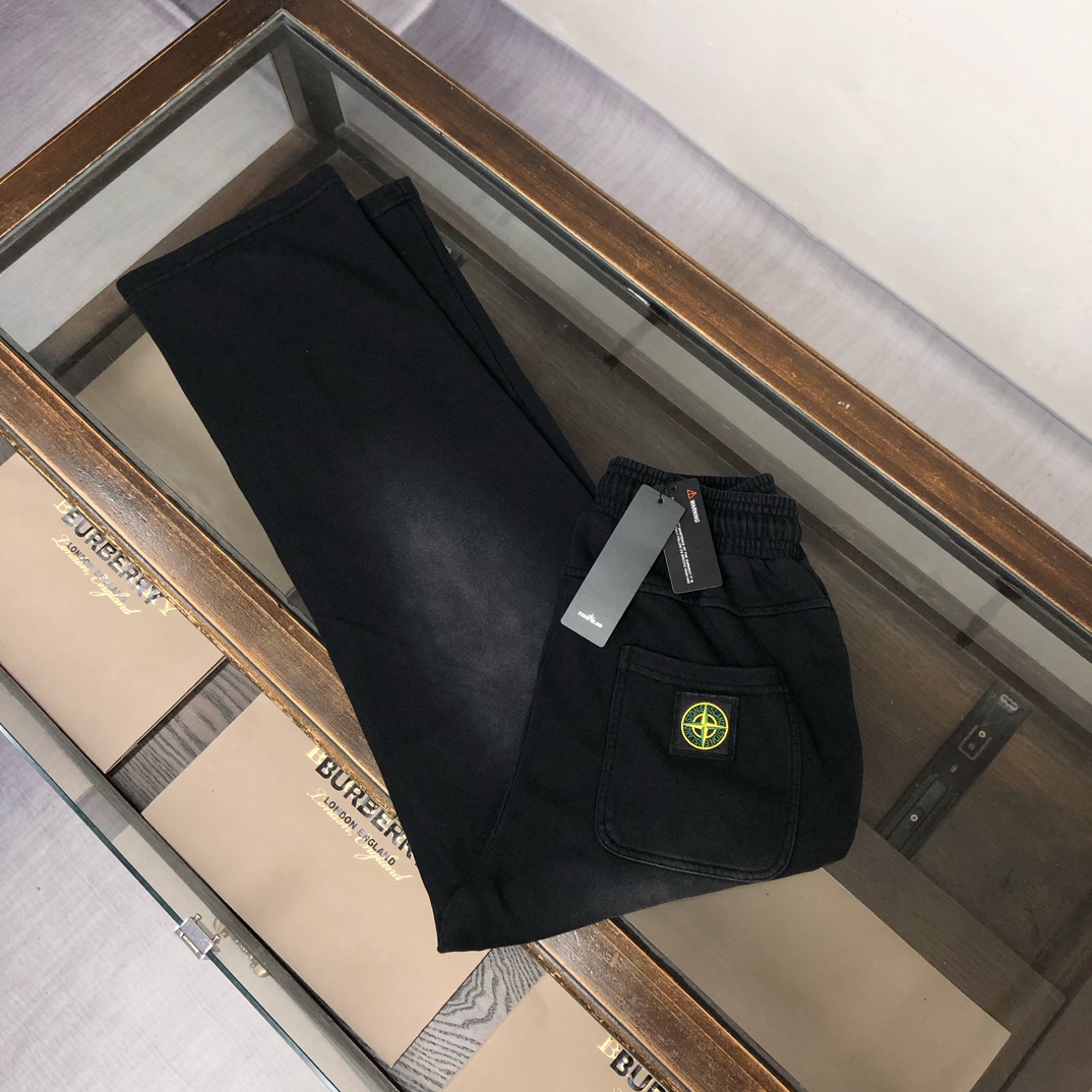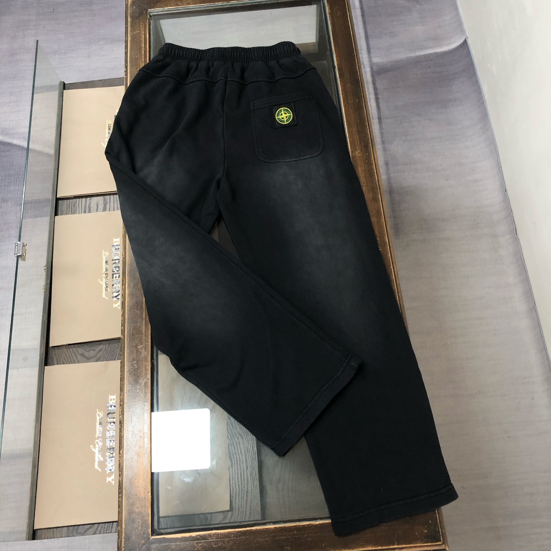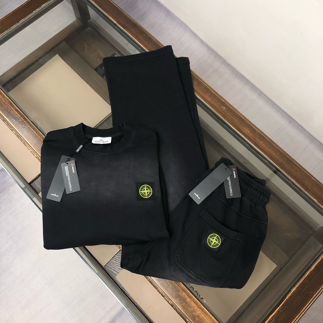 Stone Island 2025 early autumn couples washed cotton hoodie & straight-leg pants set. Custom 420g fabric, relaxed fit. Sizes S/M/L/XL.