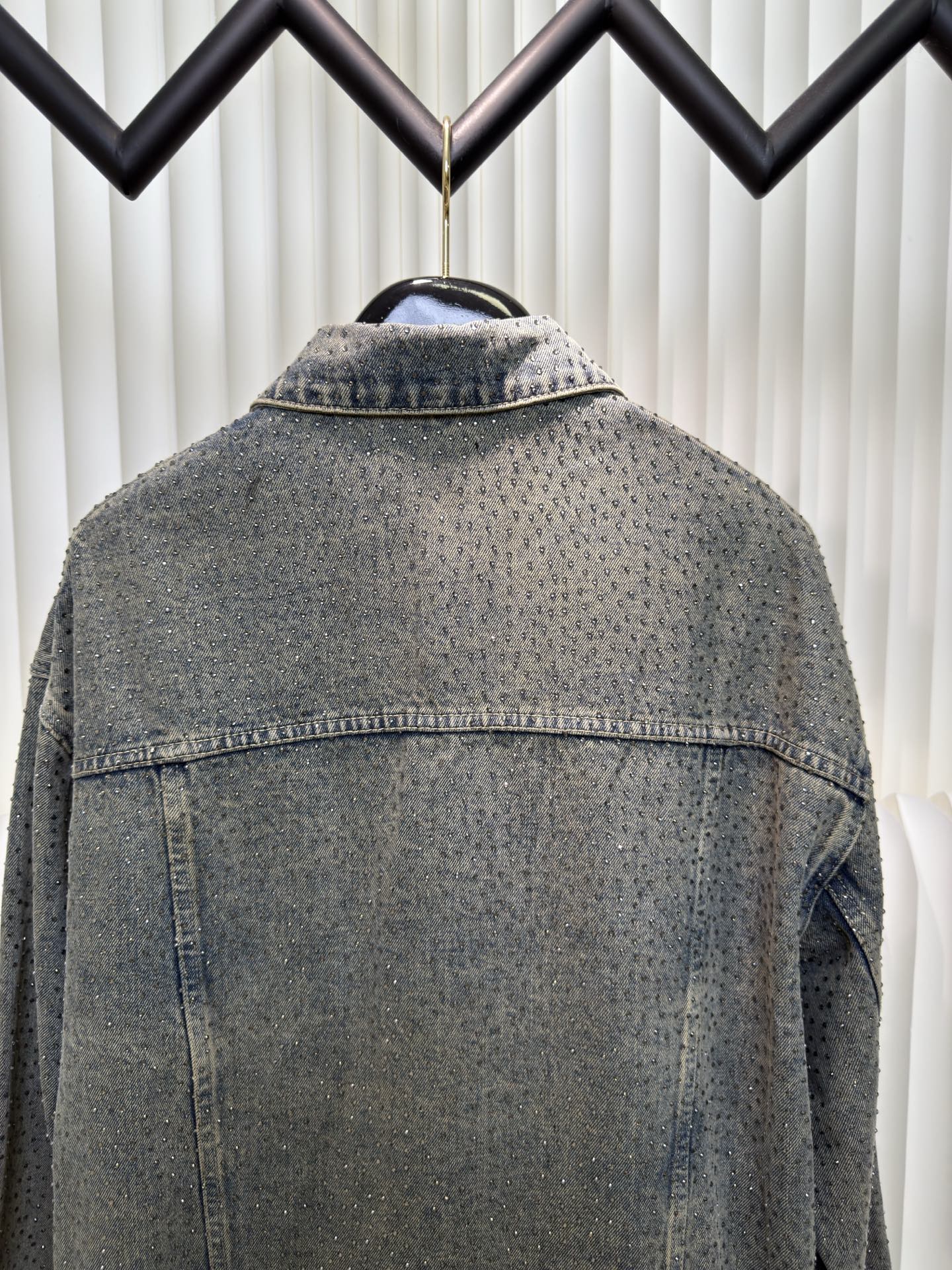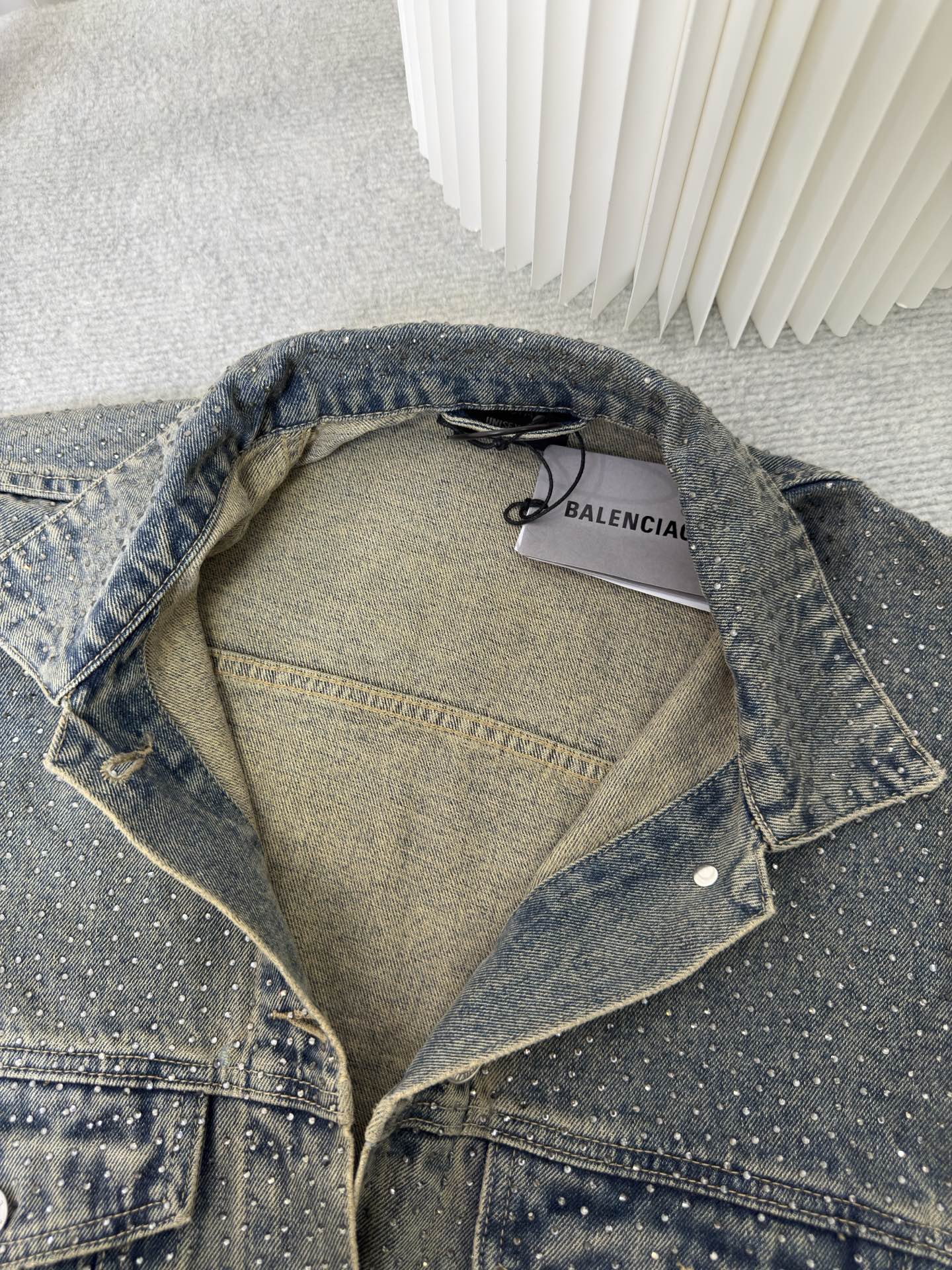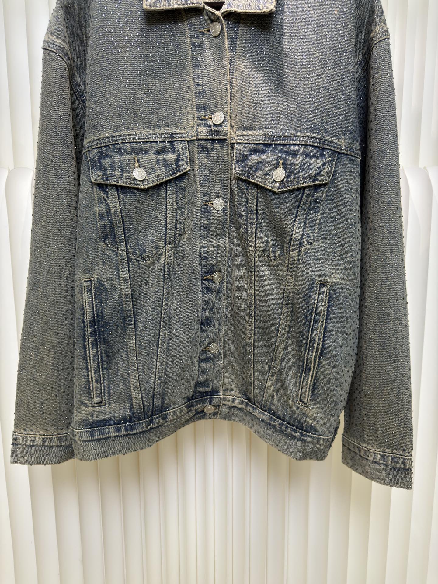 Balenciaga BLCG Paris fully rhinestone vintage denim jacket. 7x7 twill denim cotton, 420g after washing. Full 3D rhinestone pressing. Mud wash salt stir process. Sizes S M L XL.