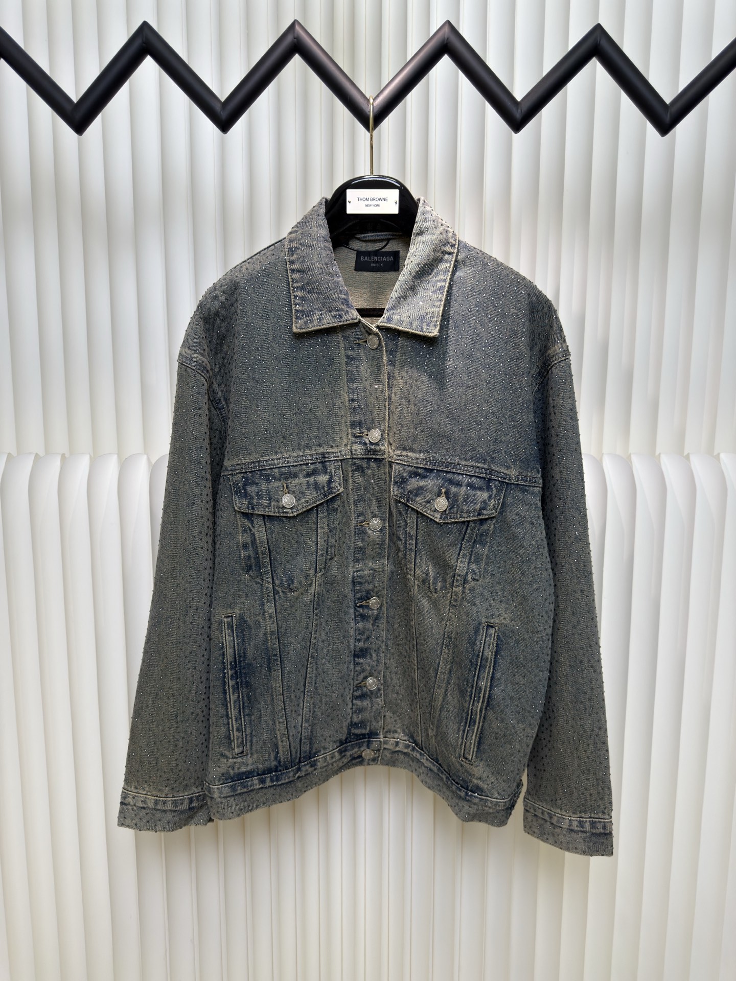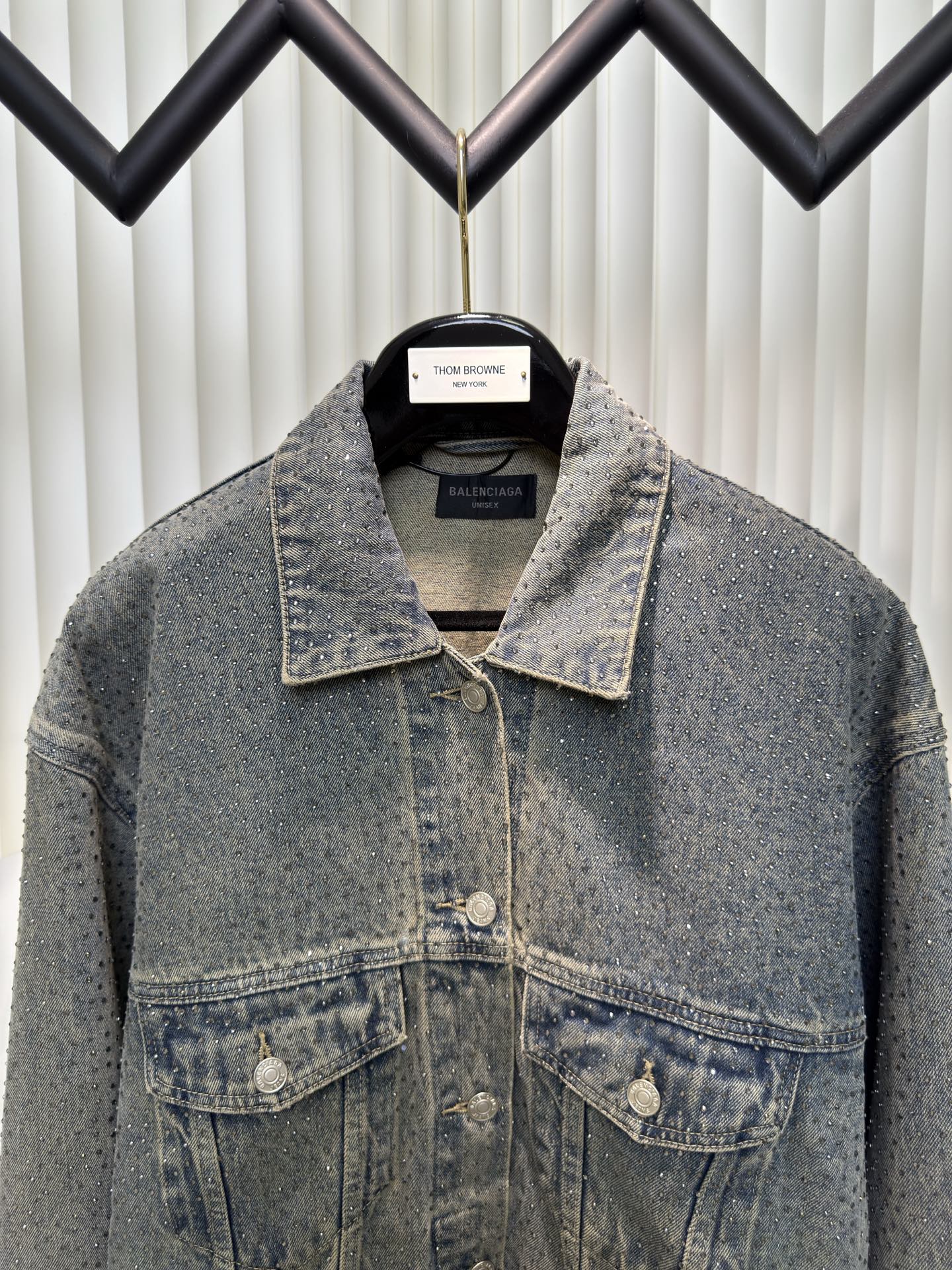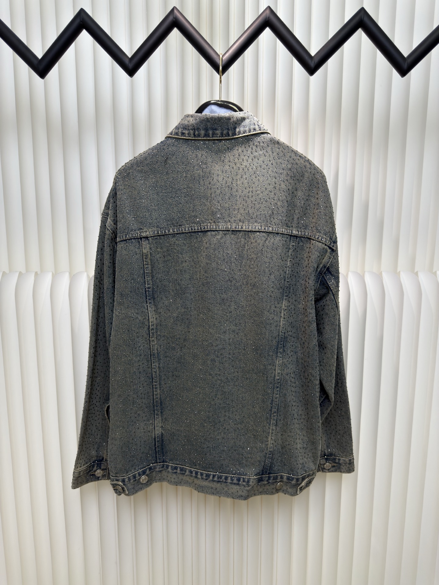 Balenciaga BLCG Paris fully rhinestone vintage denim jacket. 7x7 twill denim cotton, 420g after washing. Full 3D rhinestone pressing. Mud wash salt stir process. Sizes S M L XL.