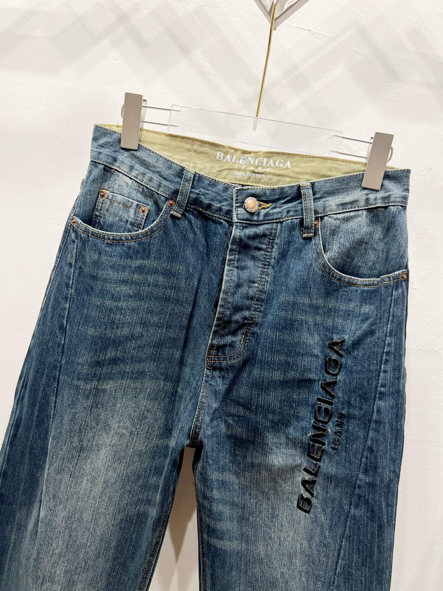 Balenciaga 2025 distressed bamboo embroidery black letter couples relaxed fit washed jeans. High-quality version, universal flattering wide-leg cut. Stiff yet soft fabric, premium wash. Dark blue, sizes 30-36.