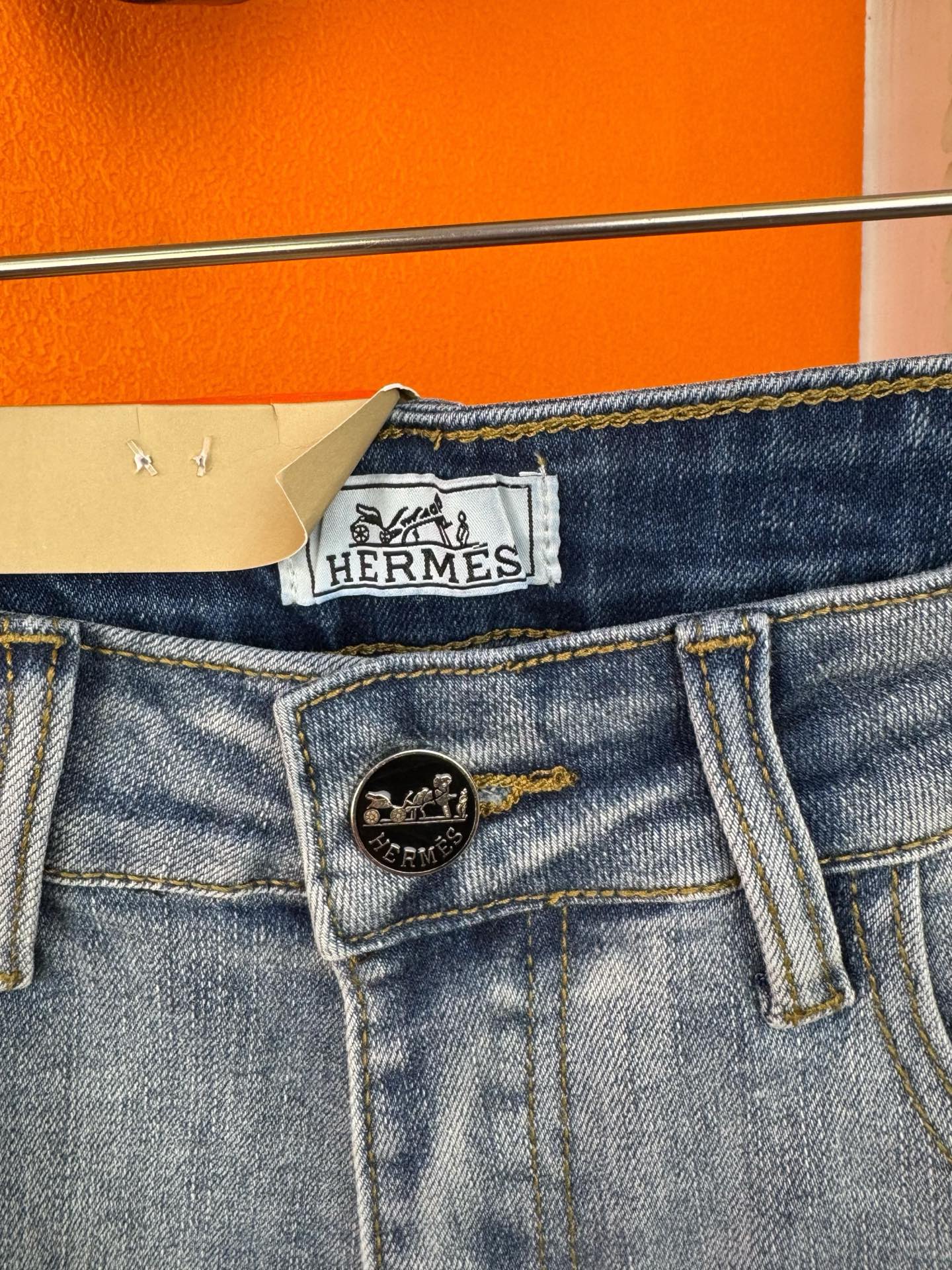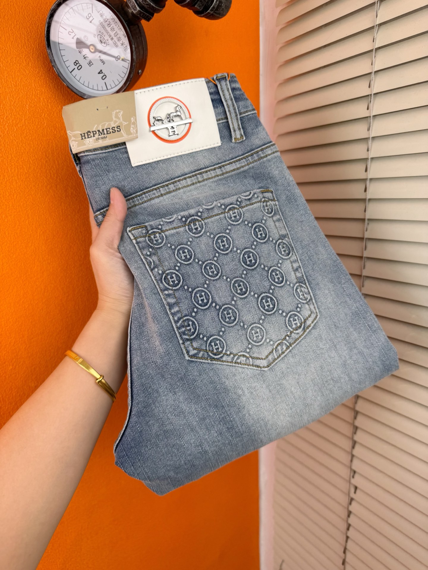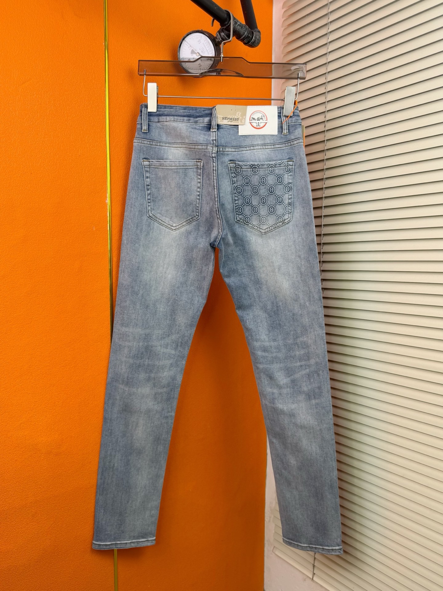 Hermès men's jeans in classic blue stretch cotton. Slim fit, easy to match. Sizes 29-40.