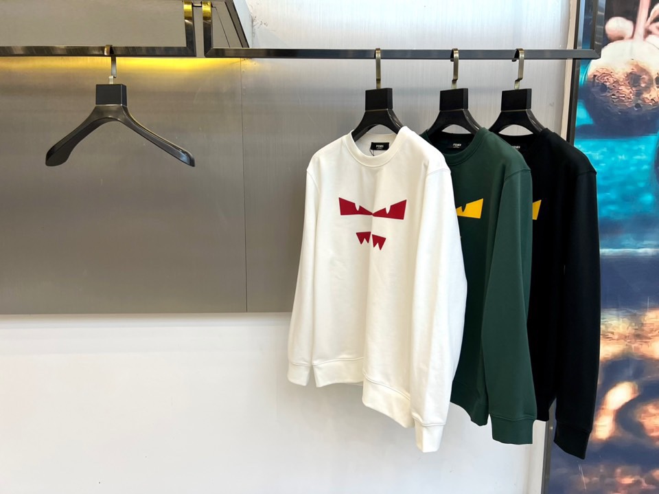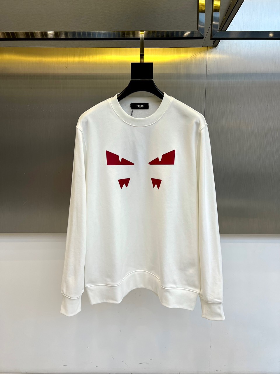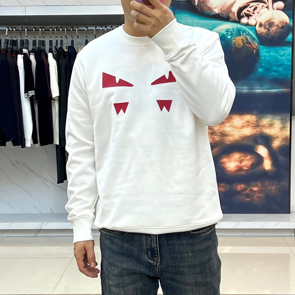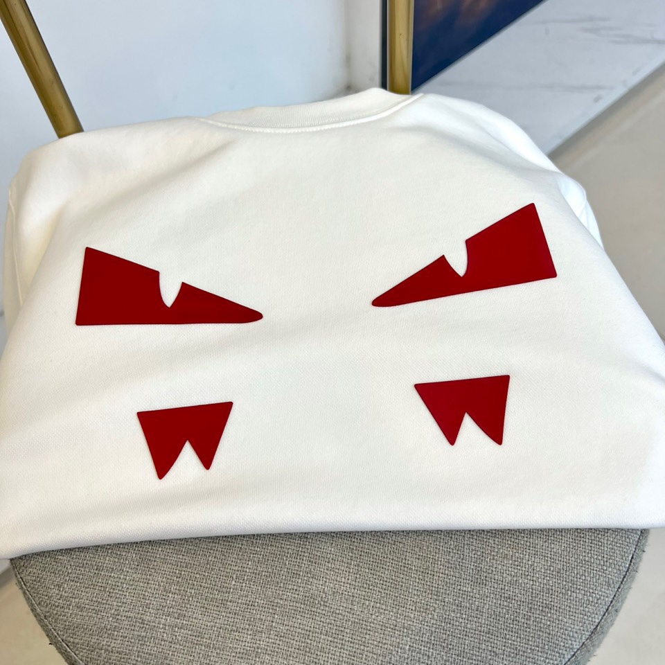 Home•Apparel•Jeans•Fendi 2025 autumn-winter hoodie with minimalist round neck, loose fit, and iconic red monster eye embroidery. Ribbed cuffs and hem. High-quality cotton for comfort. Street style meets luxury.