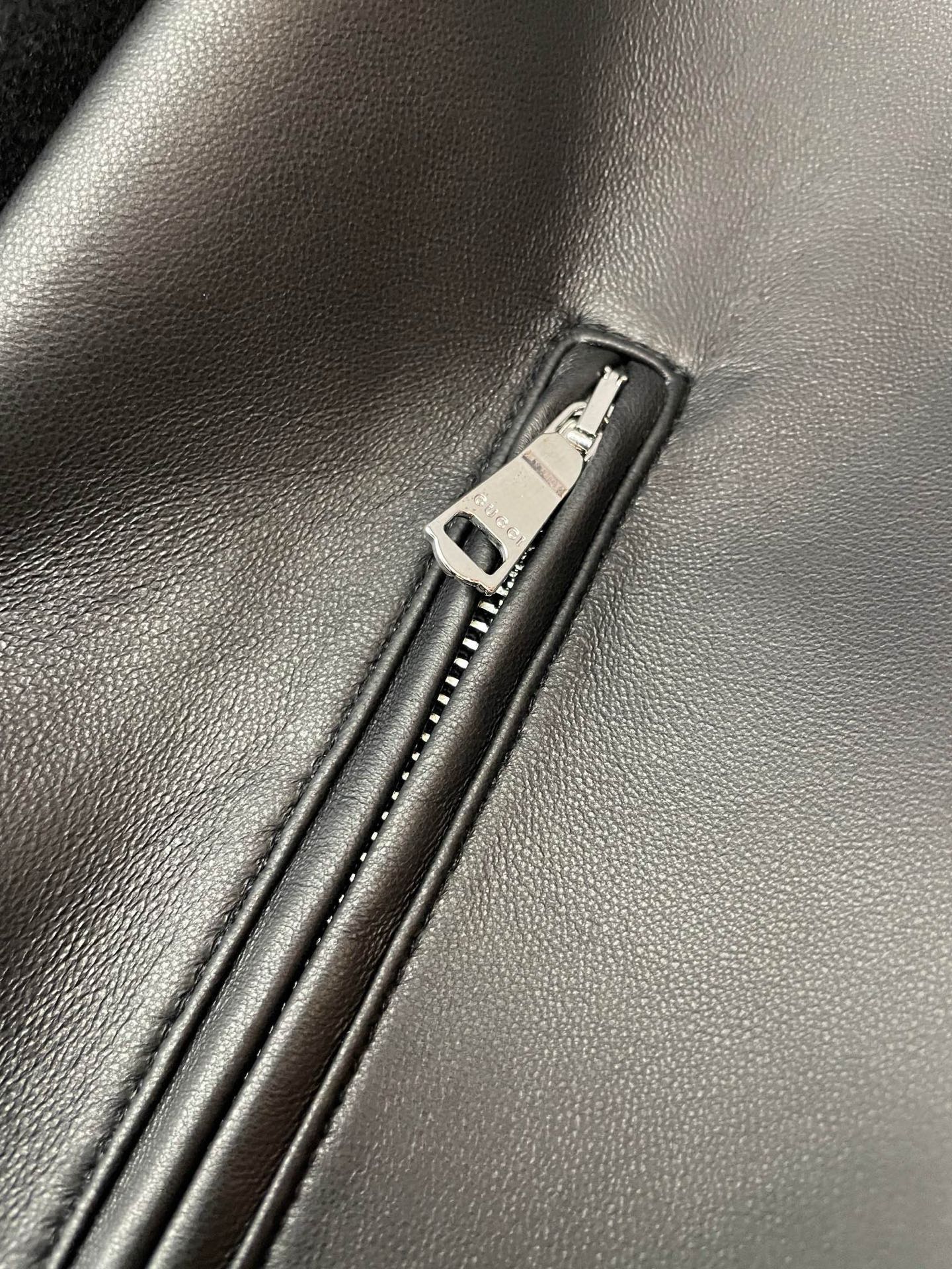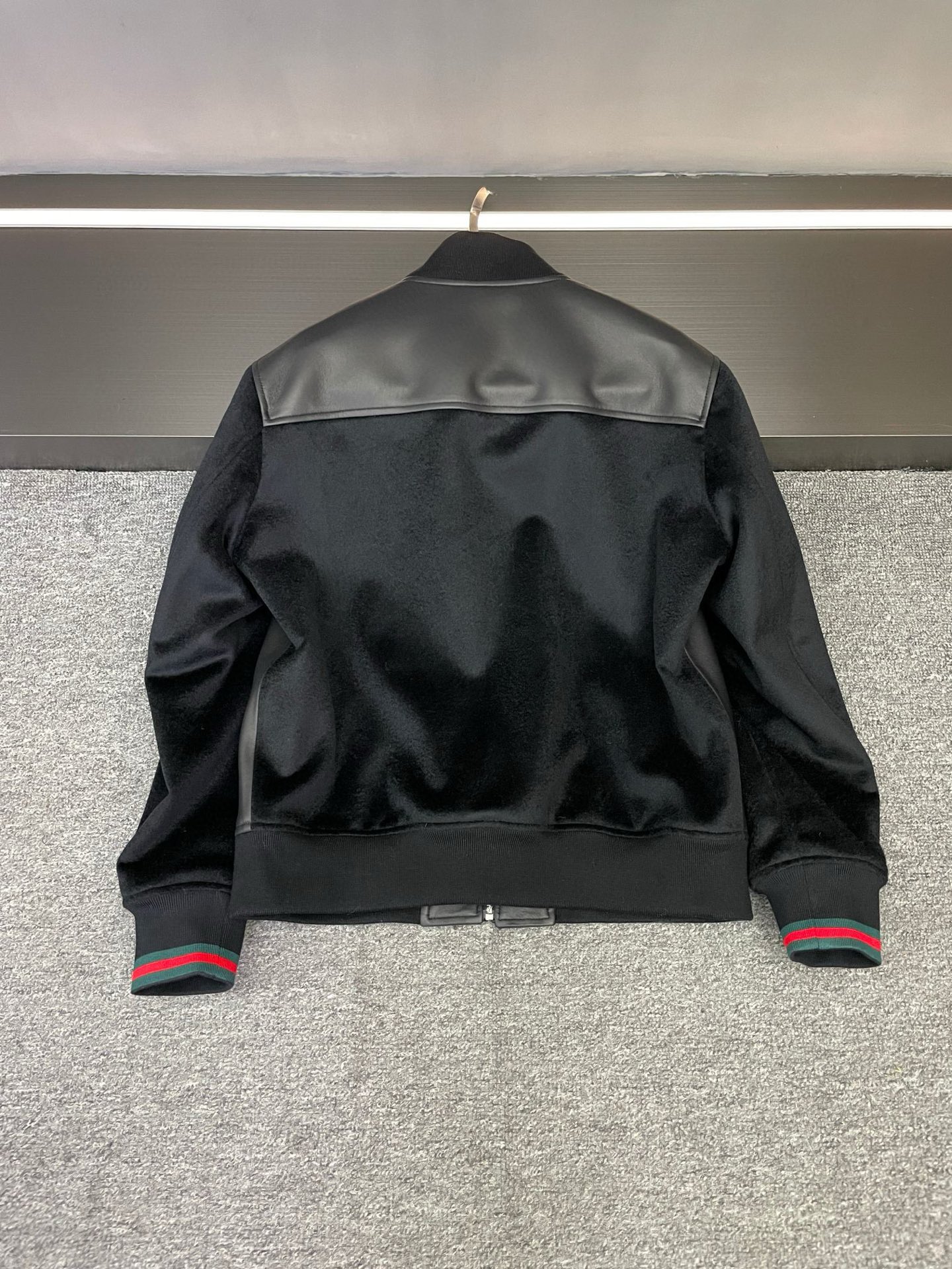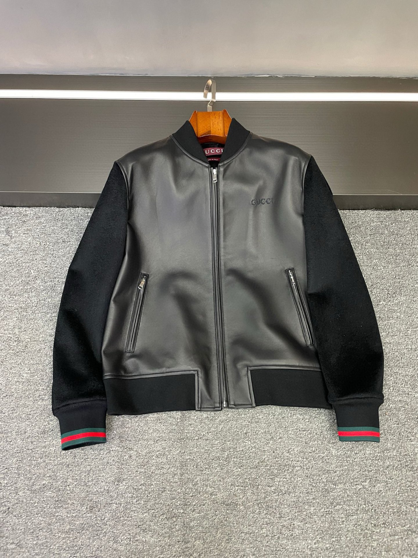GUCCI 25FW men's lambskin jacket. Imported black lambskin body, cashmere sleeves. Soft, warm, sleek. Red/blue cuff detail. Versatile for casual or formal wear. Size 58.