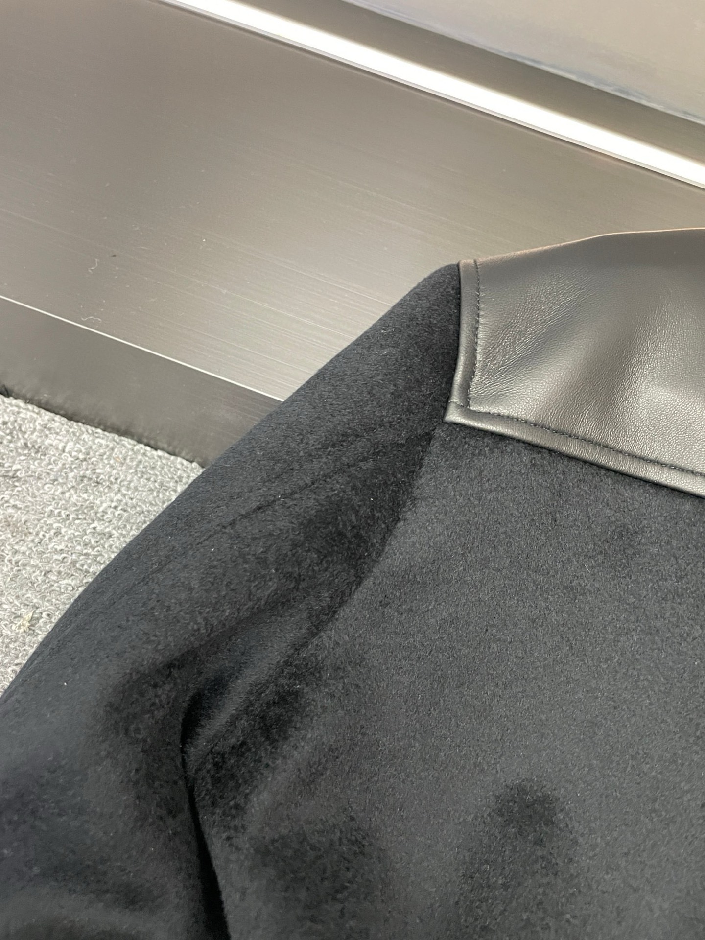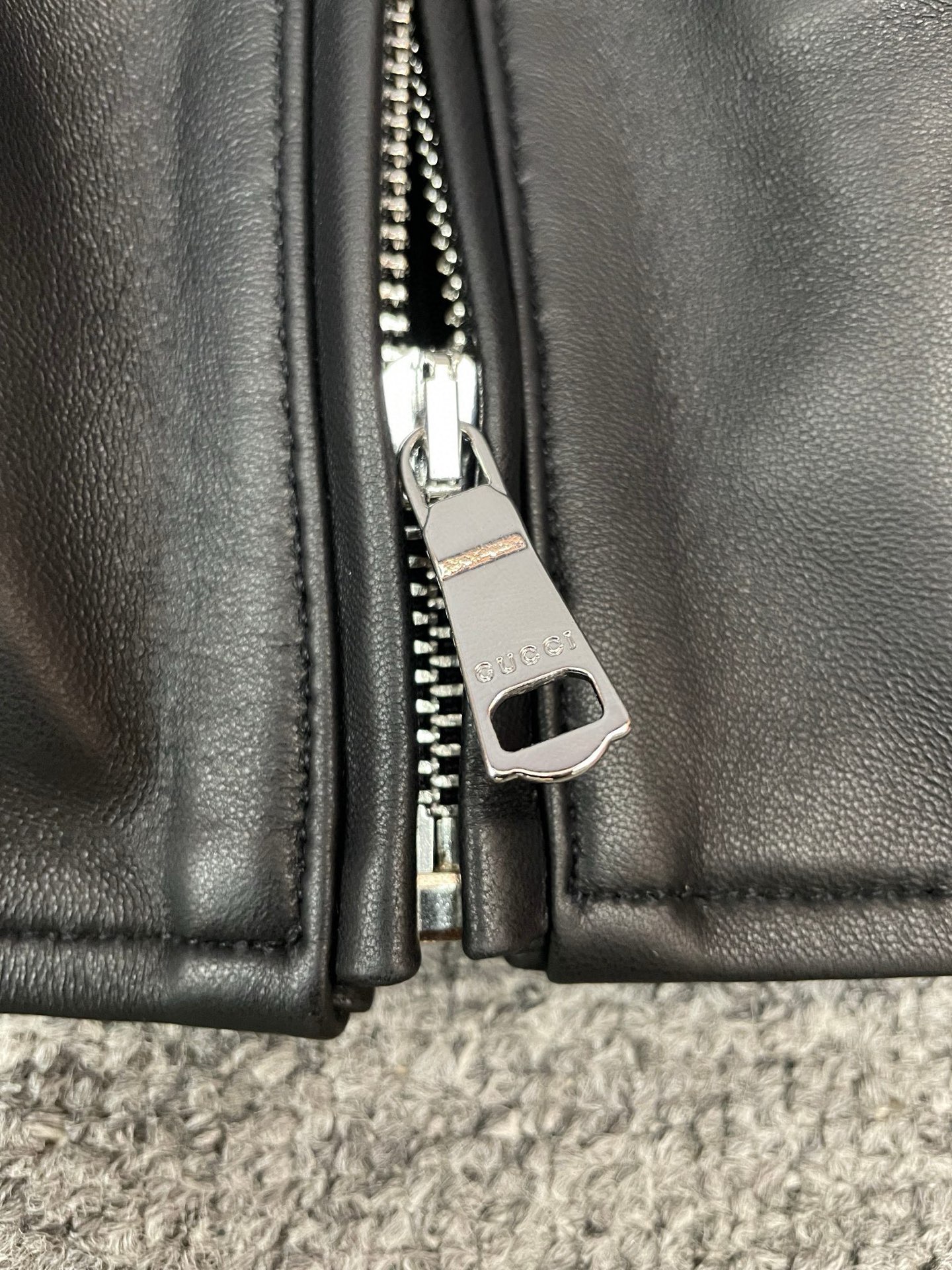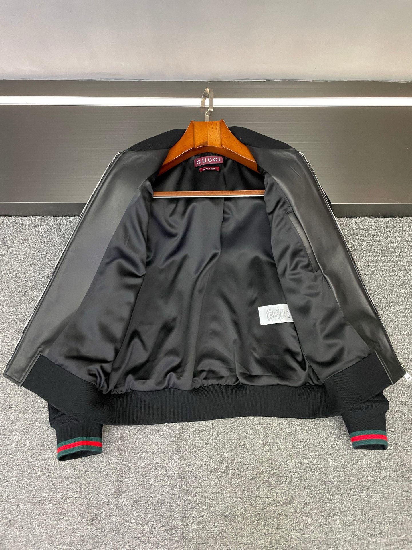 GUCCI 25FW men's lambskin jacket. Imported black lambskin body, cashmere sleeves. Soft, warm, sleek. Red/blue cuff detail. Versatile for casual or formal wear. Size 58.