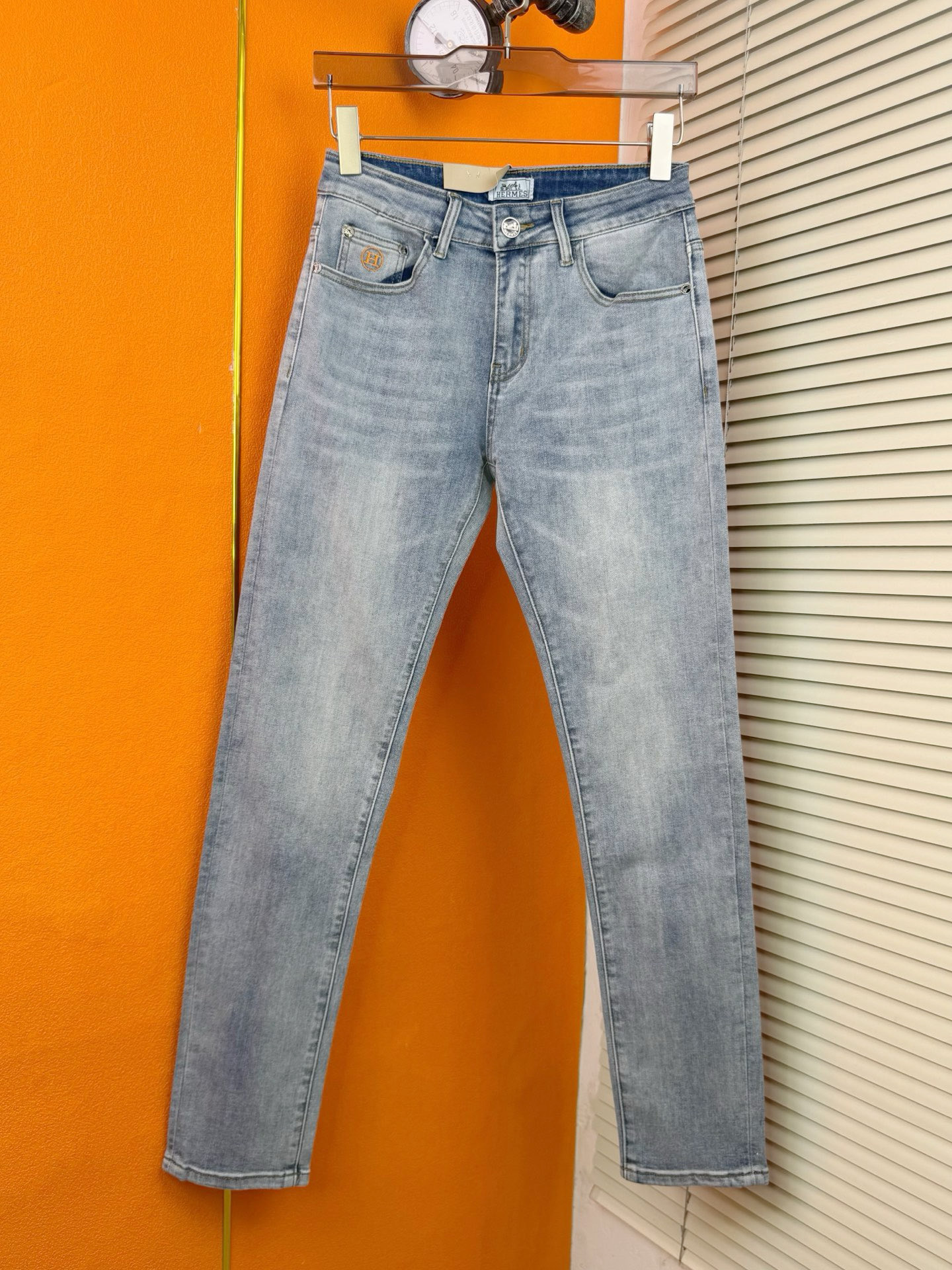 Hermès men's jeans in classic blue stretch denim. Slim fit, easy to match. Sizes 29-40.