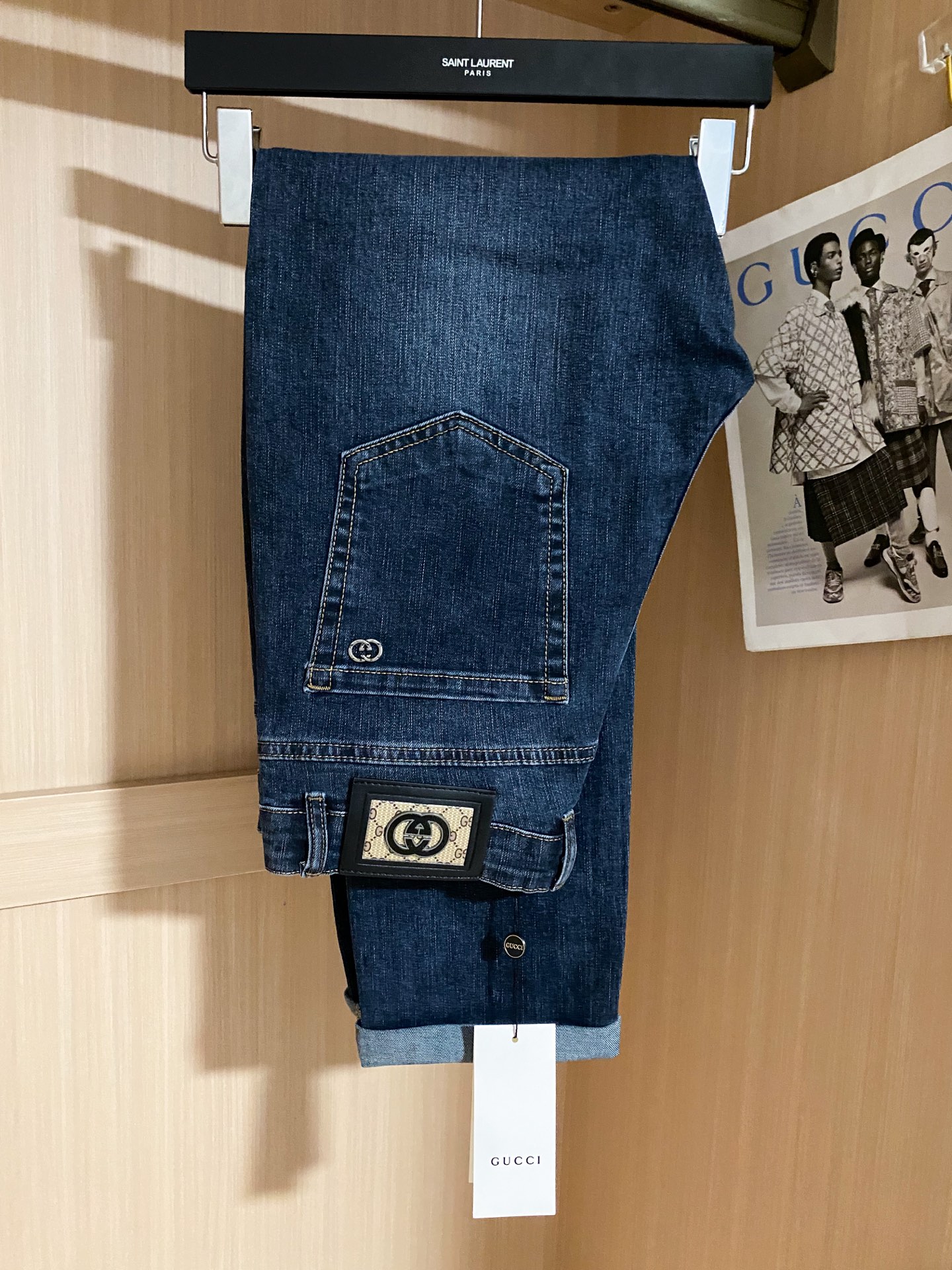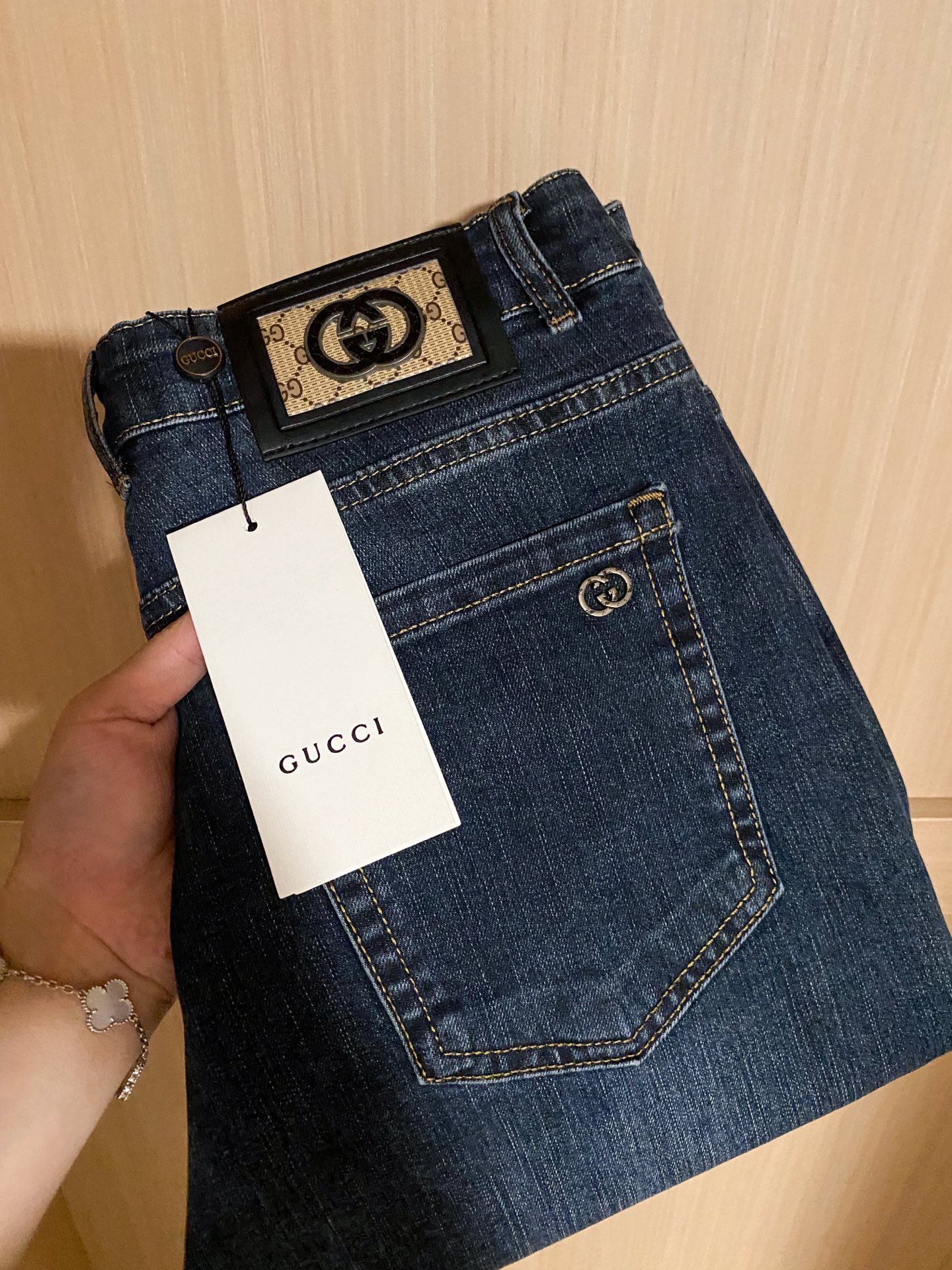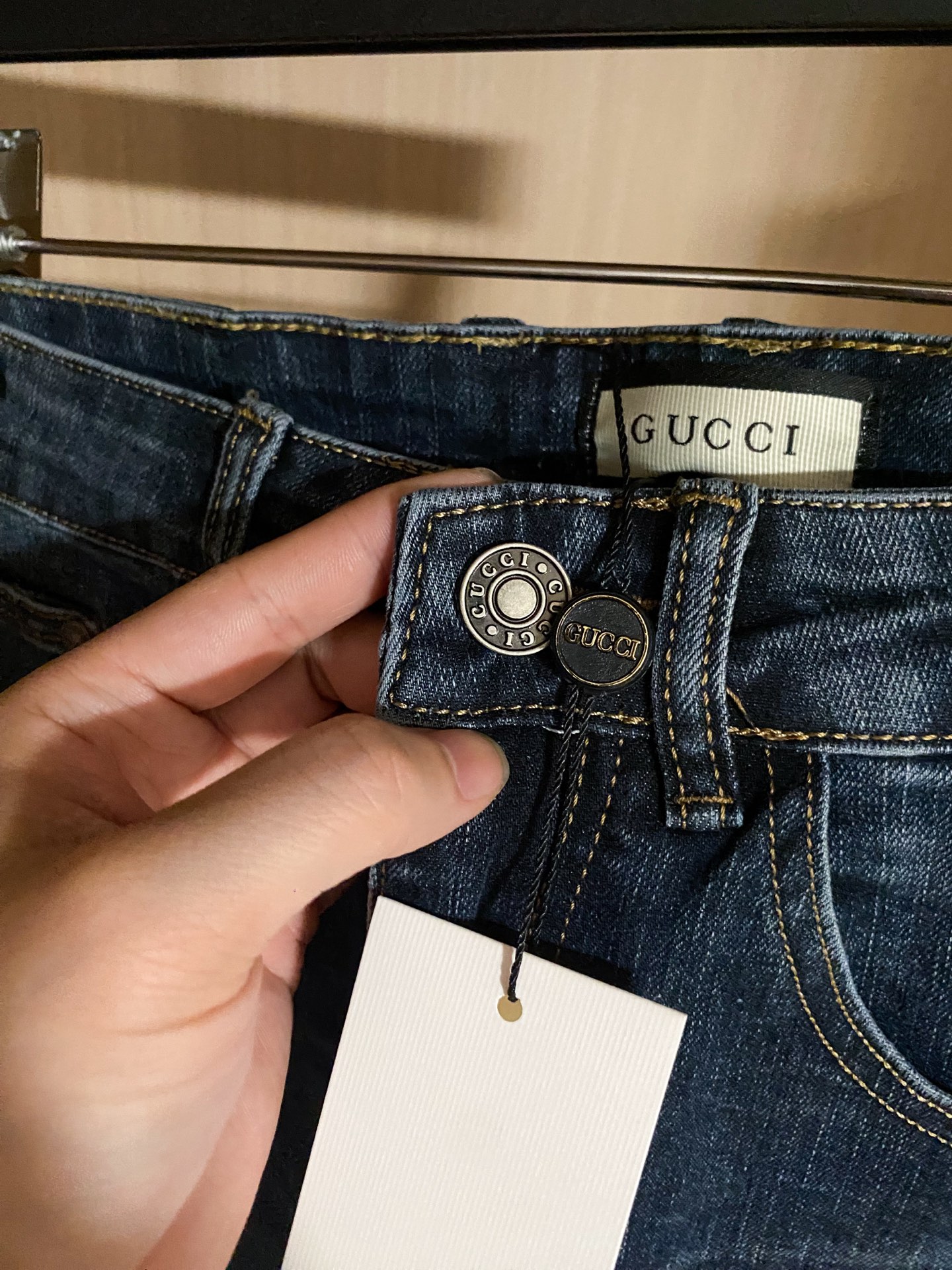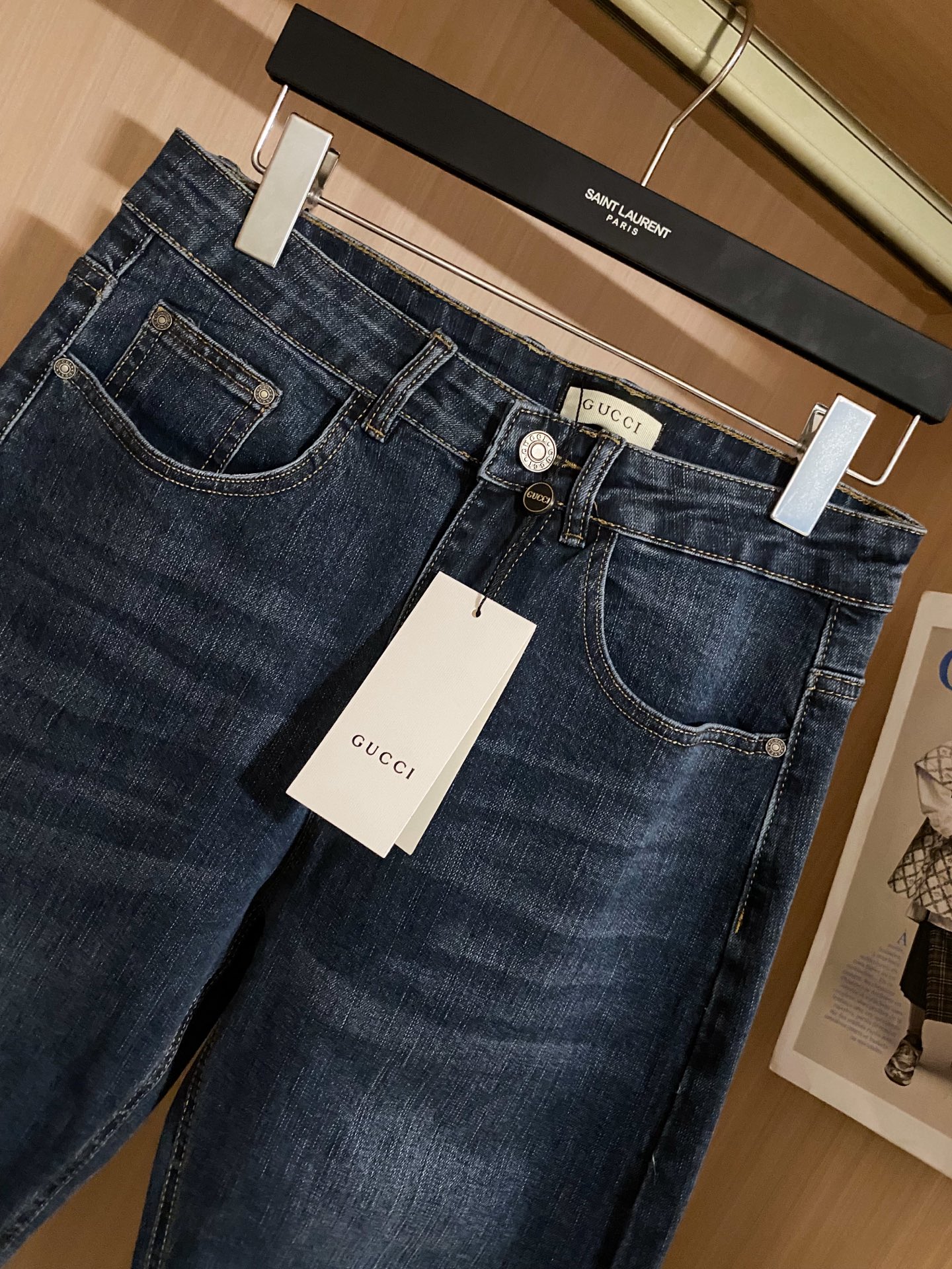 GUCCI 2025 SS men's washed jeans. Classic design, vintage style, embroidered G logo. Perfect fit, essential wardrobe item. Sizes 29-40 (no 37, 39).