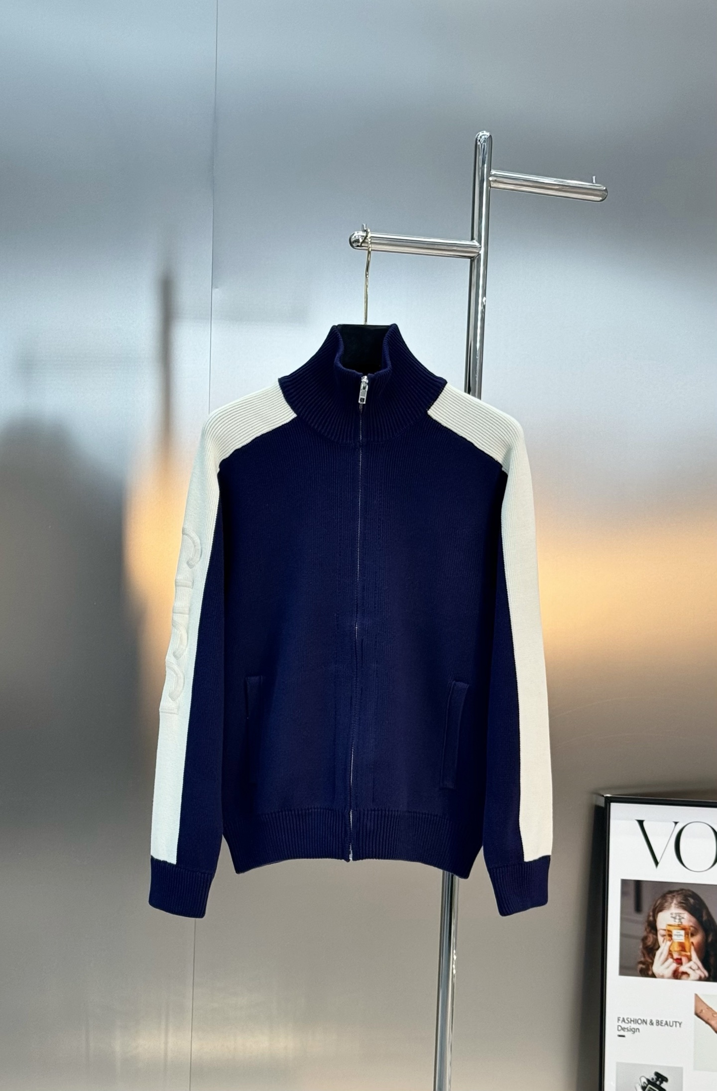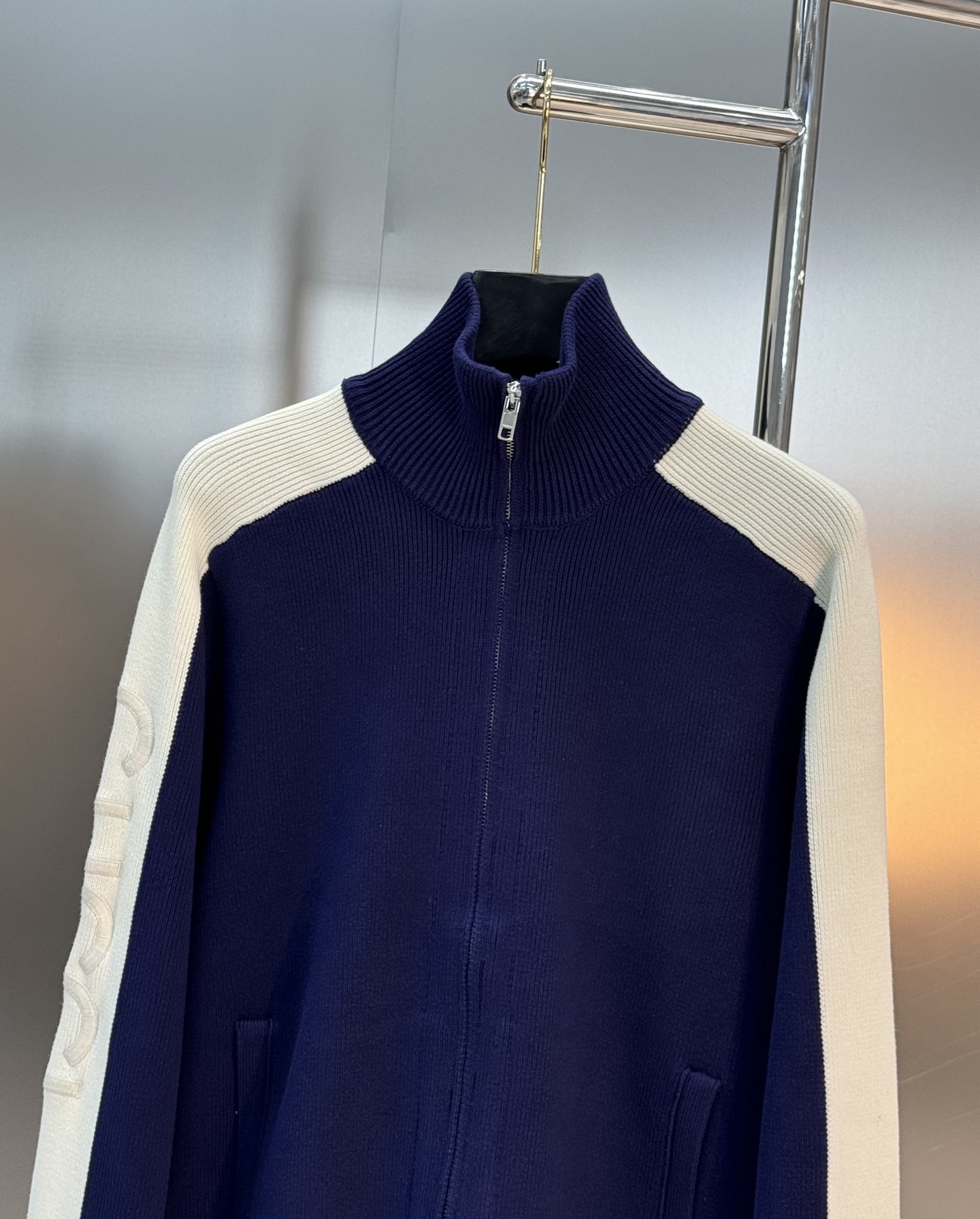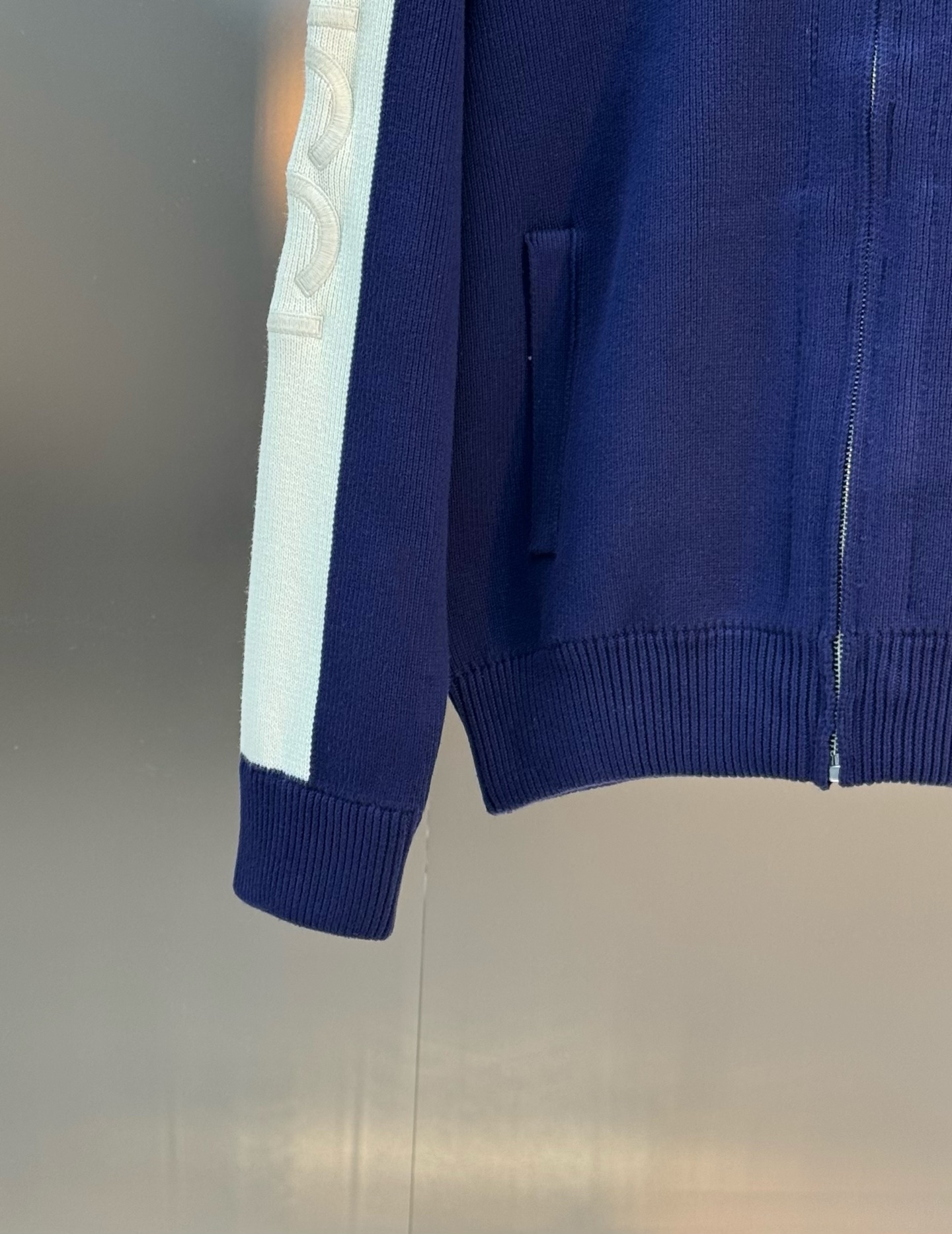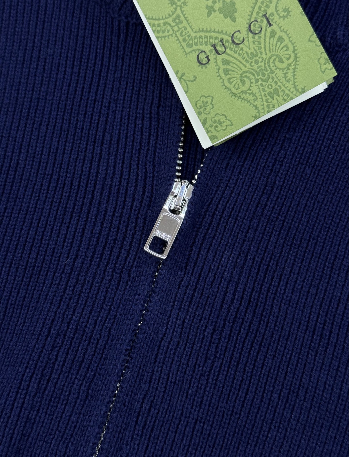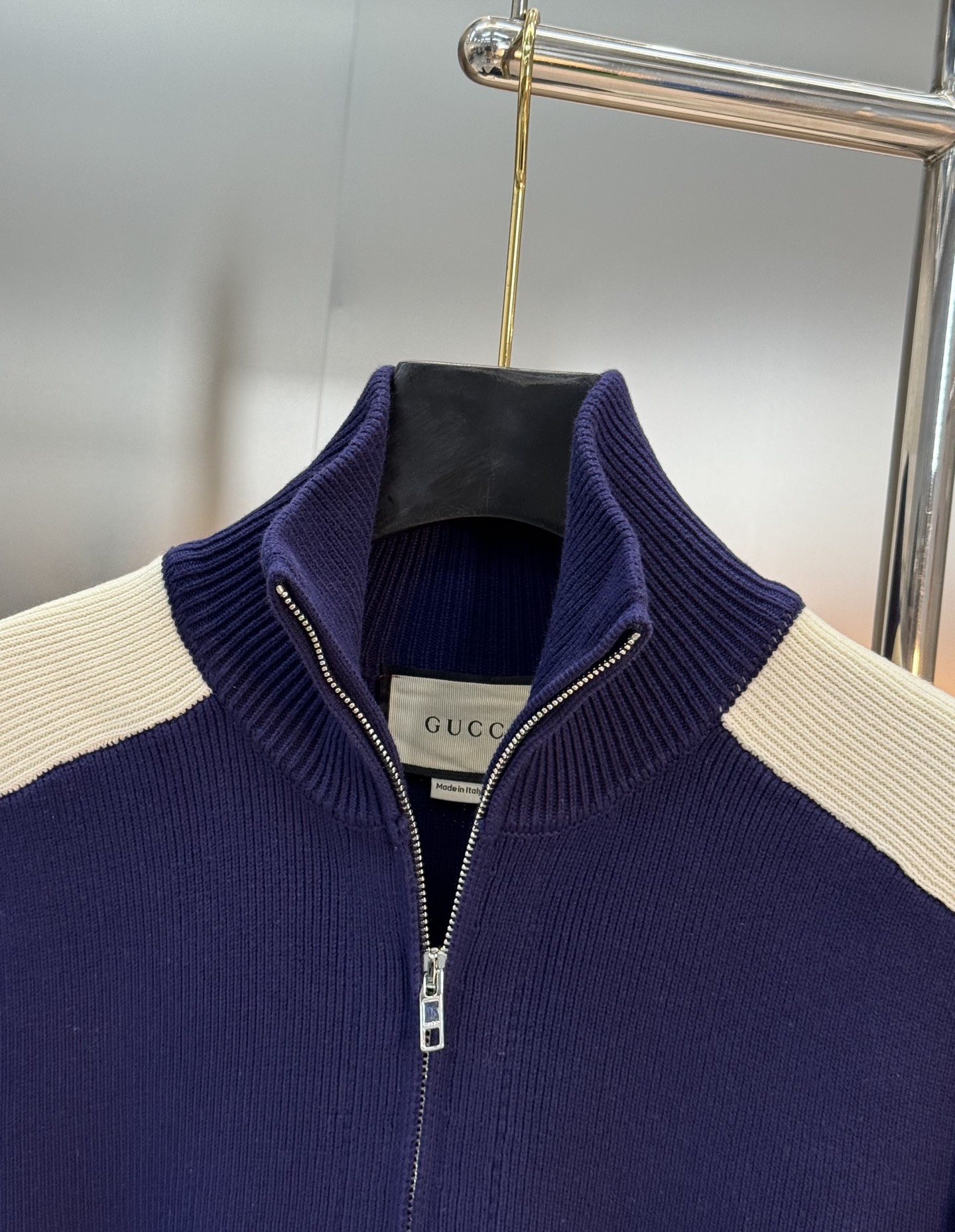 Gucci blue-white knitted zip jacket. Cotton blend, drop shoulder, stand collar. Embroidery details. Unisex, S-XL. Versatile for casual wear.