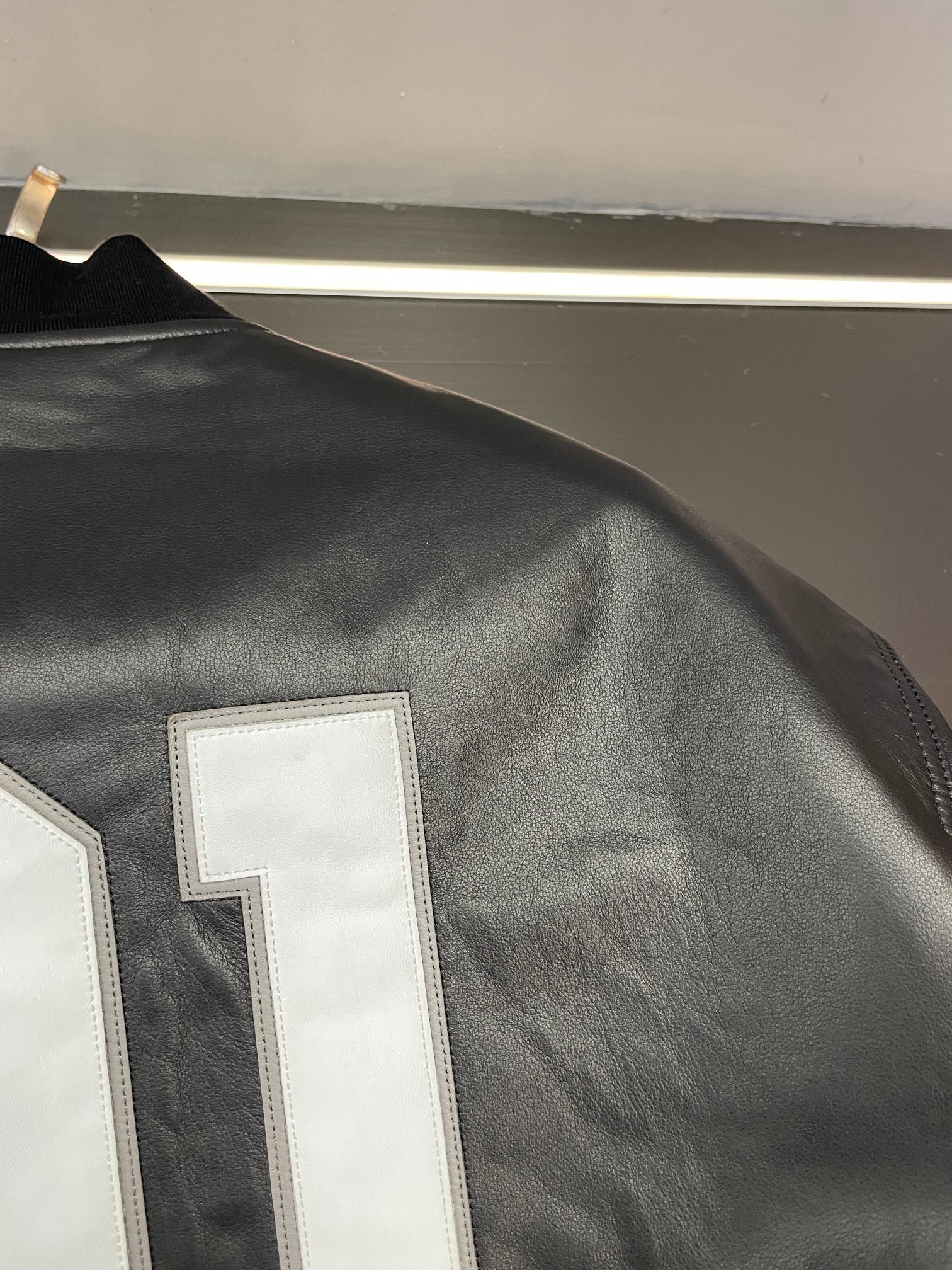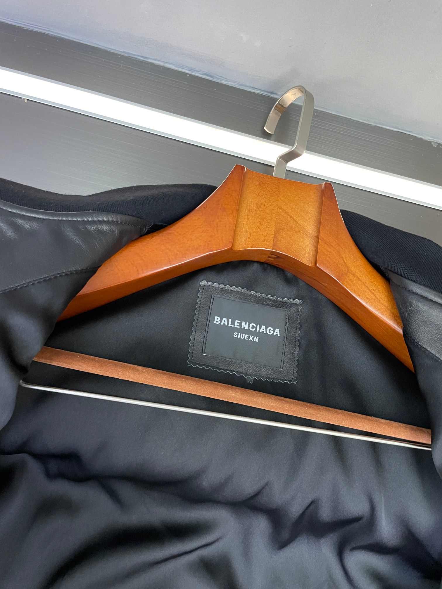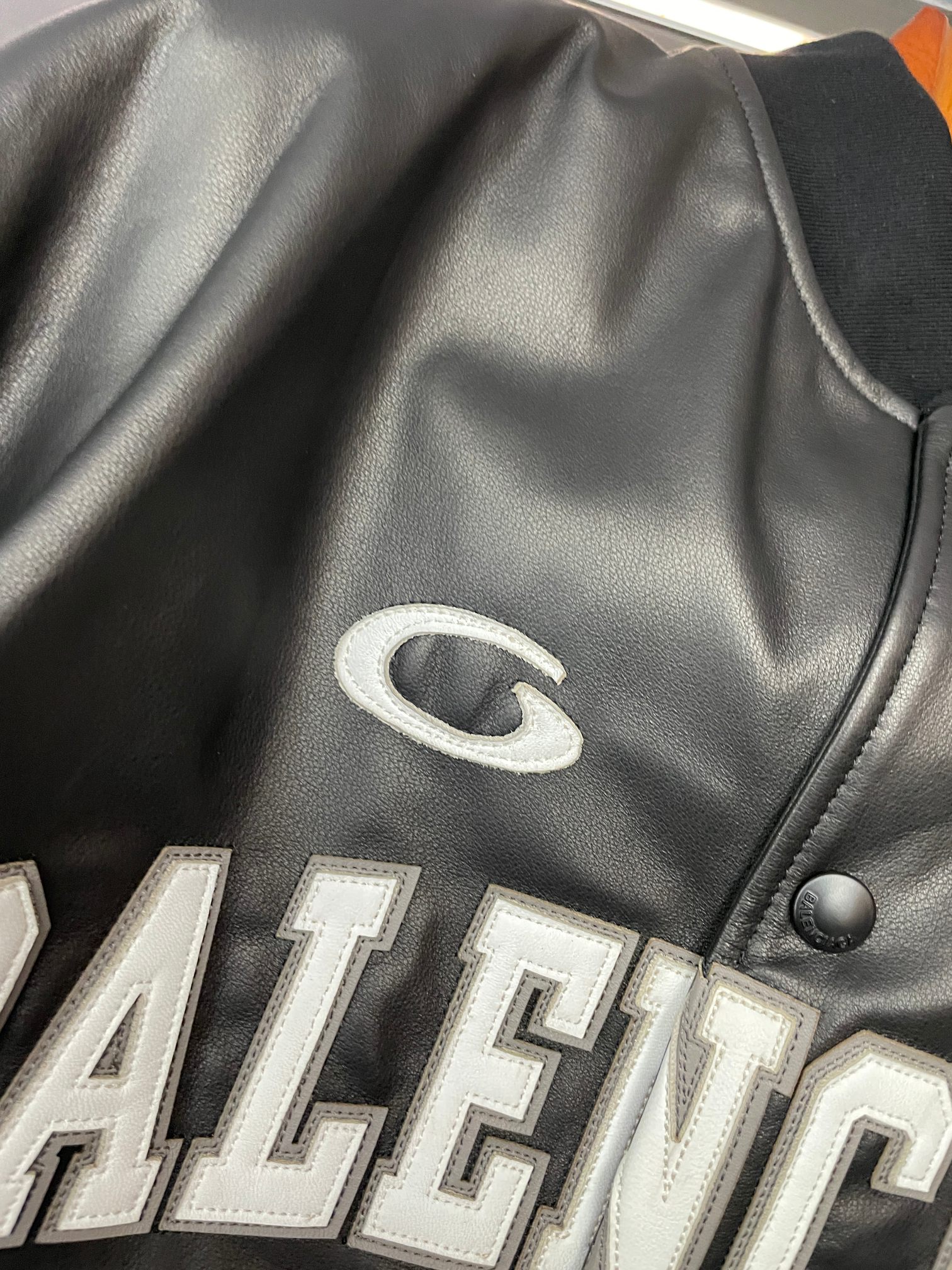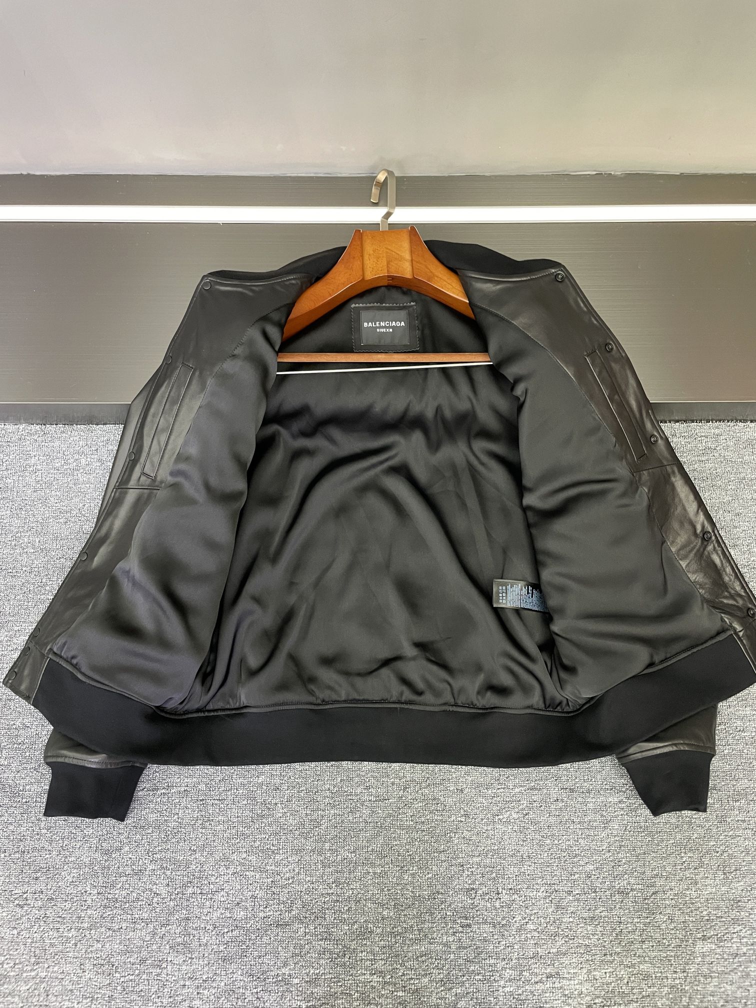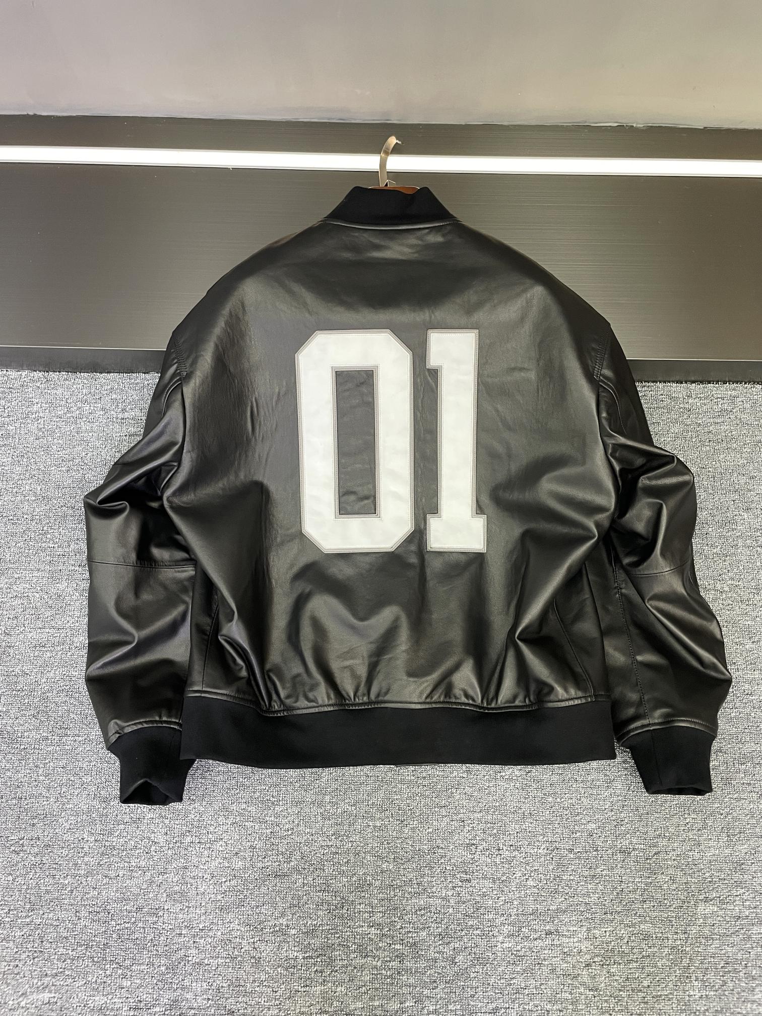Balenciaga's 2025 autumn-winter men's lambskin jacket. Imported black lamb leather, sleek and durable. Bold logo patches on front/back. Versatile for casual or formal wear. Sizes 48-56.