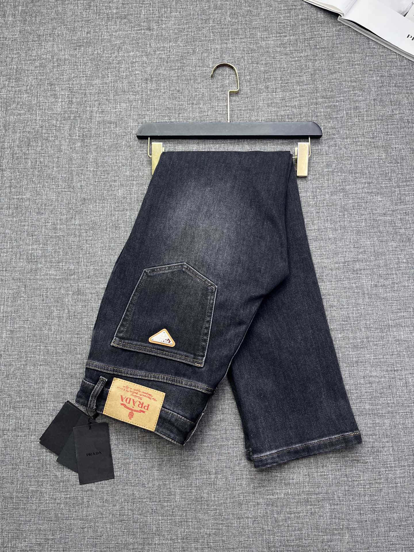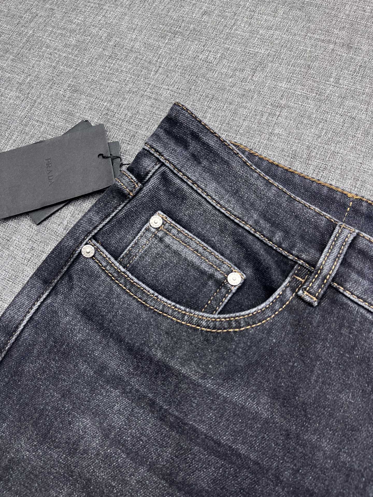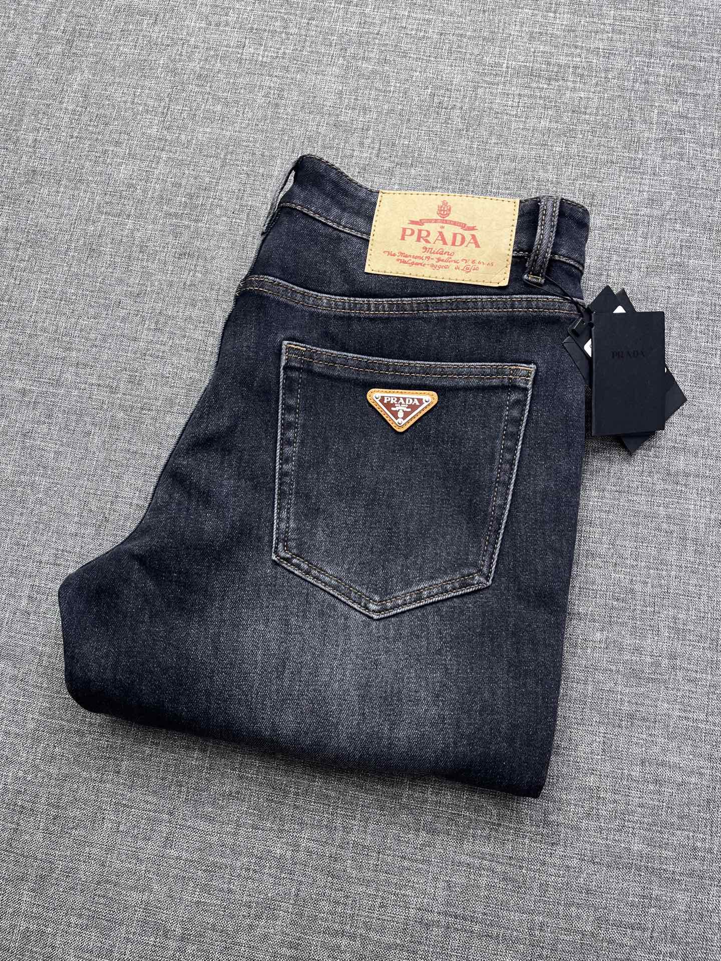 PRADA ultra-soft washed jeans, slim straight-cut design, men's top casual cotton, high-end elastic, versatile for all seasons, exclusive limited edition.