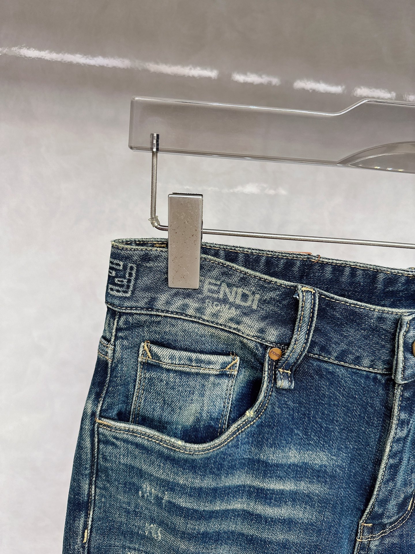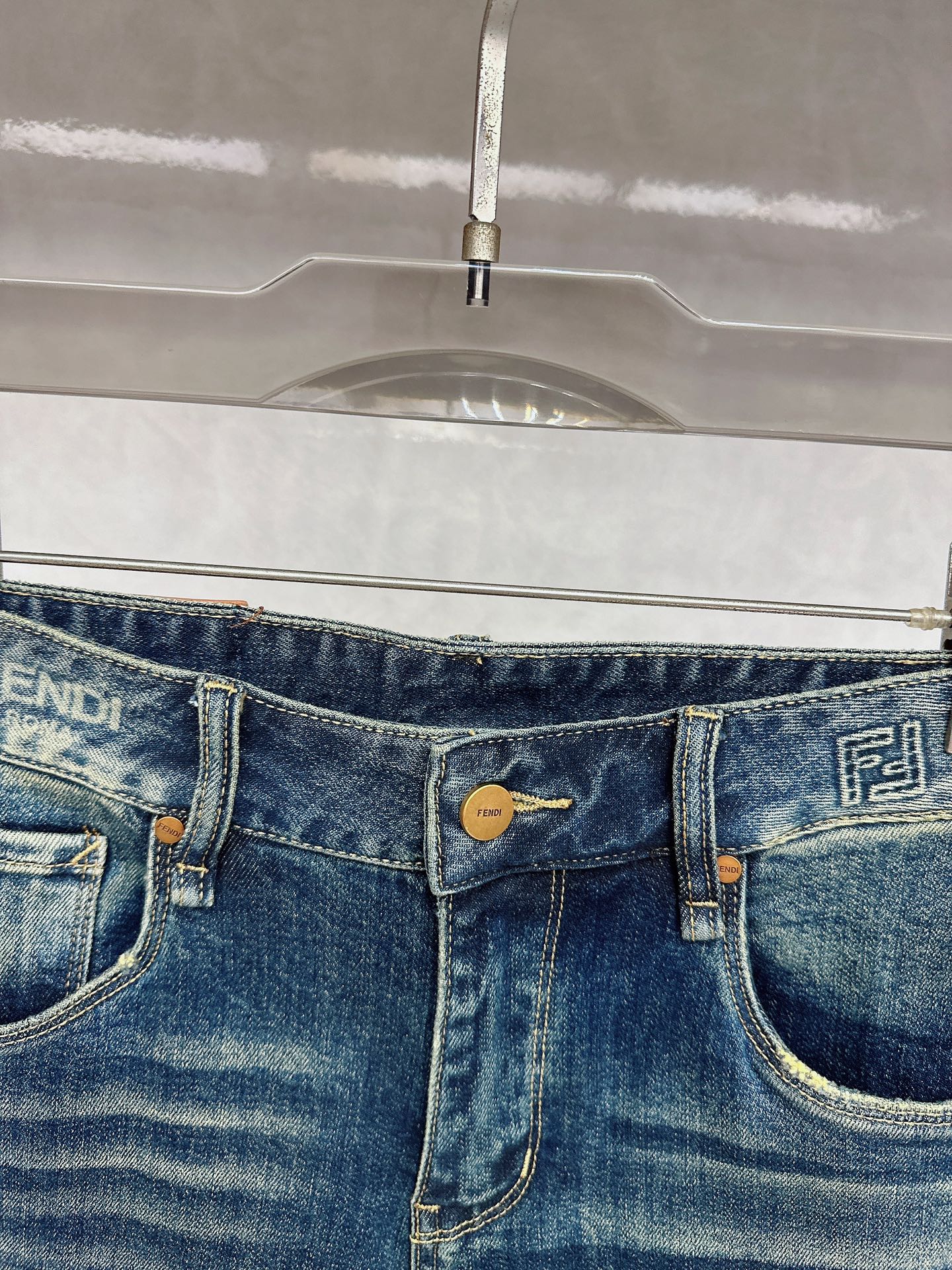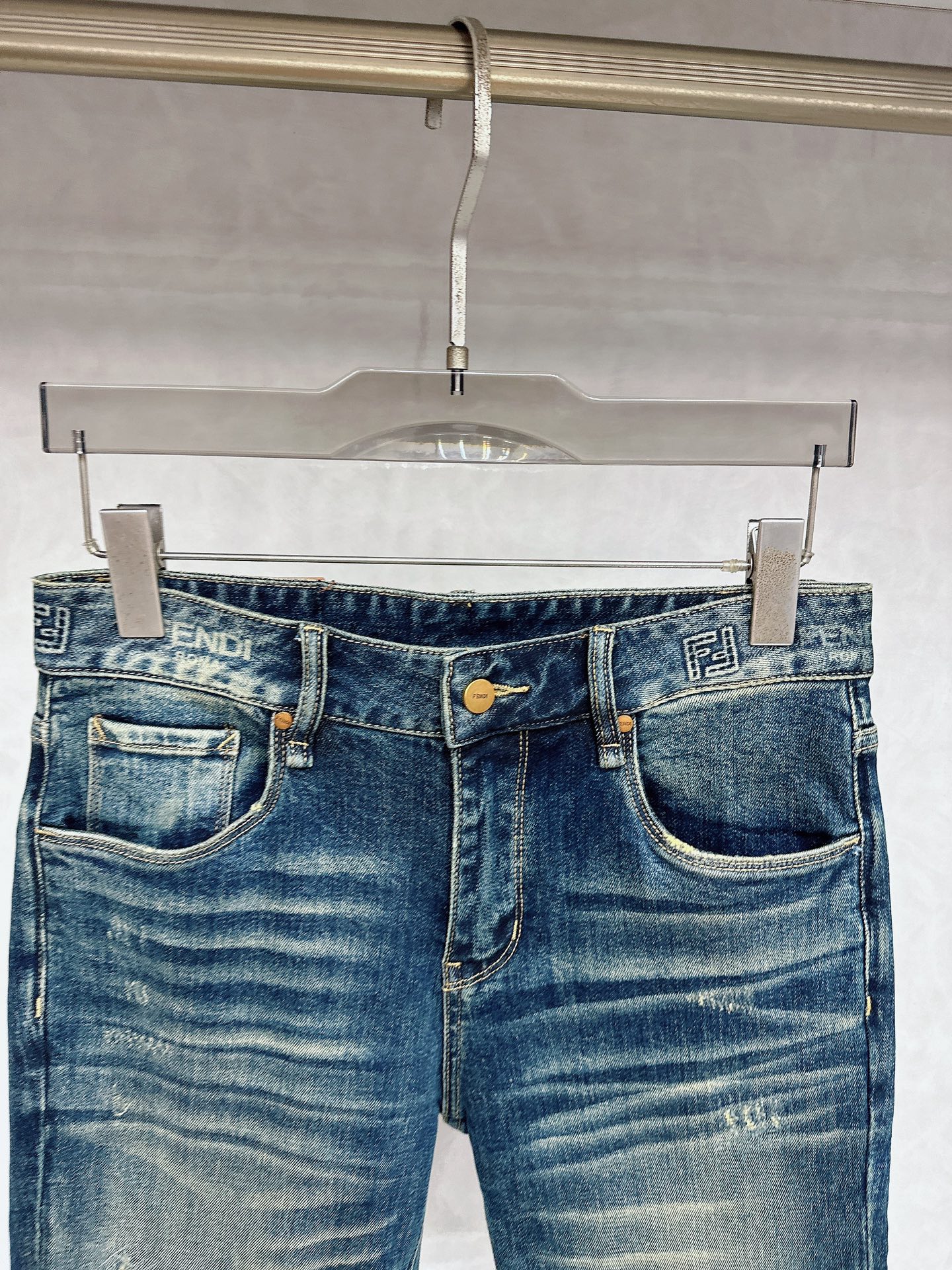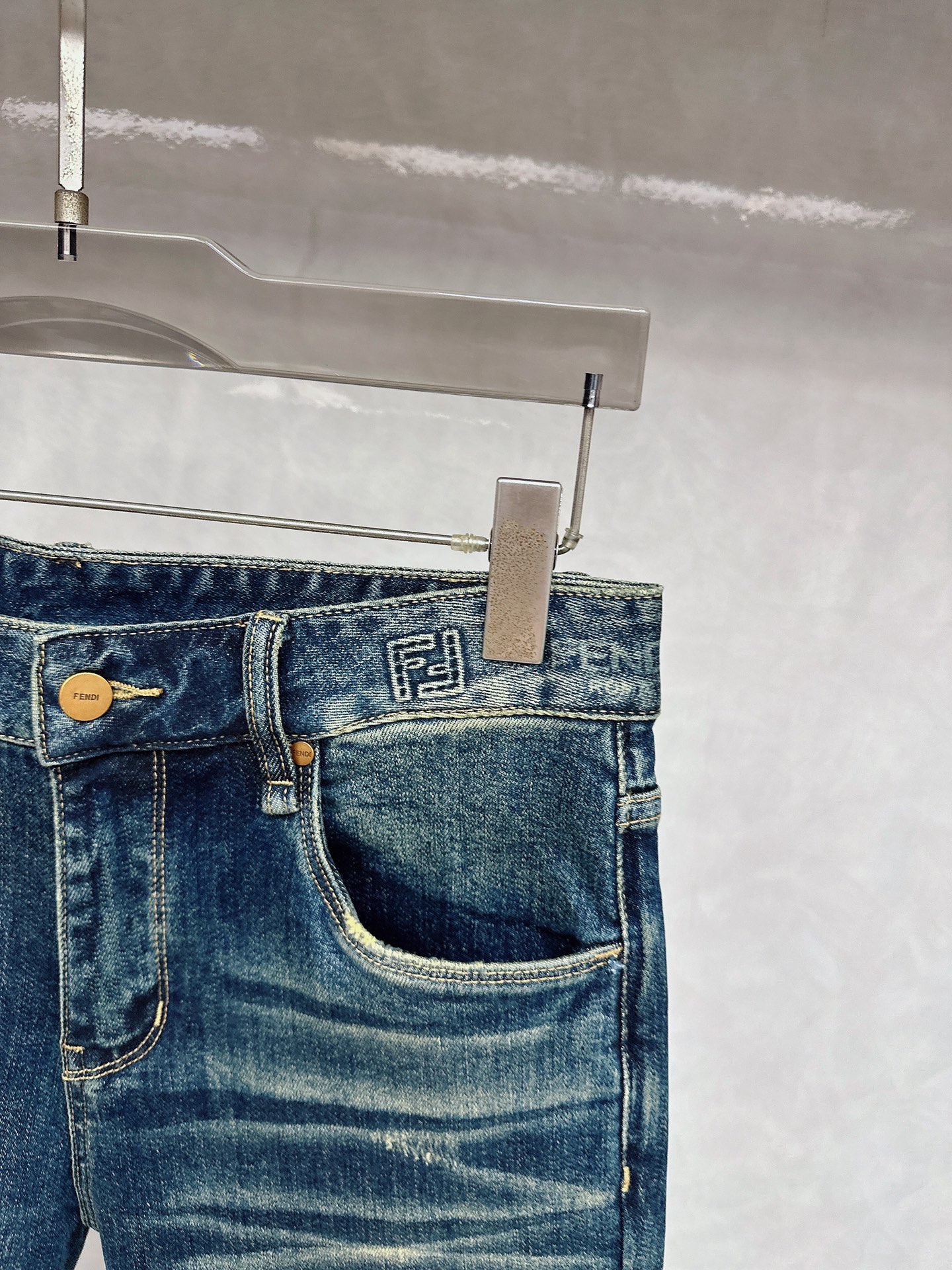 Fendi 2025 Fall/Winter new jeans available. Custom design, original hardware, heavy craftsmanship. Flattering fit, impeccable details. Sizes 28-38.