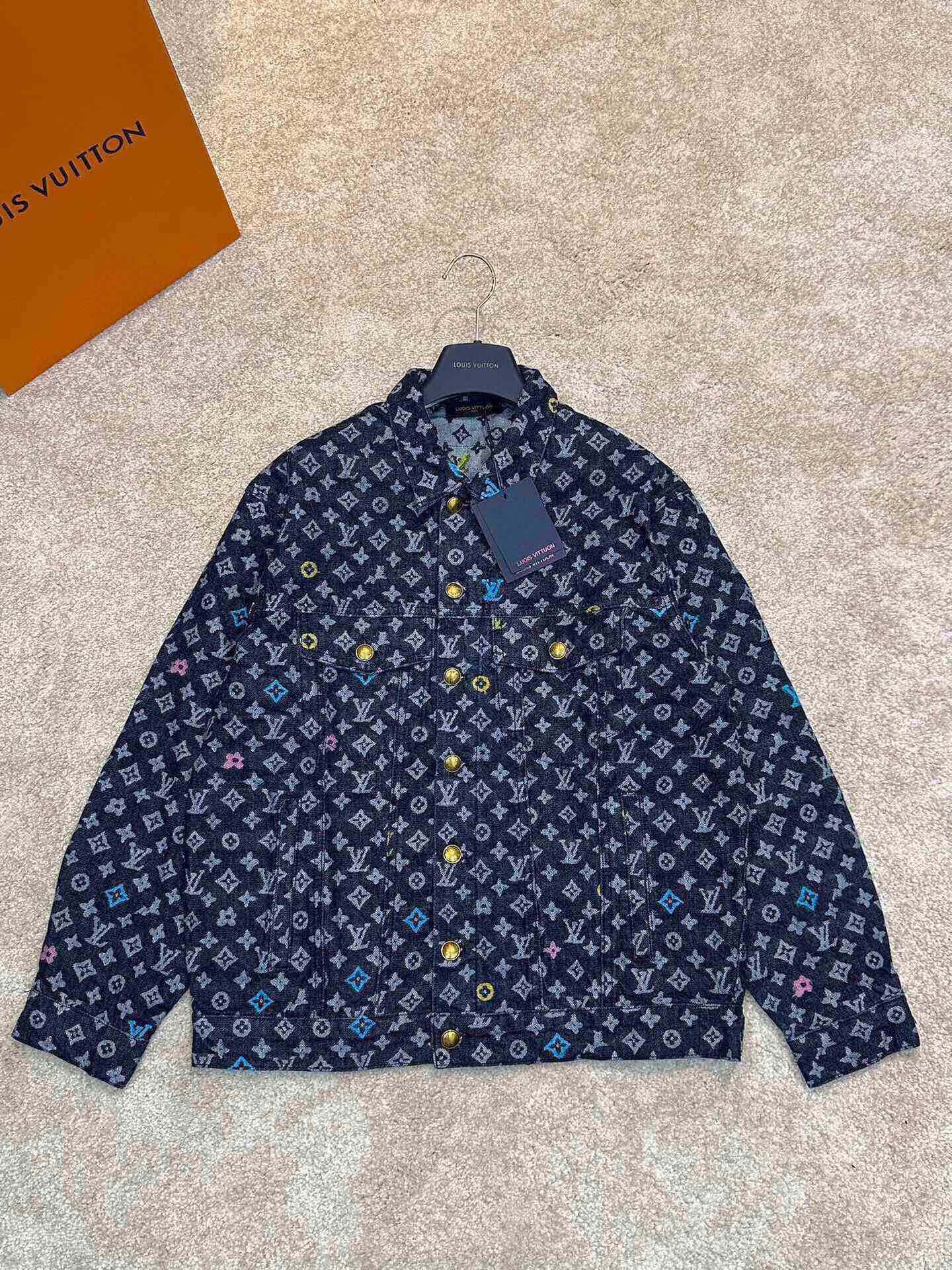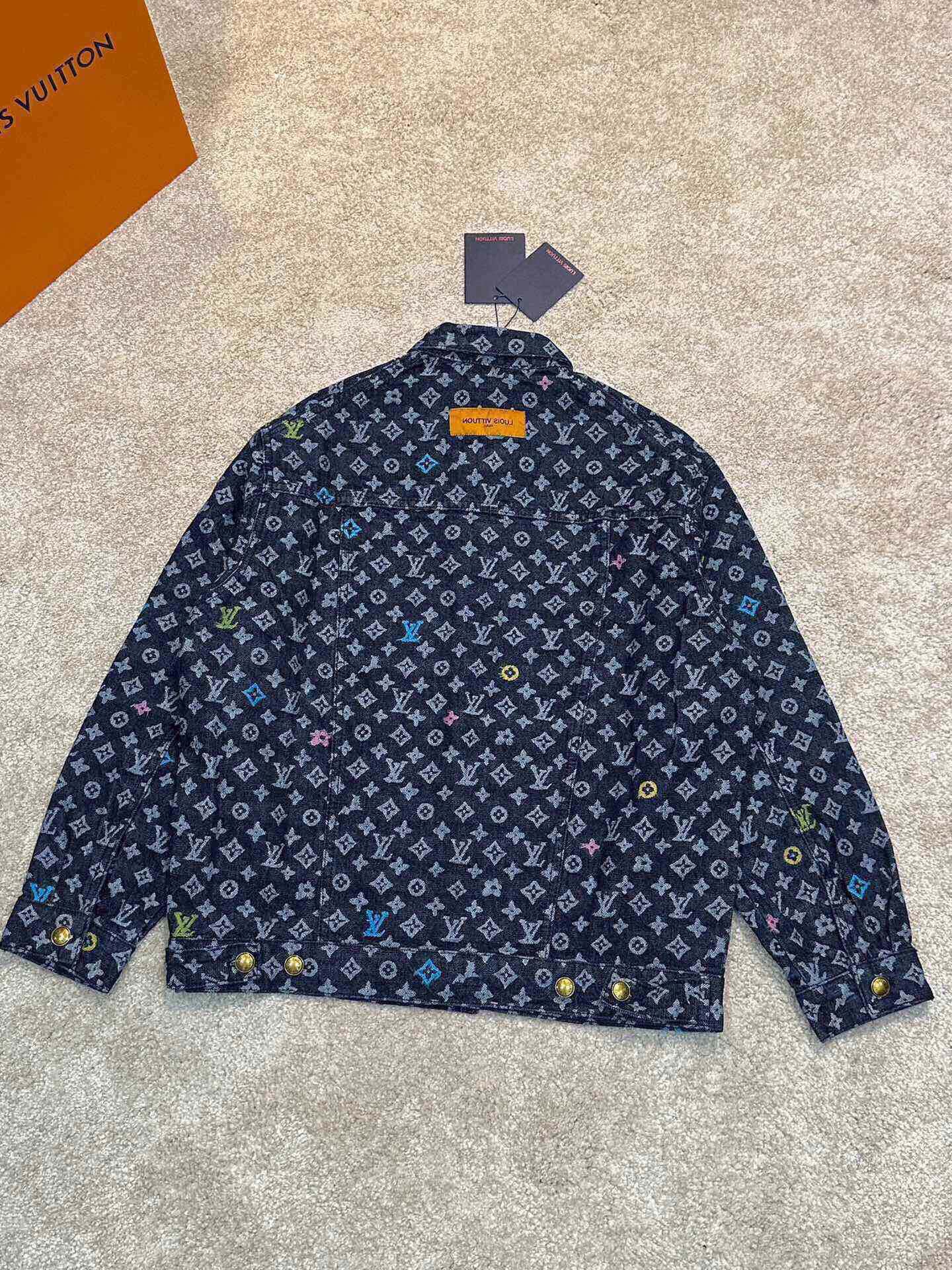 LV Tyler collaboration embroidered long sleeve shirt and jeans set. Denim twill cotton jacquard material, vintage light blue wash with monogram pattern. Colorful embroidery (blue/pink/yellow/fluorescent green). Sizes M-3XL. Model 3031.