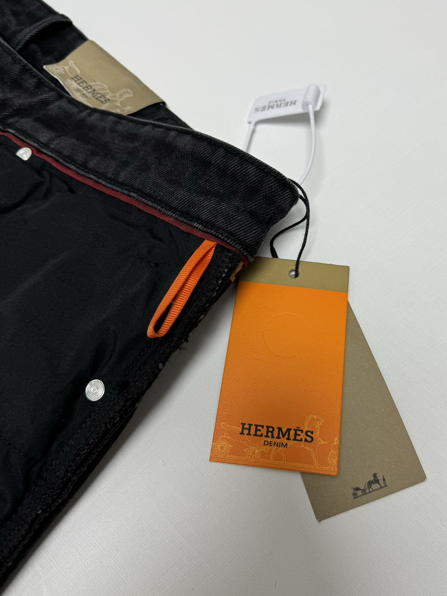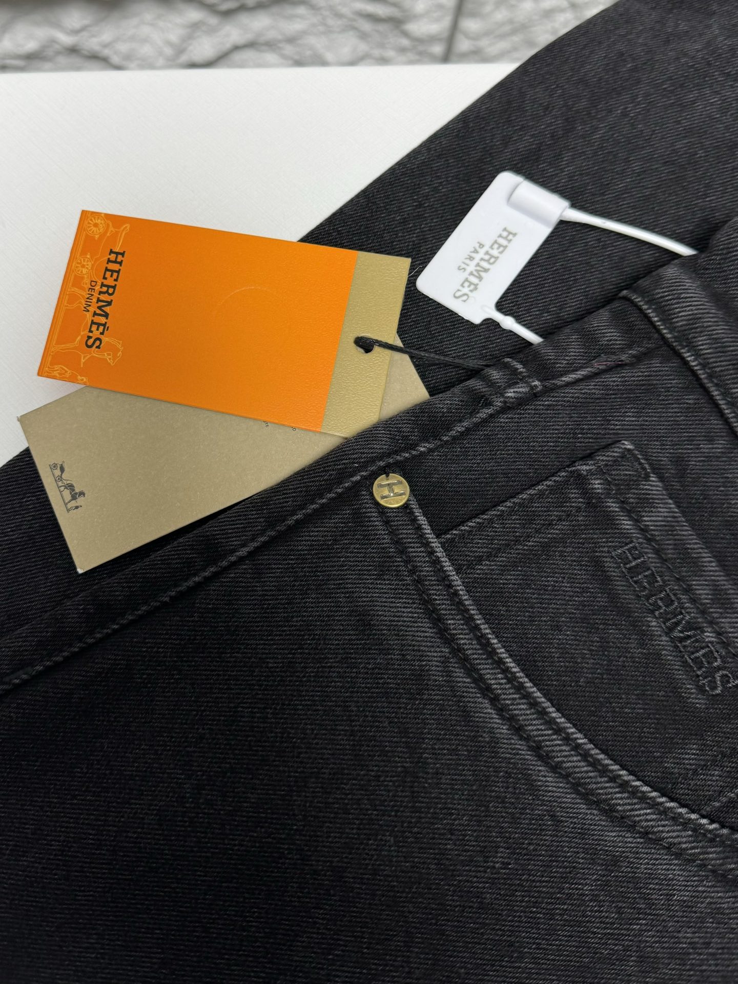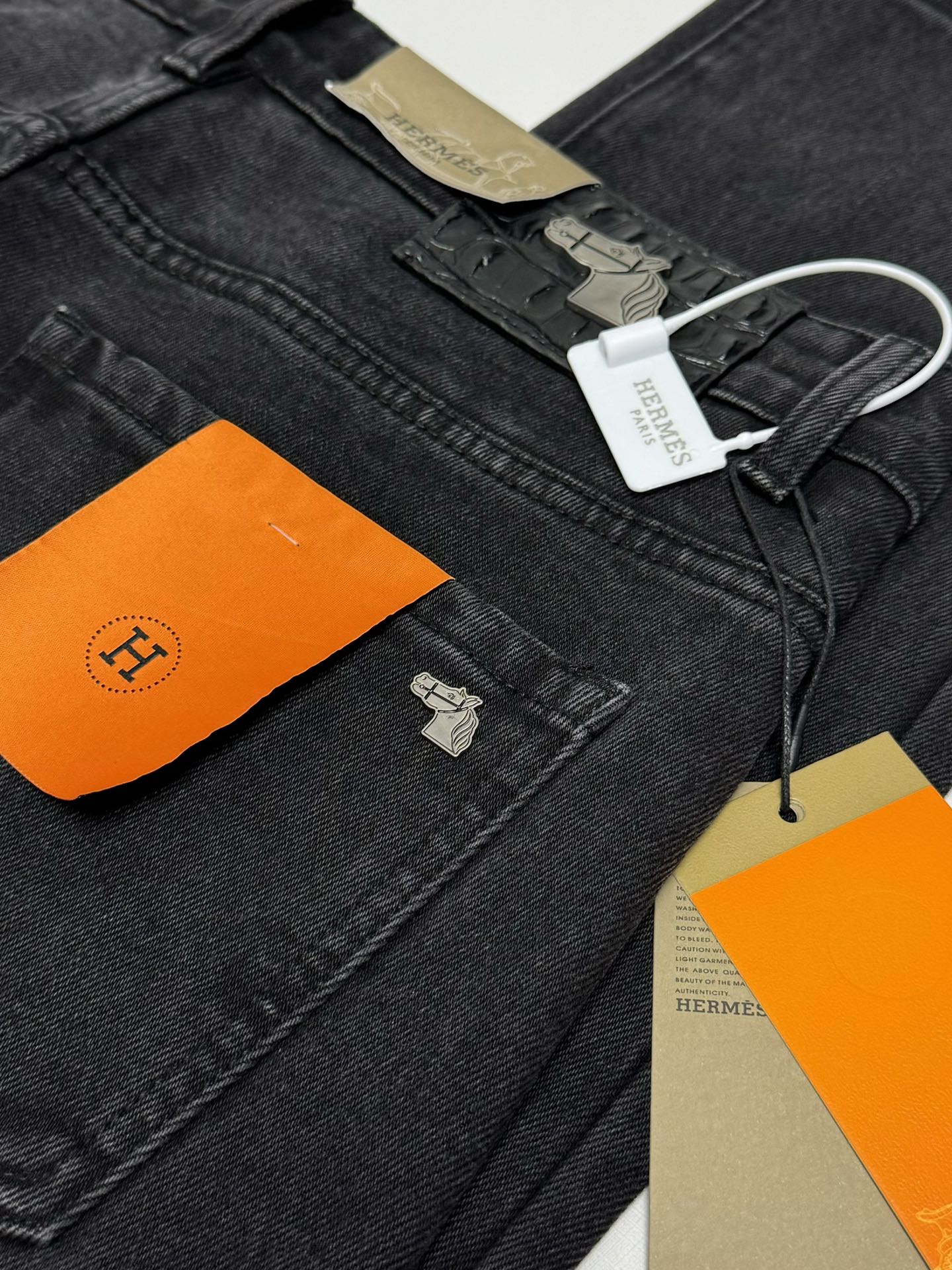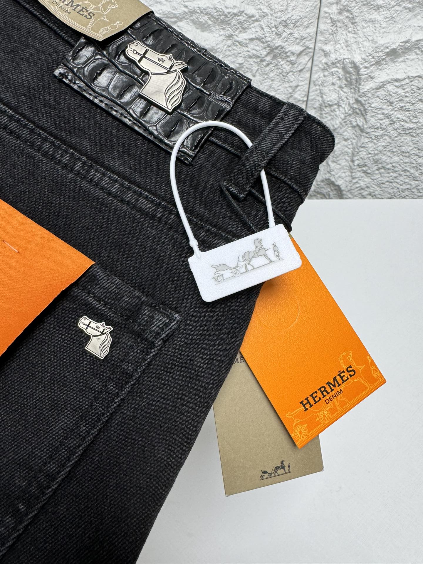 Hermès 2025秋冬 men's casual jeans. High-quality cotton, soft skin-friendly fabric, excellent drape. Classic logo waistband, versatile stylish design. Tailored fit, detailed stitching. Essential wardrobe piece.
