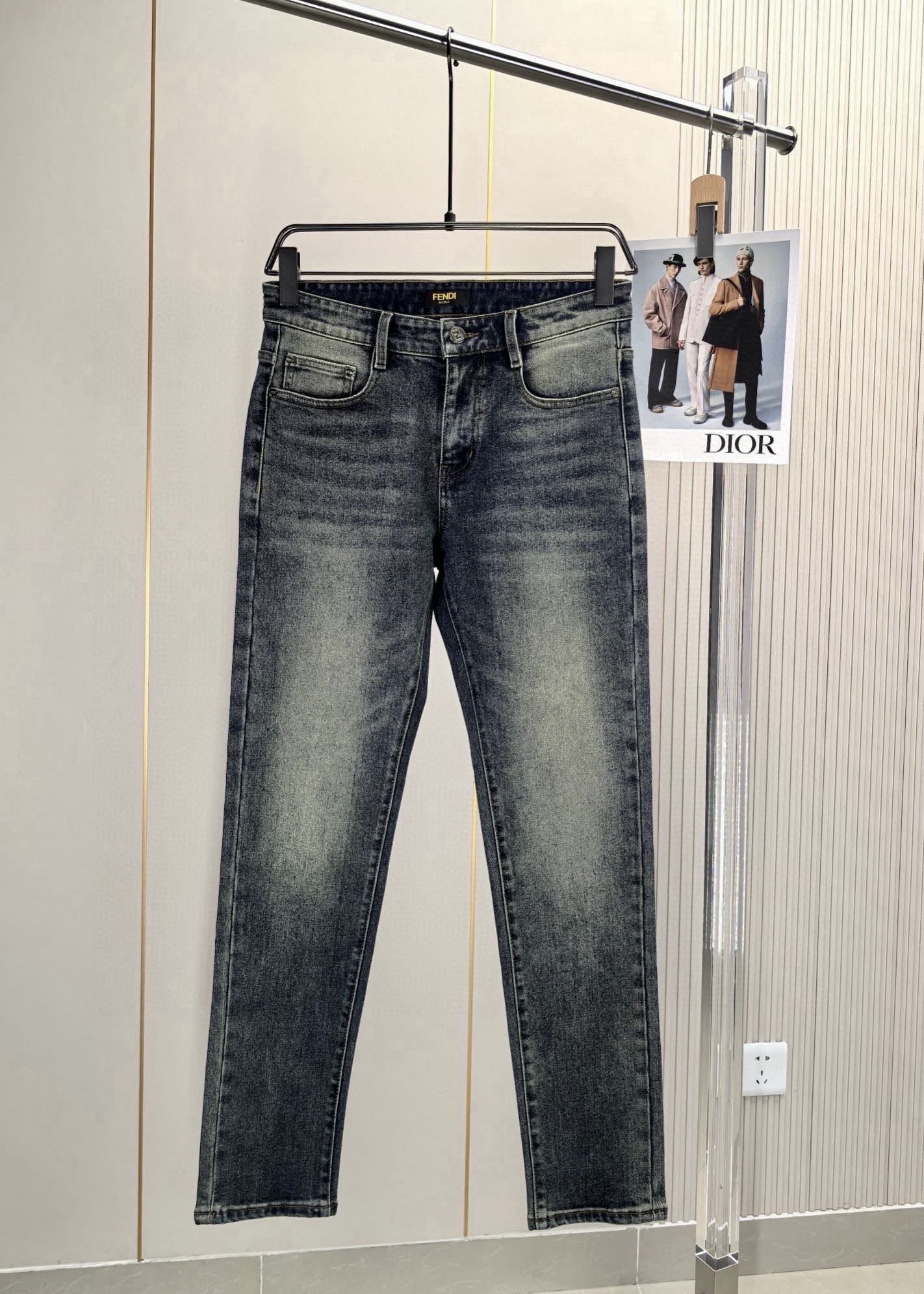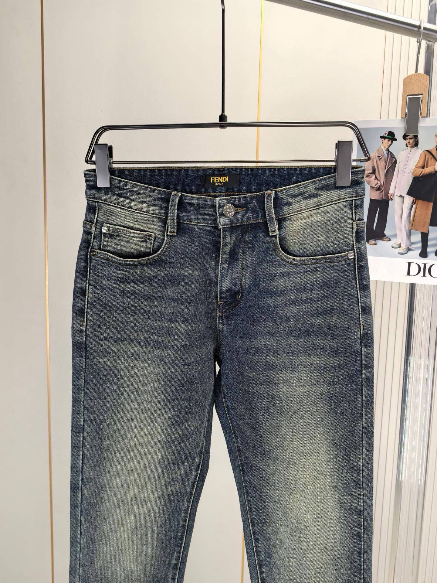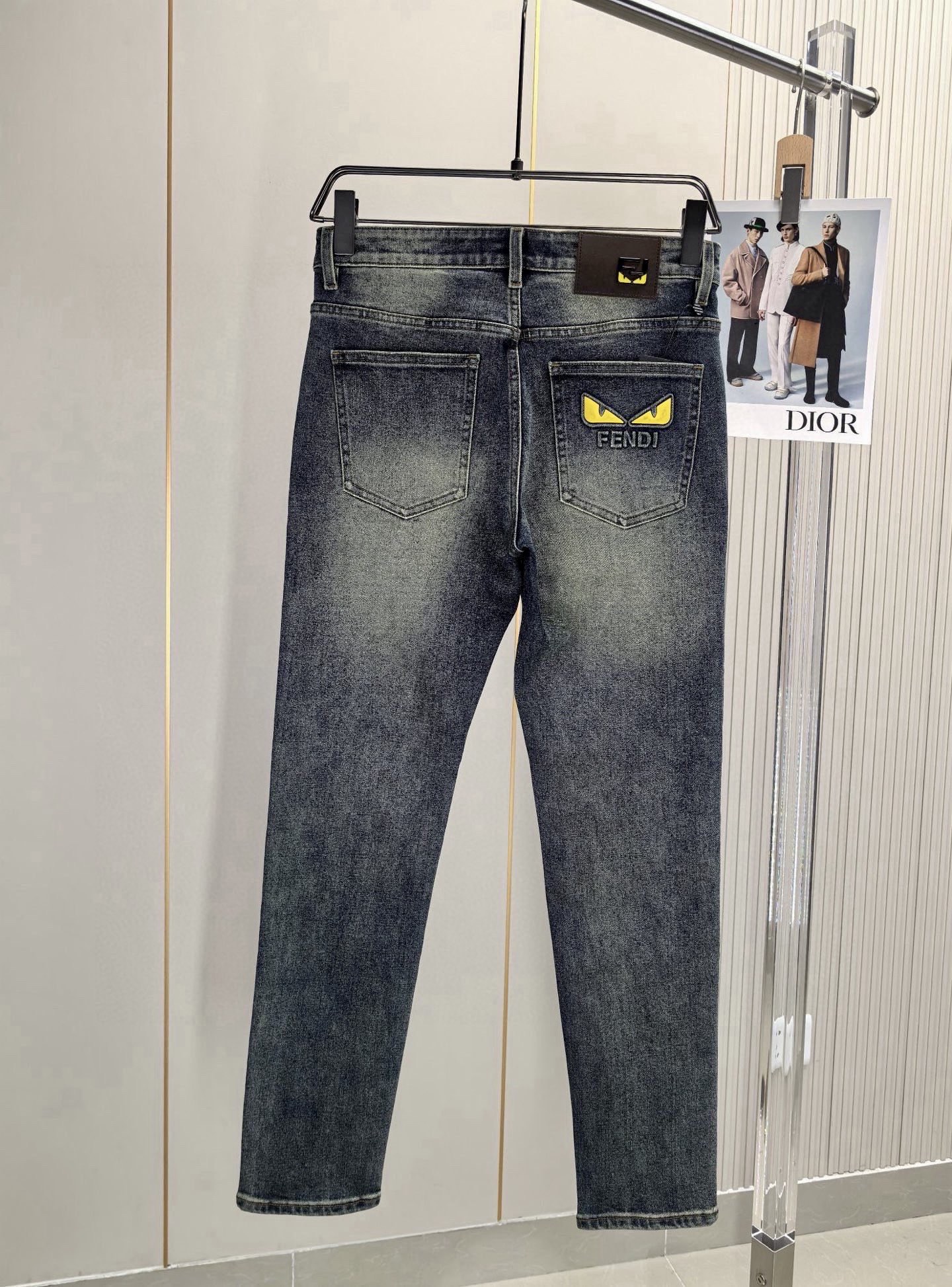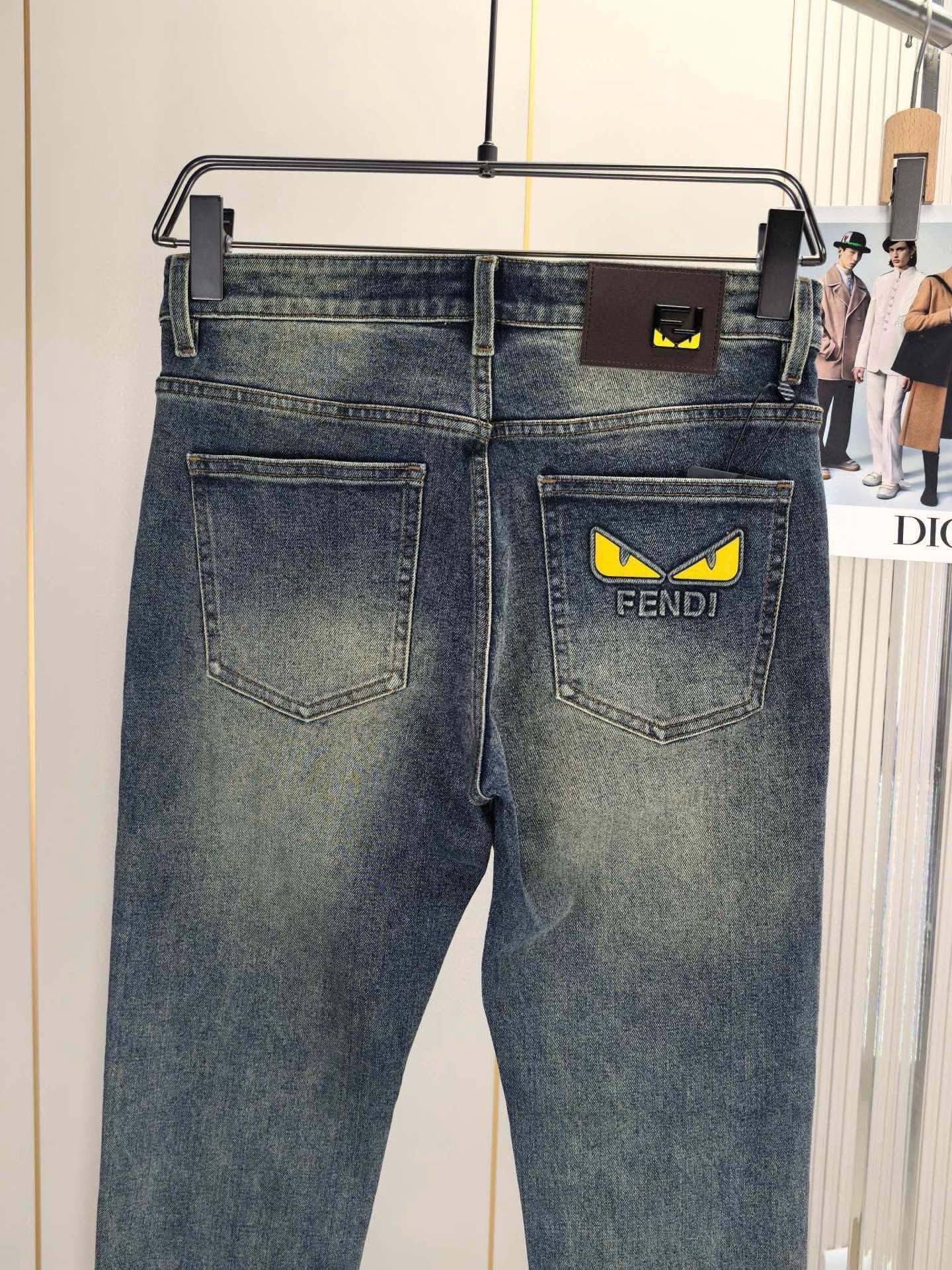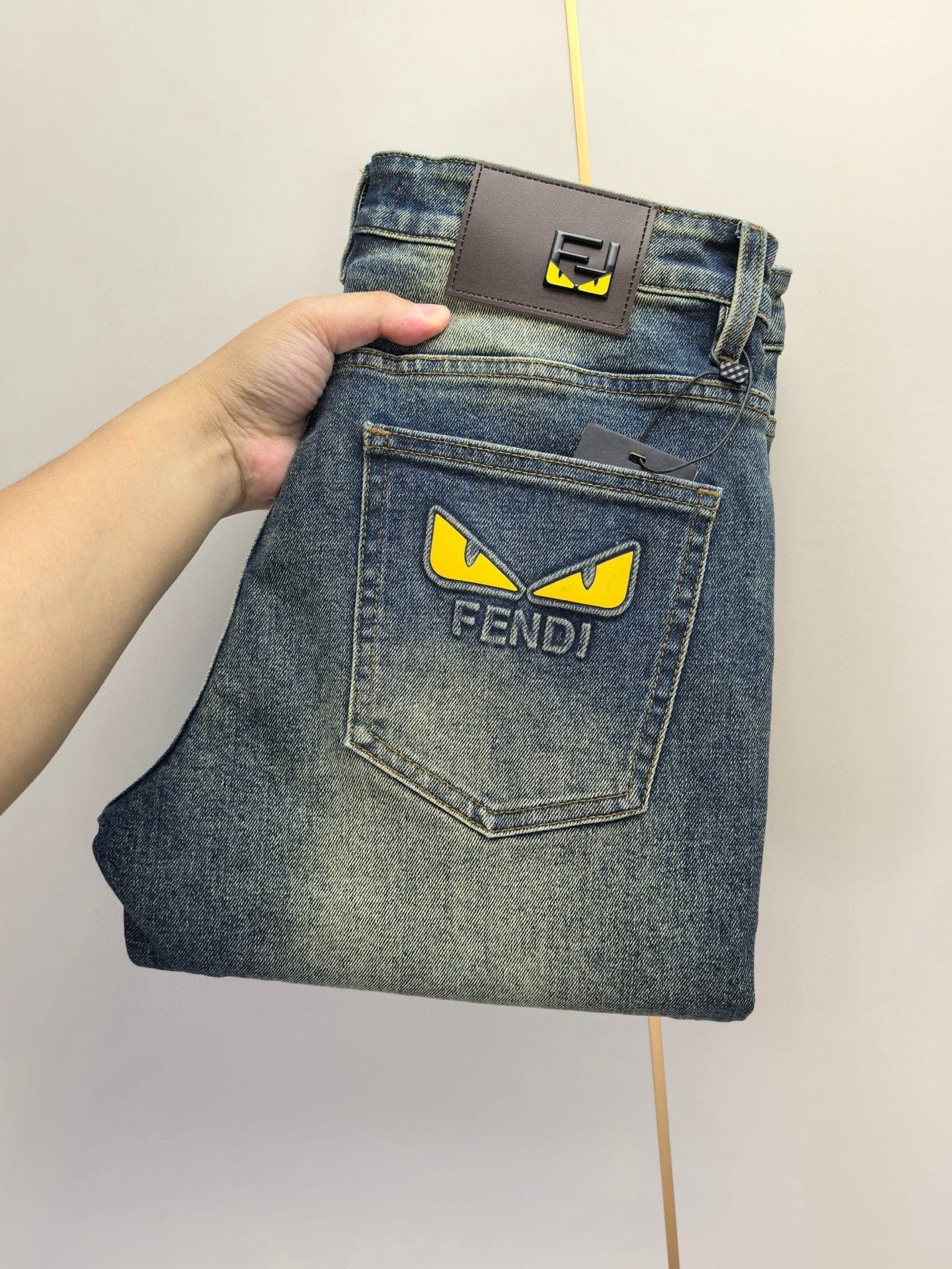 Fendi 2025 Fall/Winter men's jeans. Heavy wash custom denim, ultra-soft & breathable. Custom metal logos. Simple design. Sizes 29-38.