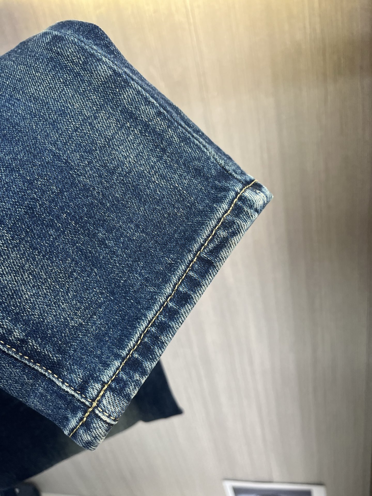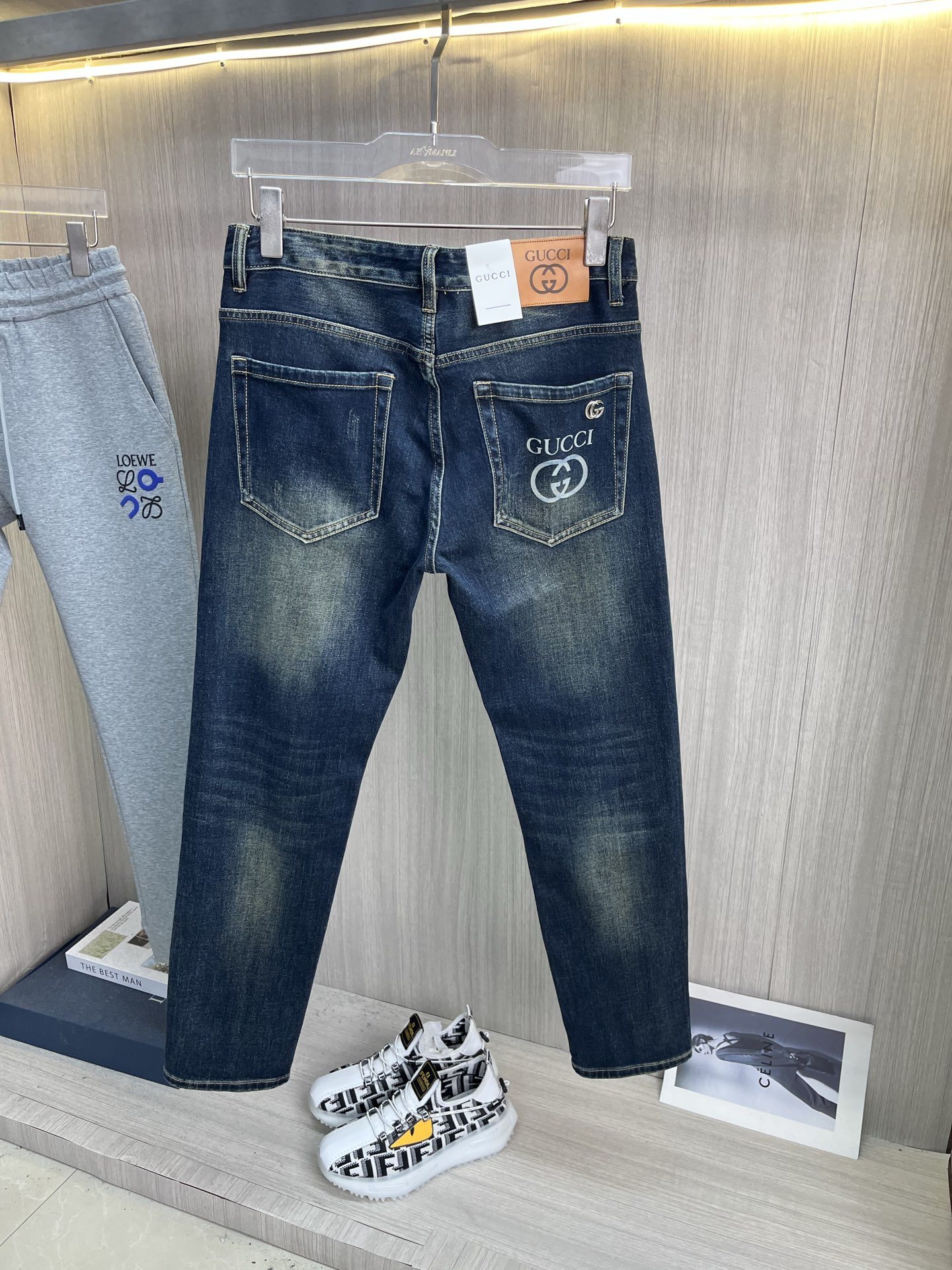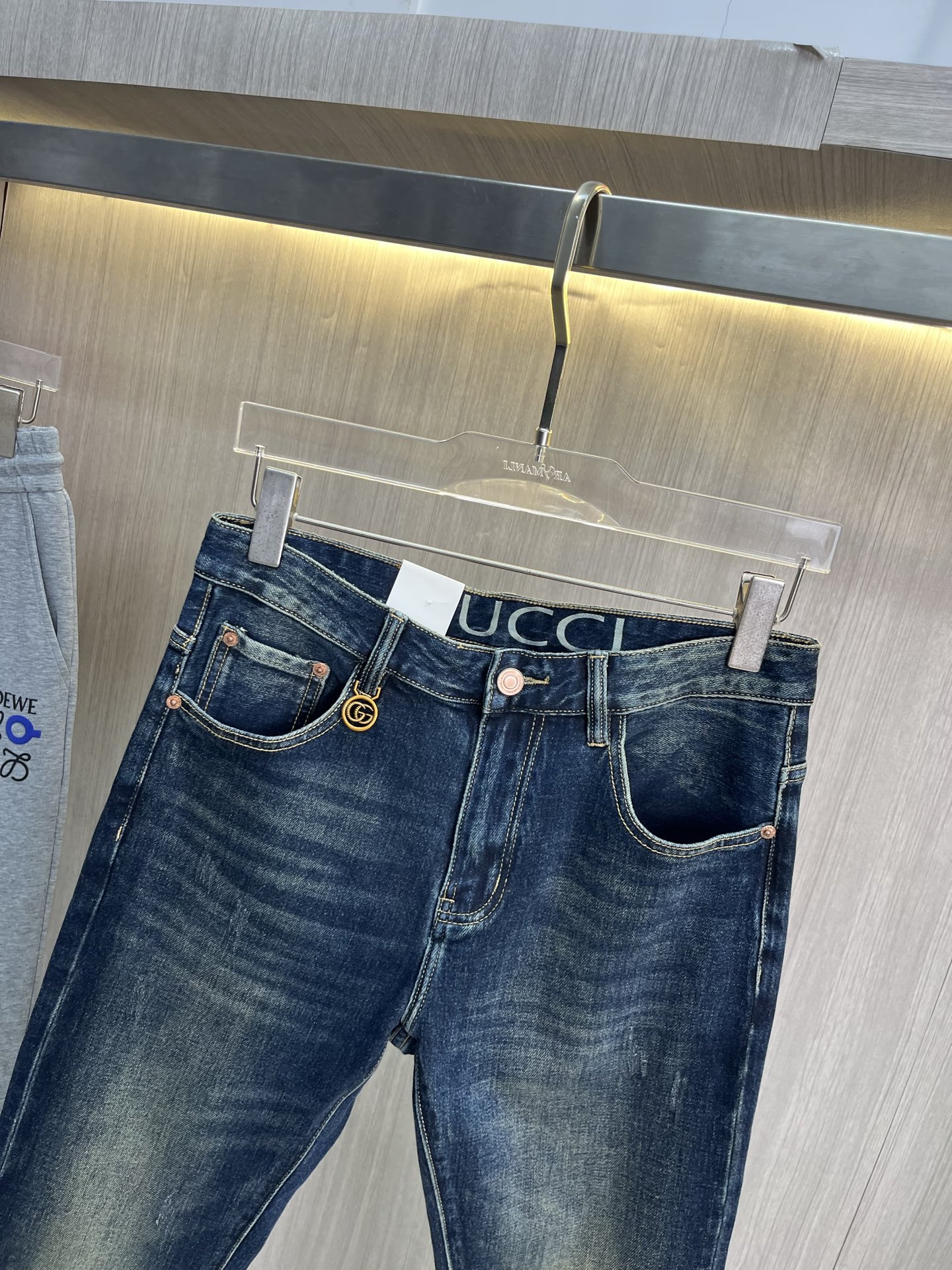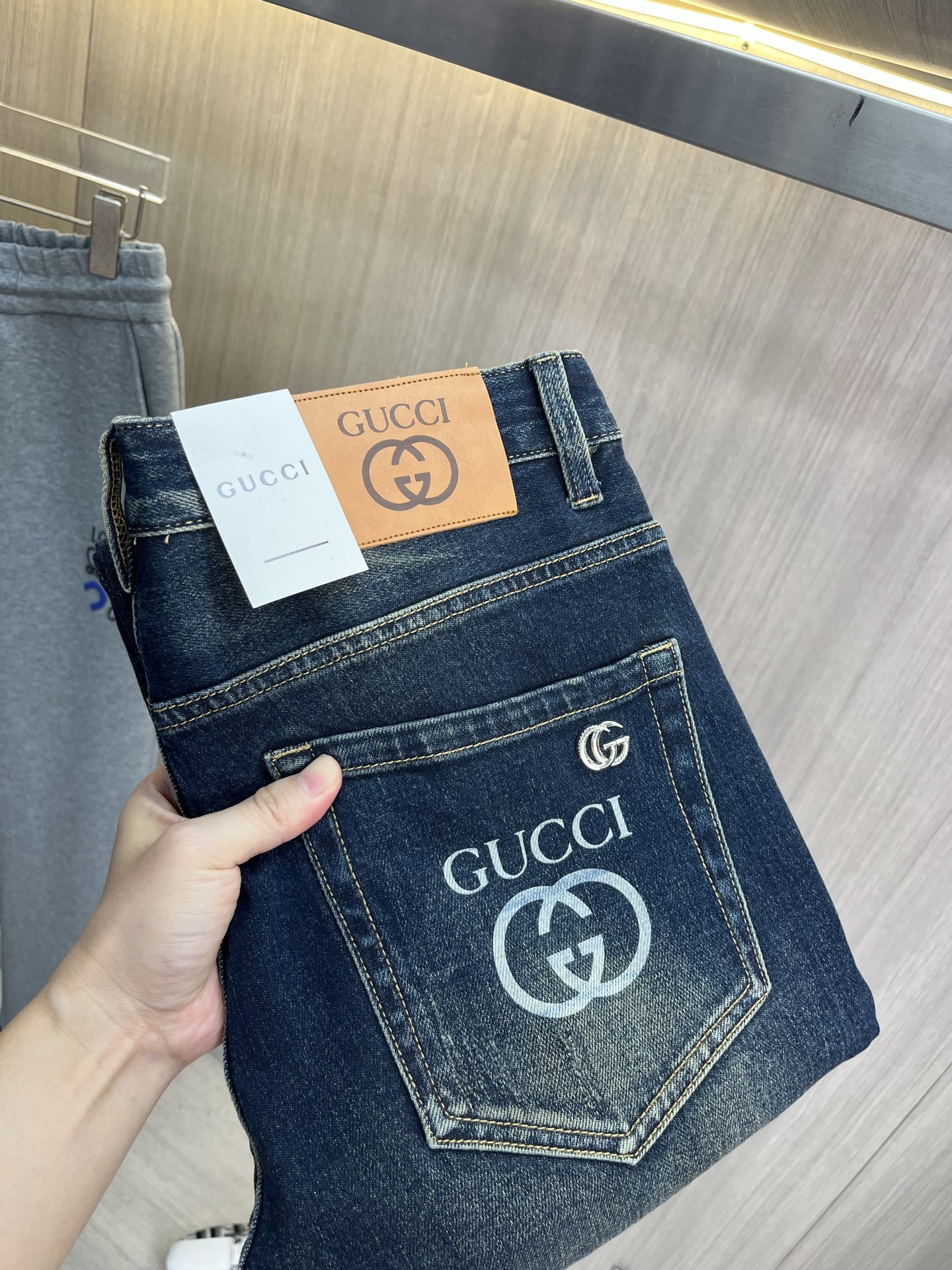 GUCCI 2025 men's jeans. Stretchy denim, yeast wash, imported fabric, metal hardware, leather label. Sizes 28-38. Next-day shipping.