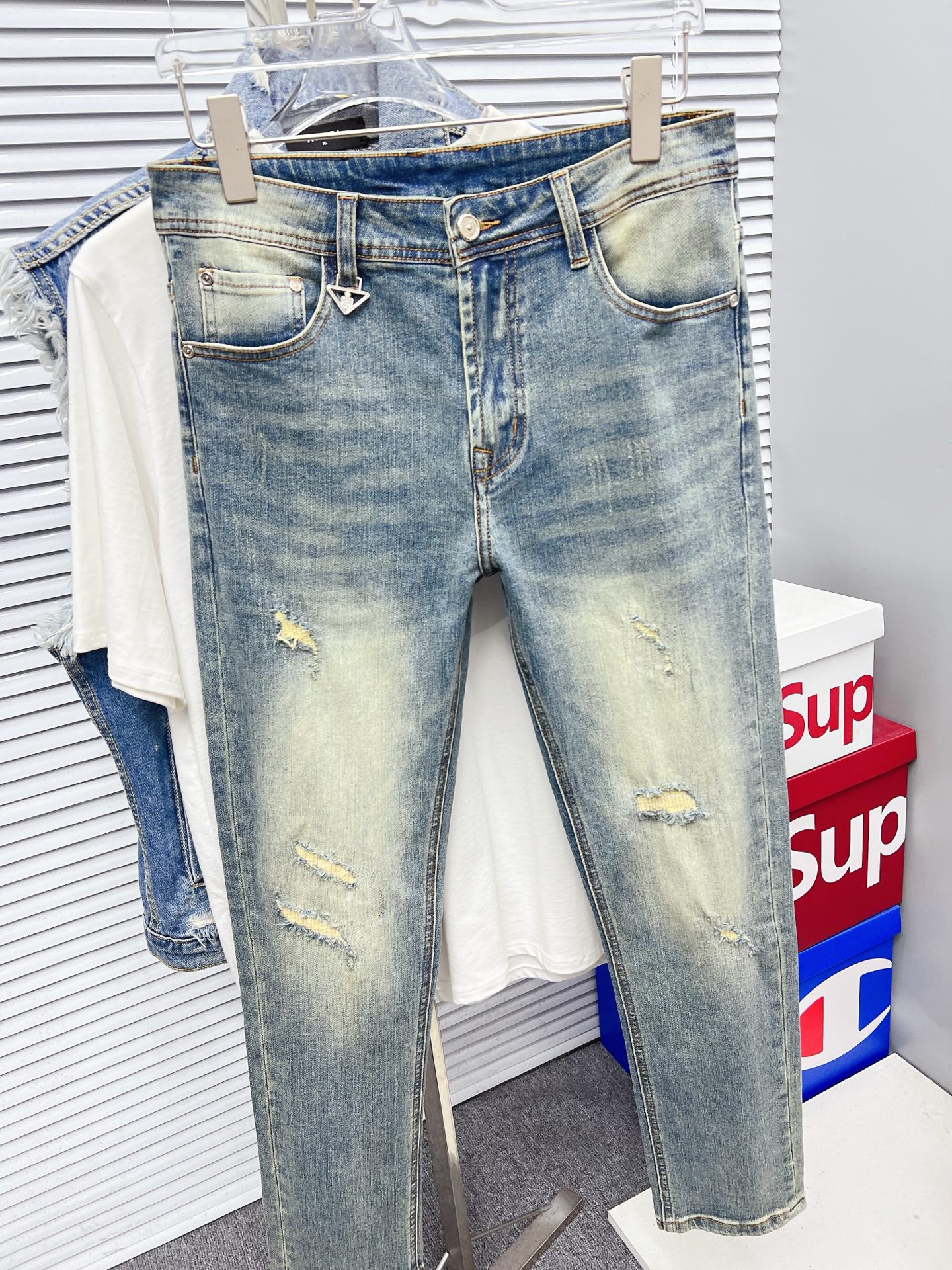 Prada men's denim jeans. Premium Japanese 13oz fabric, eco-enzyme wash for soft retro finish. Perfect fit, brand details, sizes 29-40 (excl 35,37).