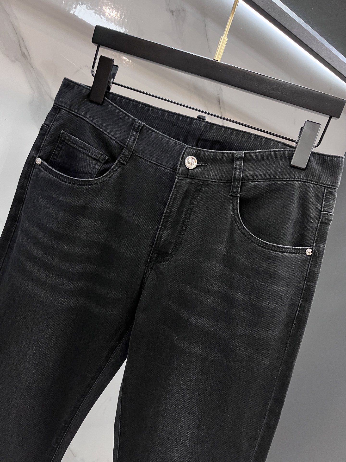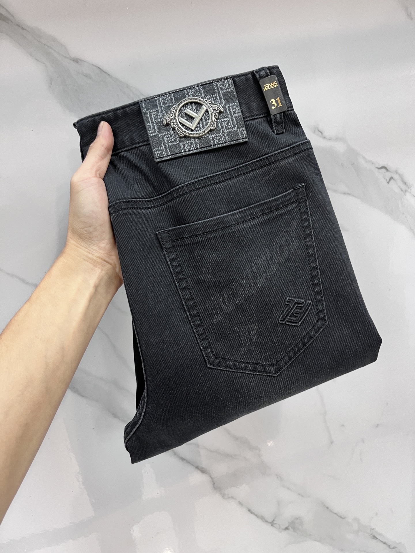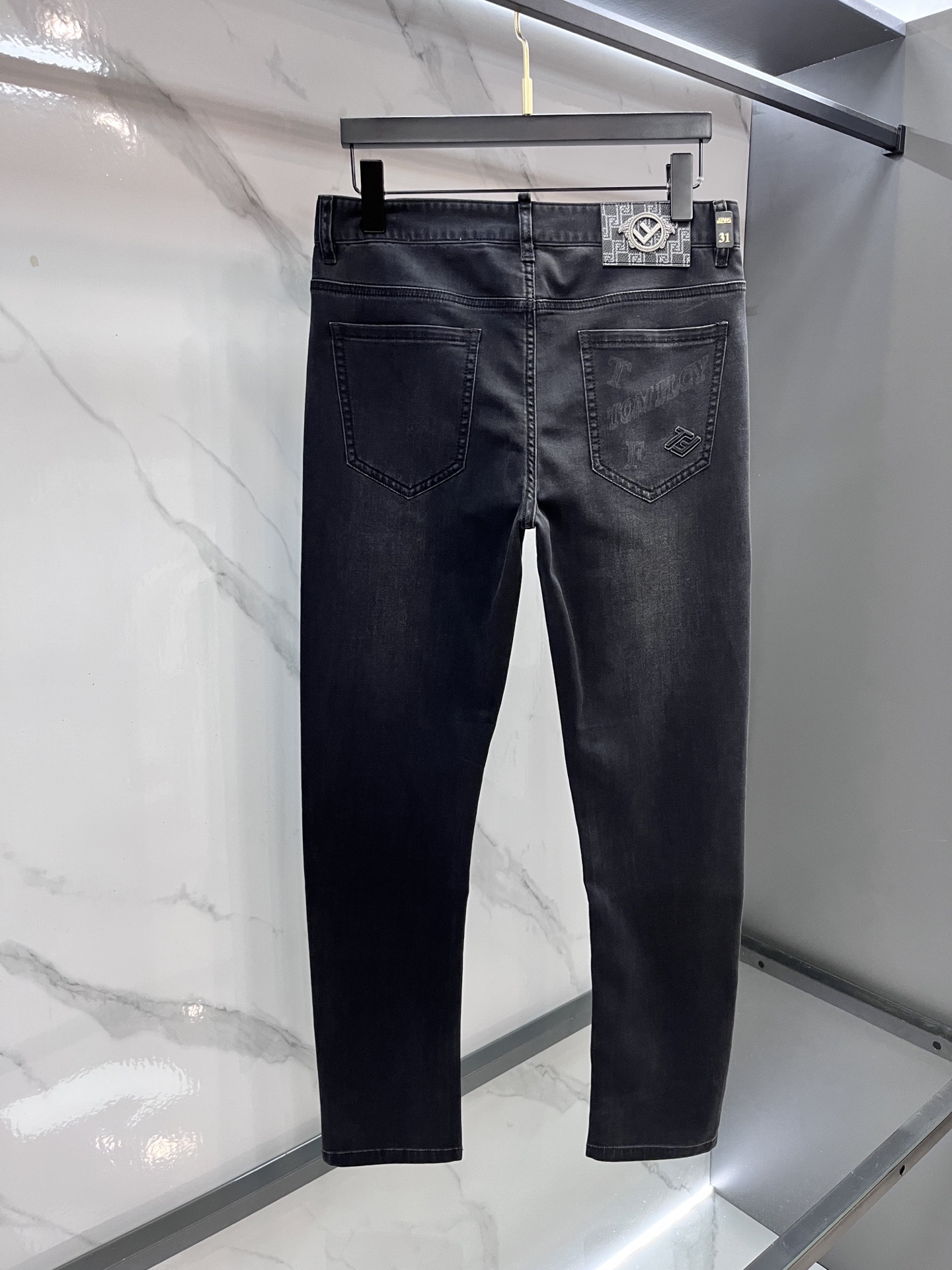 Fendi 2025SS men's lightweight jeans. Imported denim, eco-wash, soft feel, durable. Slim straight cut, stretchy, slim fit. High-quality hardware, fine craftsmanship. Sizes 29-38.