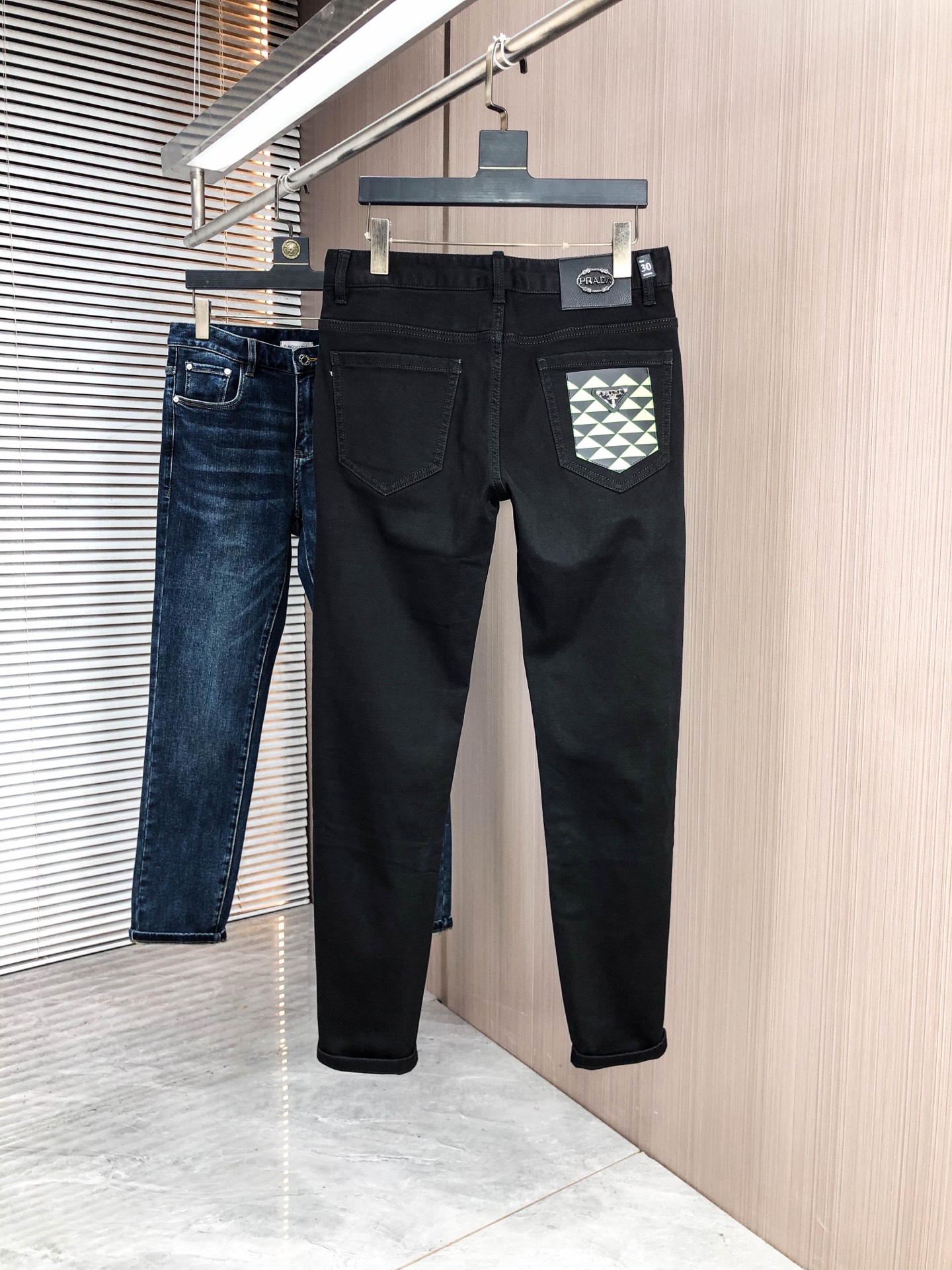 Prada slim straight jeans for autumn/winter. Stretchy, comfortable, premium. High-quality Turkish denim, enzyme washed for softness. Logo detail. Sizes 29-38.