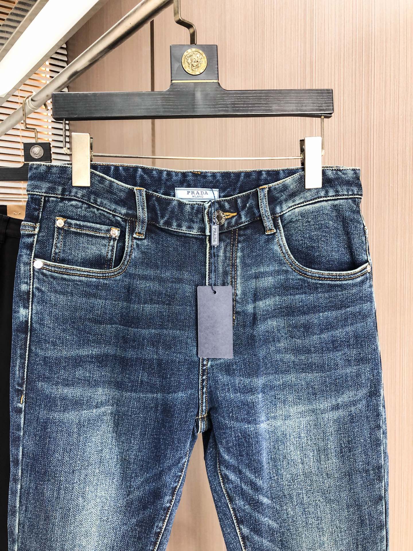 Prada slim straight jeans for autumn/winter. Stretch denim, enzyme wash for softness. Turkish cotton, iconic logo. Sizes 29-38.