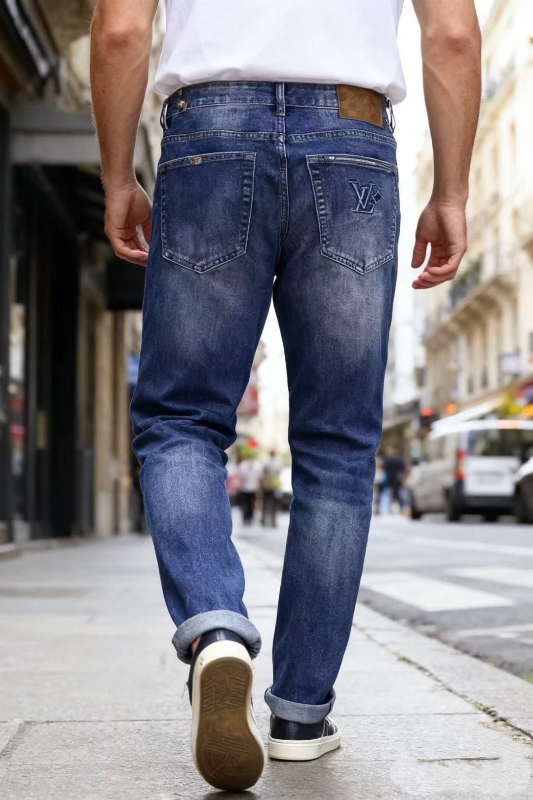 Louis Vuitton 2025 Fall high-end men's jeans. Comfortable, luxurious fit with brand logo. Premium denim, soft wash. Sizes 29-38, no 35/37. Ships next day.