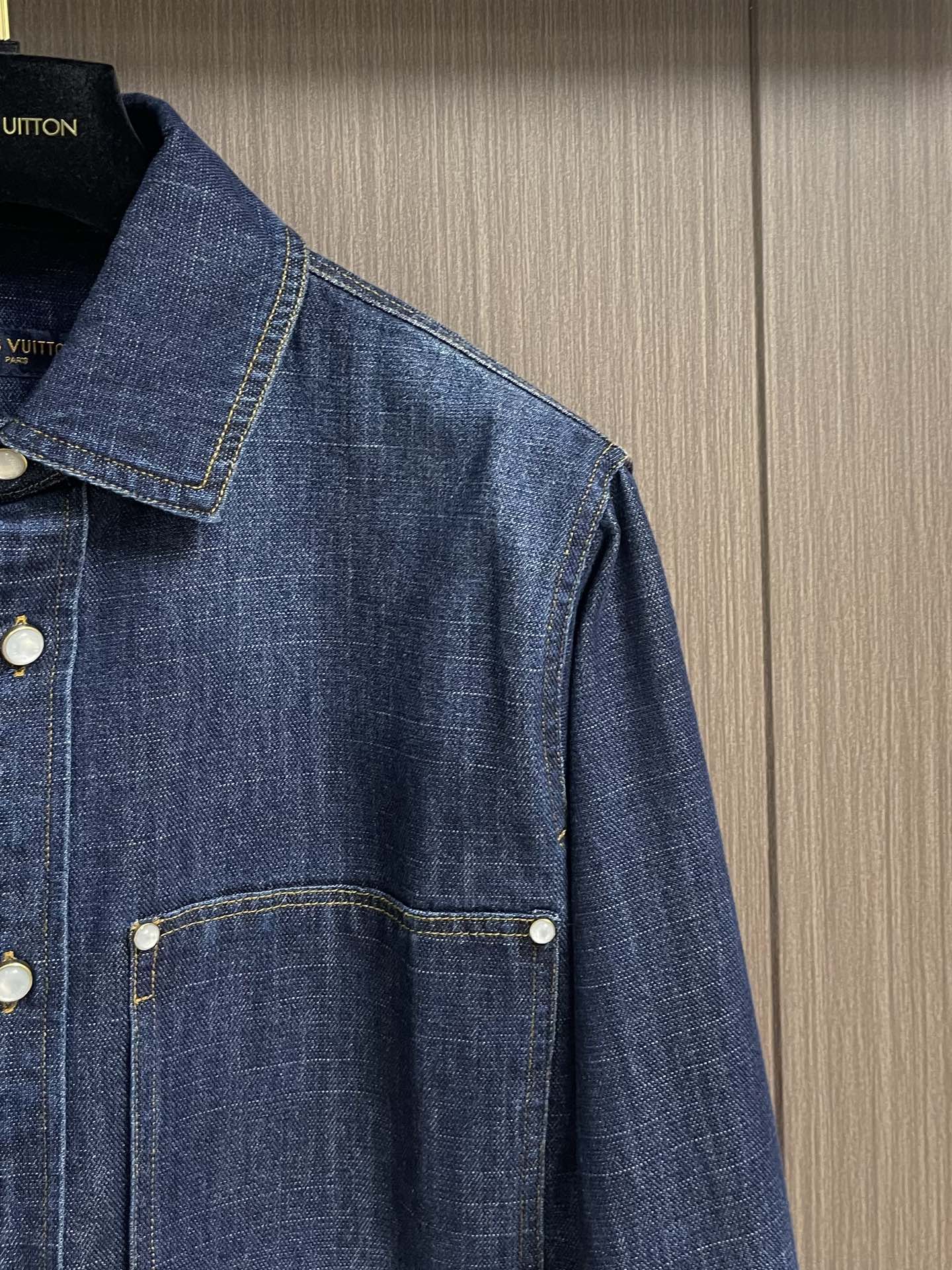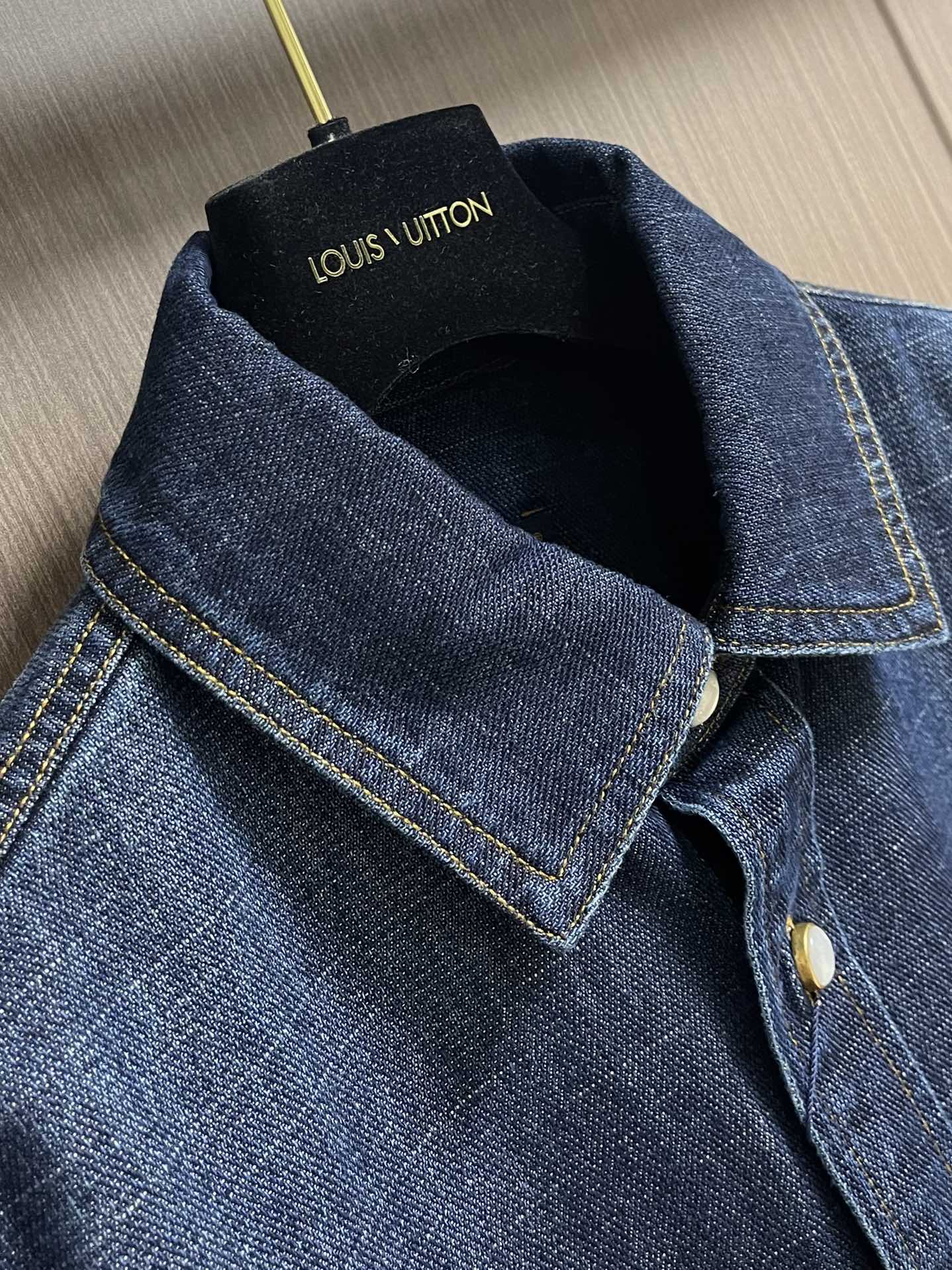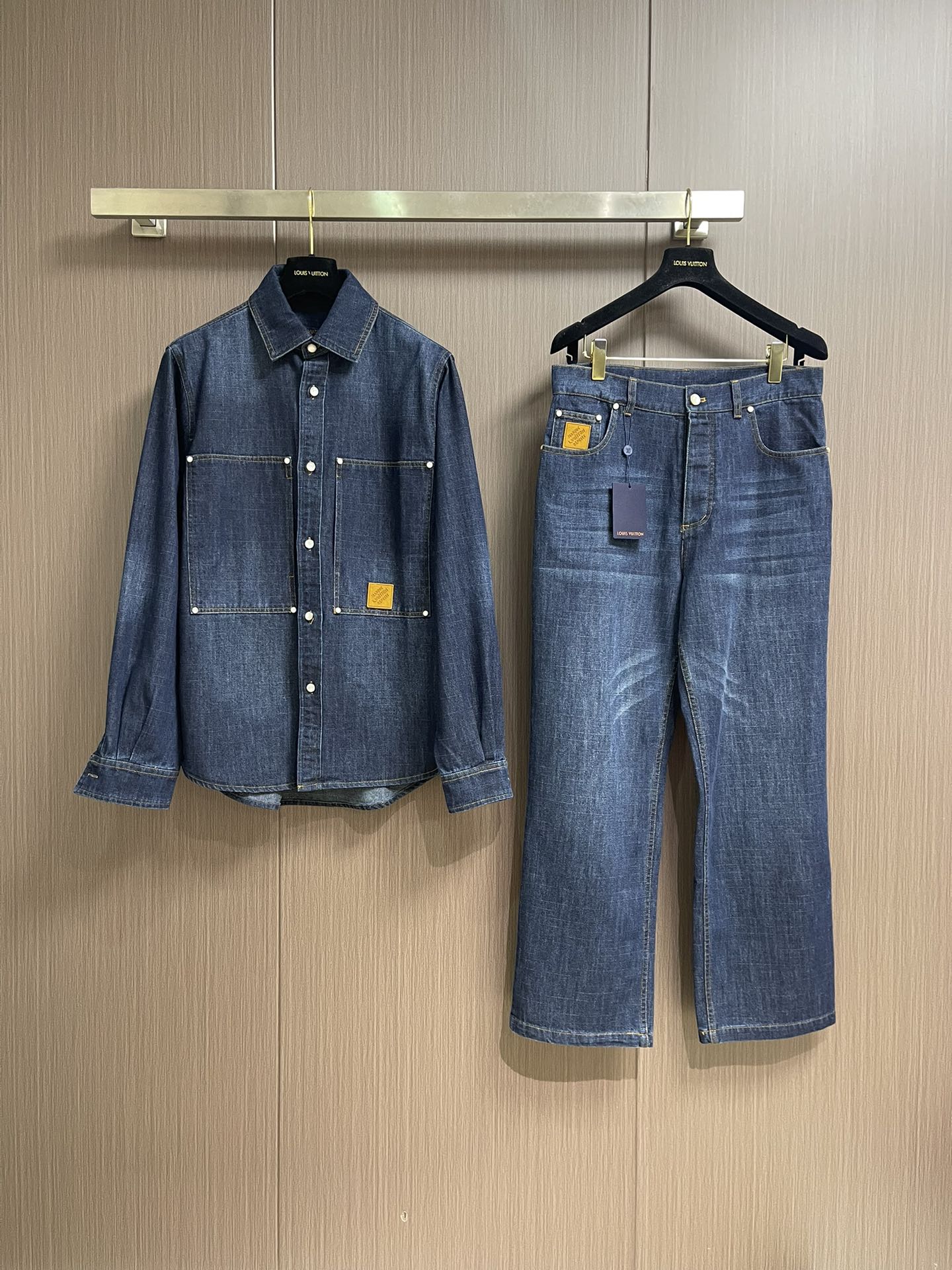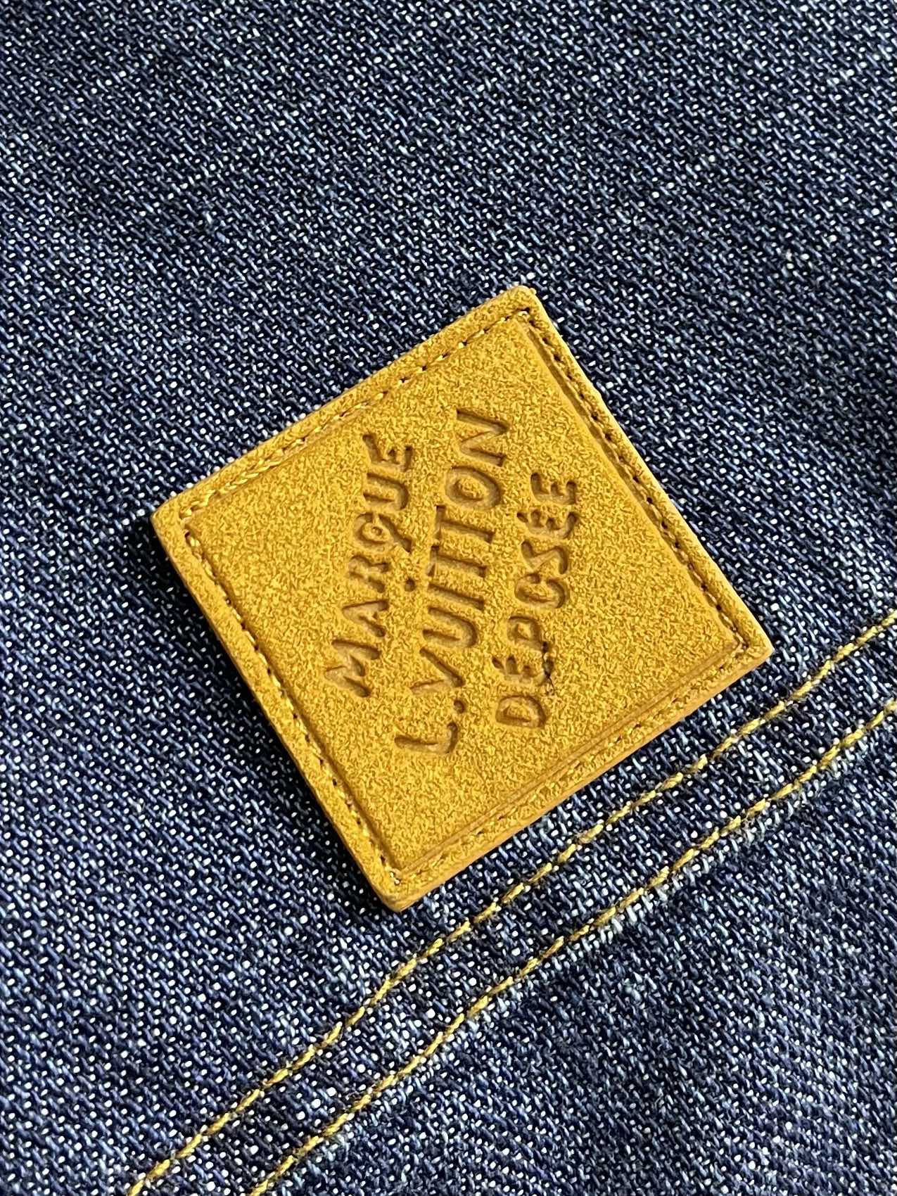 LV denim jacket & jeans set. Cotton denim, loose fit, sun-faded effect for SS 2025. Suede patch, pearl buttons, studs. Sizes S-XL.