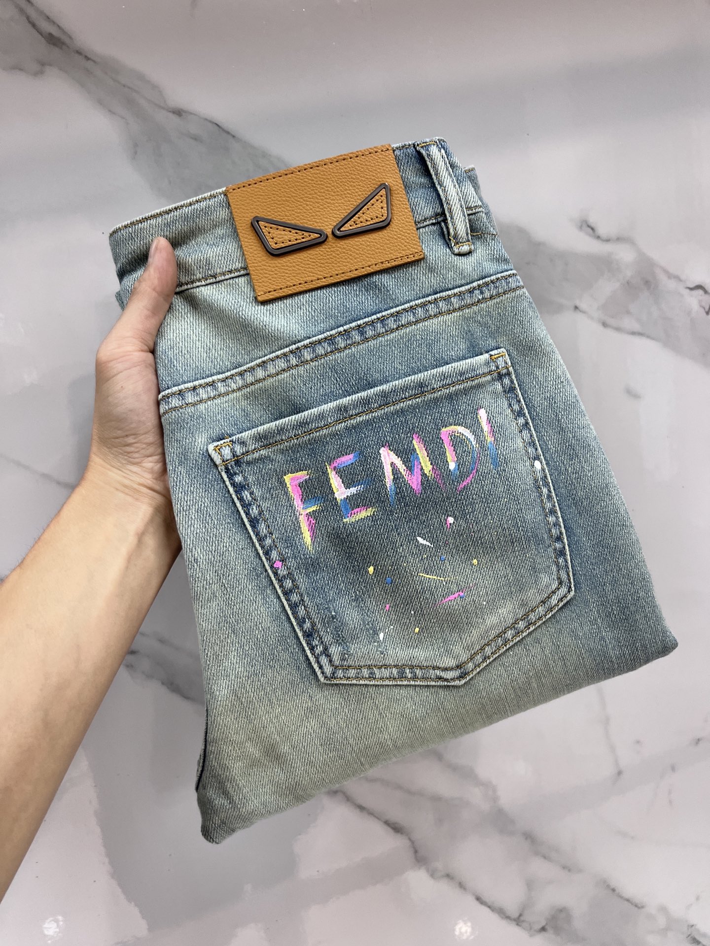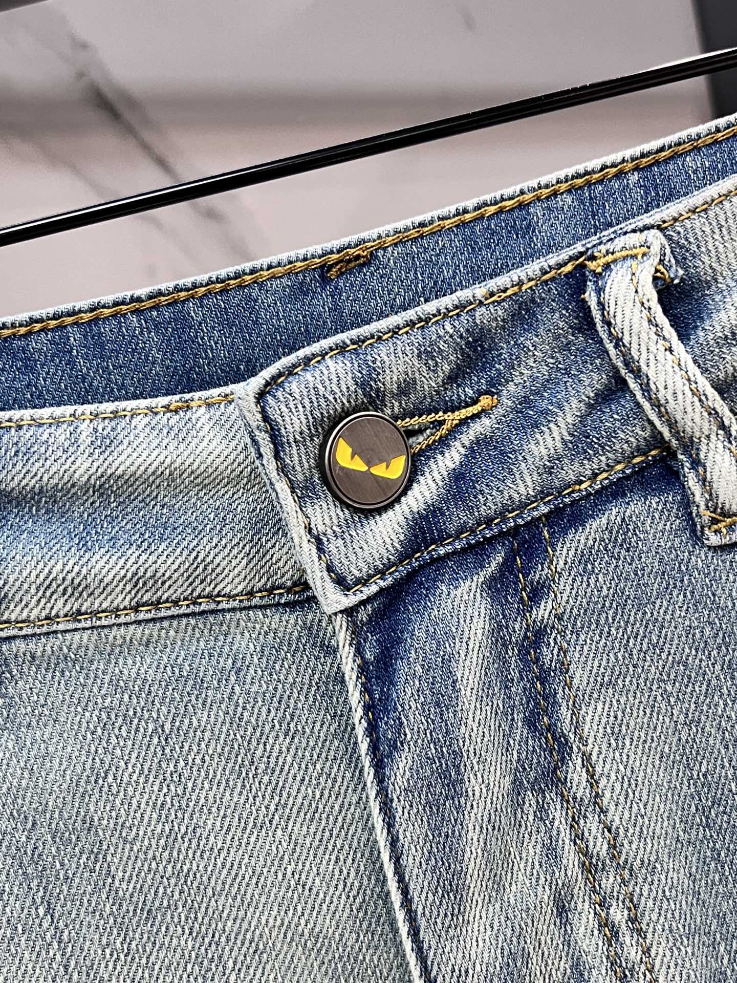 Fendi 2025SS lightweight distressed jeans. Imported stretch denim, comfortable & breathable. Metal hardware, flattering fit. Sizes 29-38.