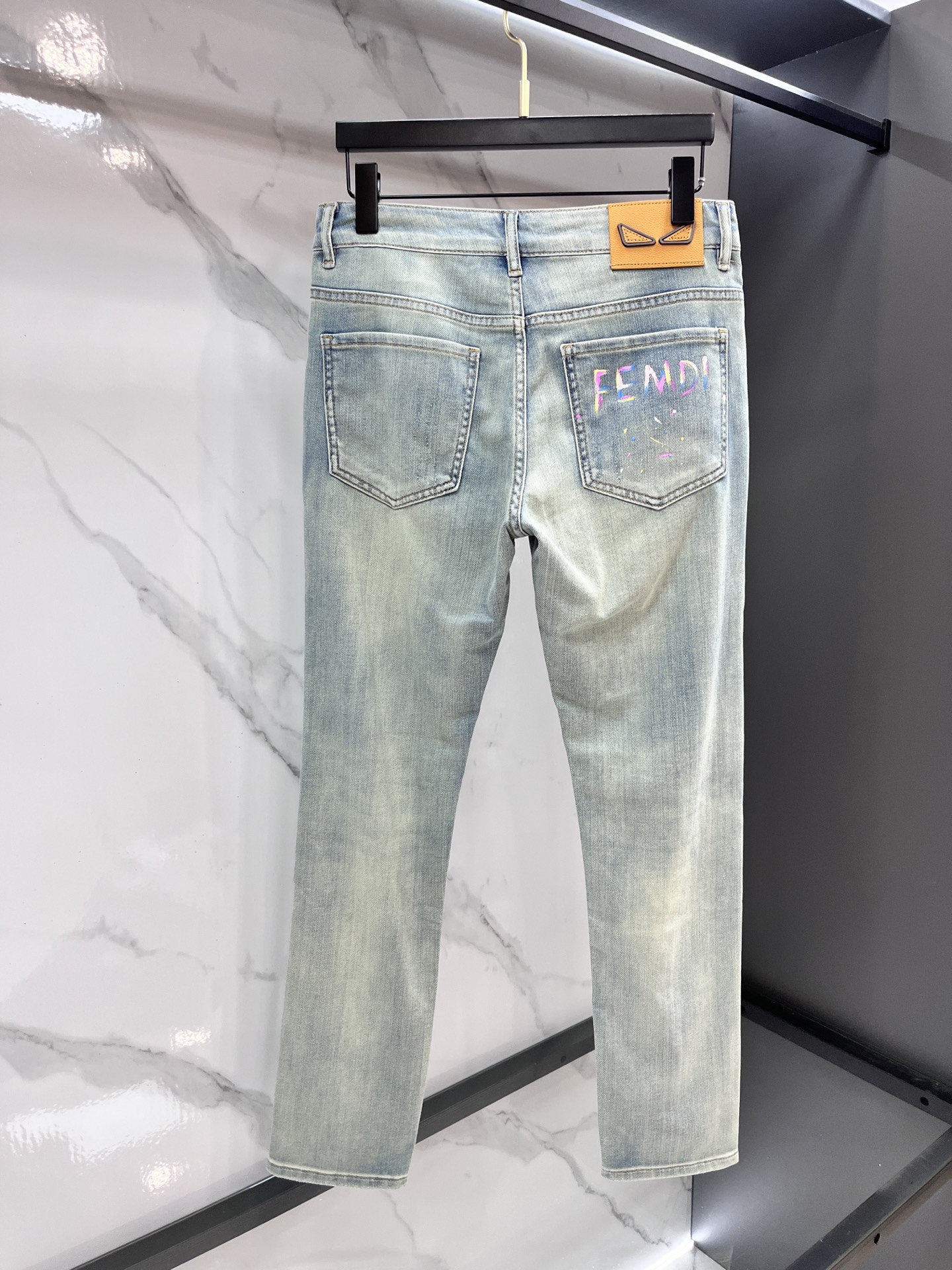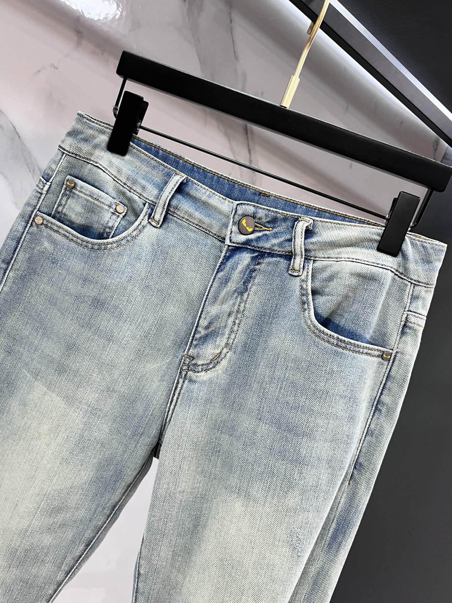 Fendi 2025SS early spring lightweight distressed jeans. Stretchy, comfortable imported fabric. Metallic details. Sizes 29-38.