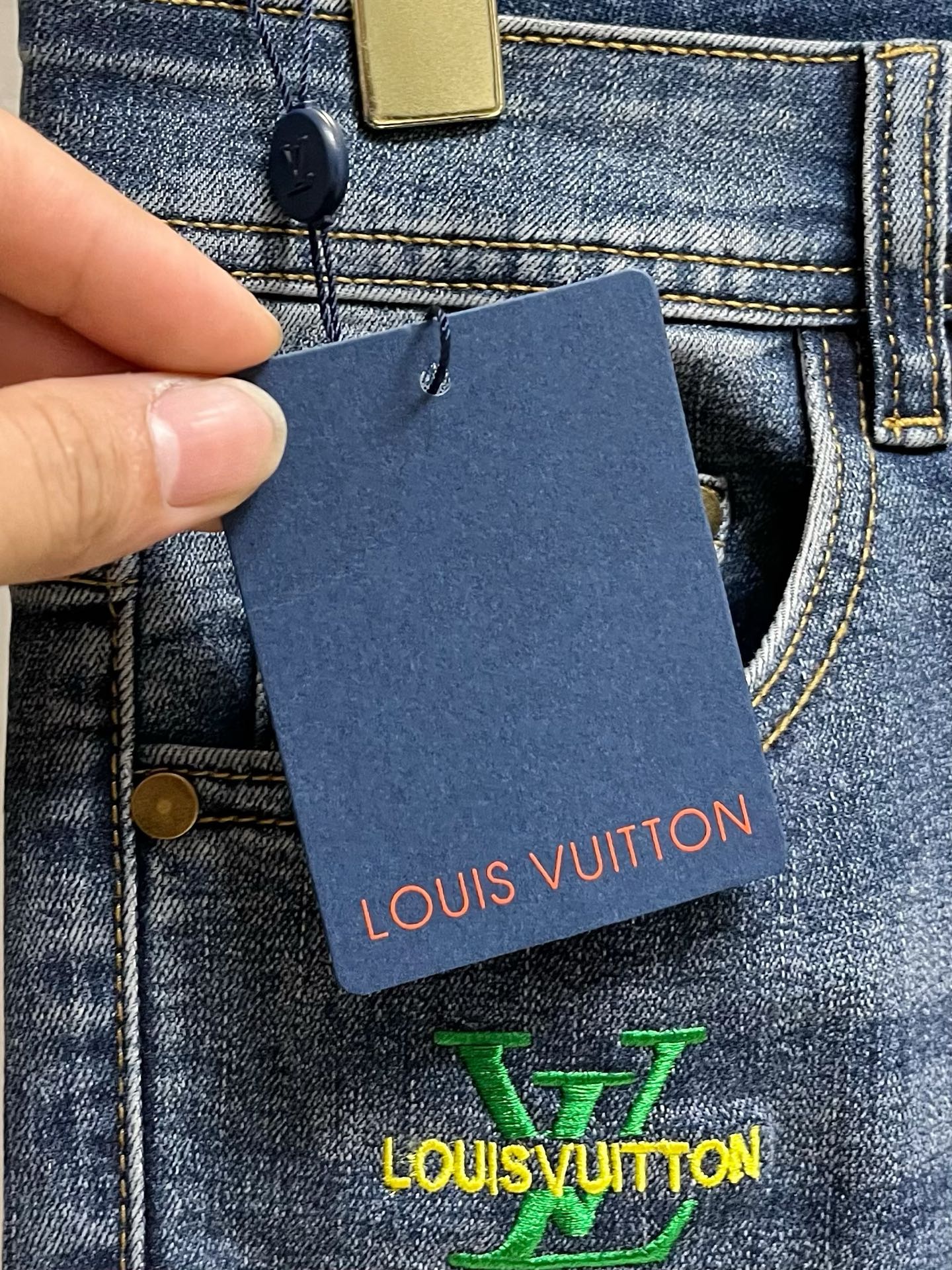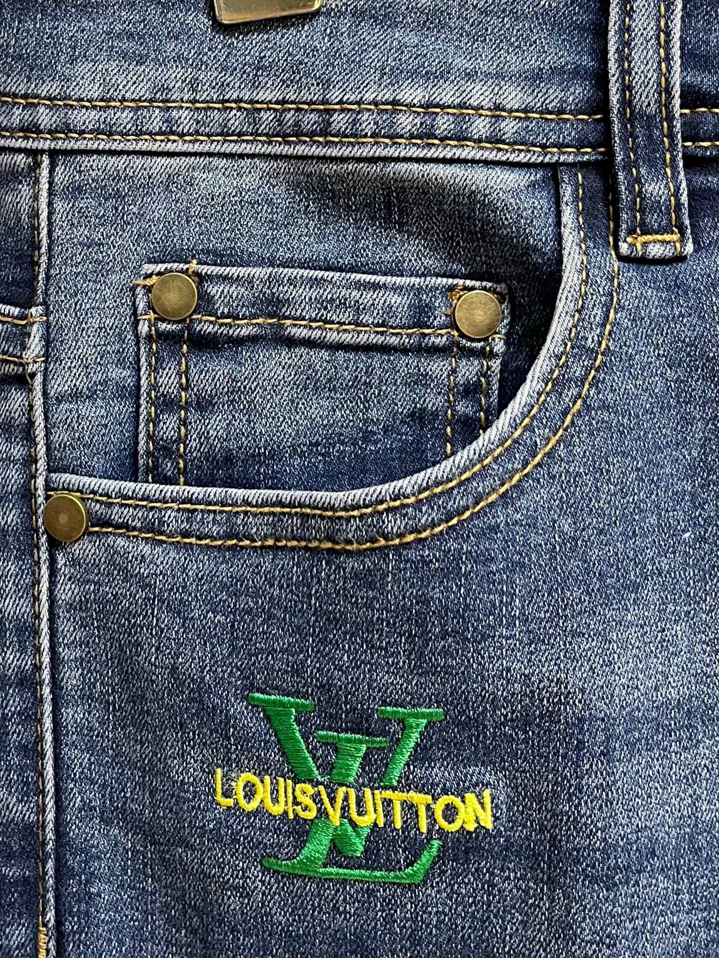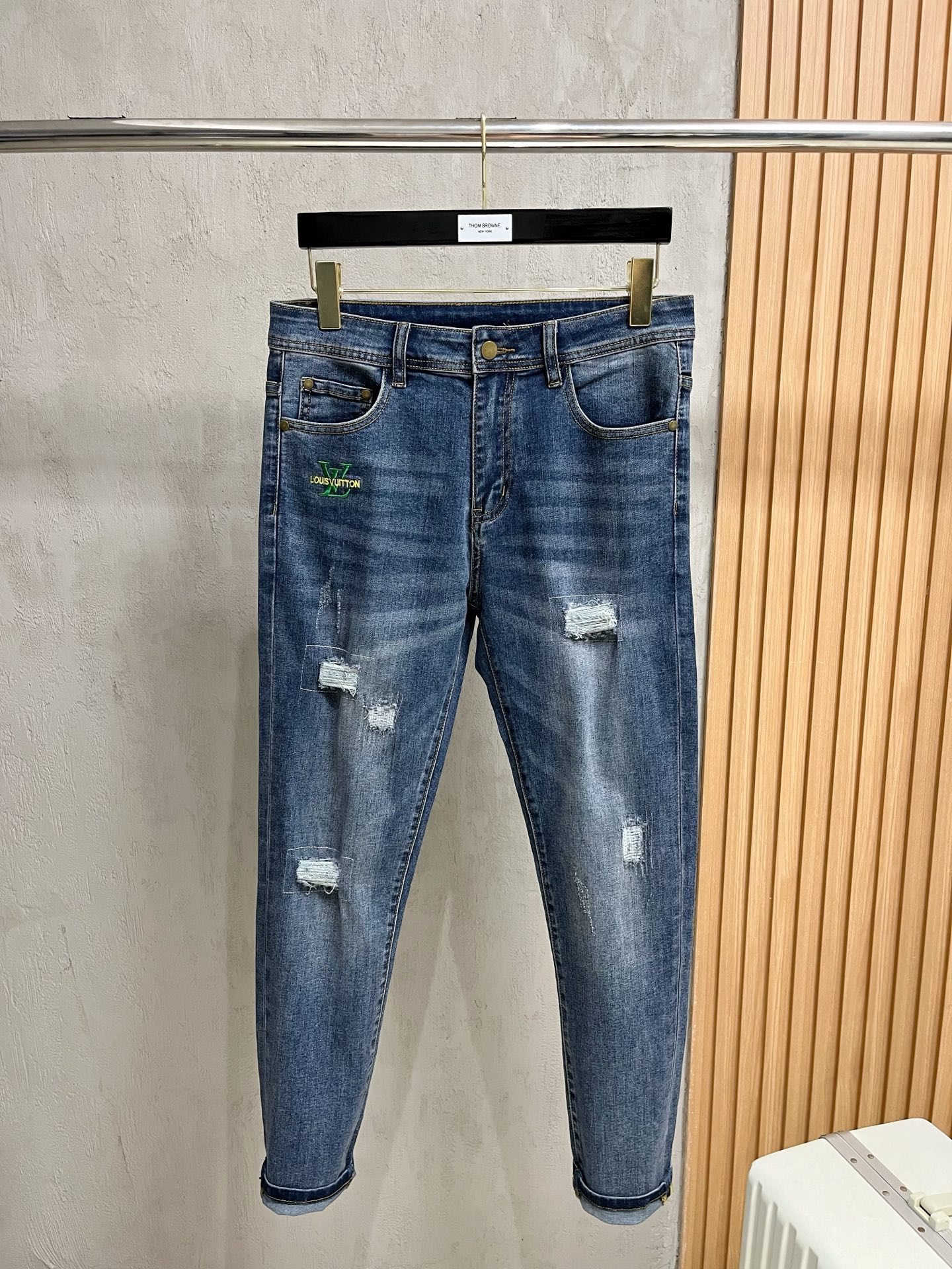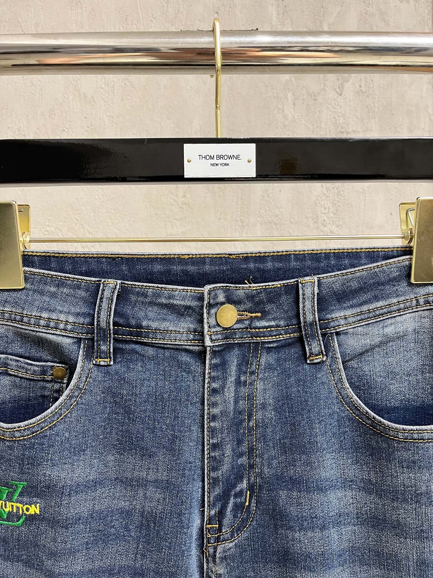 LV men's denim jeans. Imported Japanese 13oz fabric, eco-enzyme wash for soft texture & vintage hues. Perfect fit, enhances silhouette. Sizes 29-38 (no 35,37).