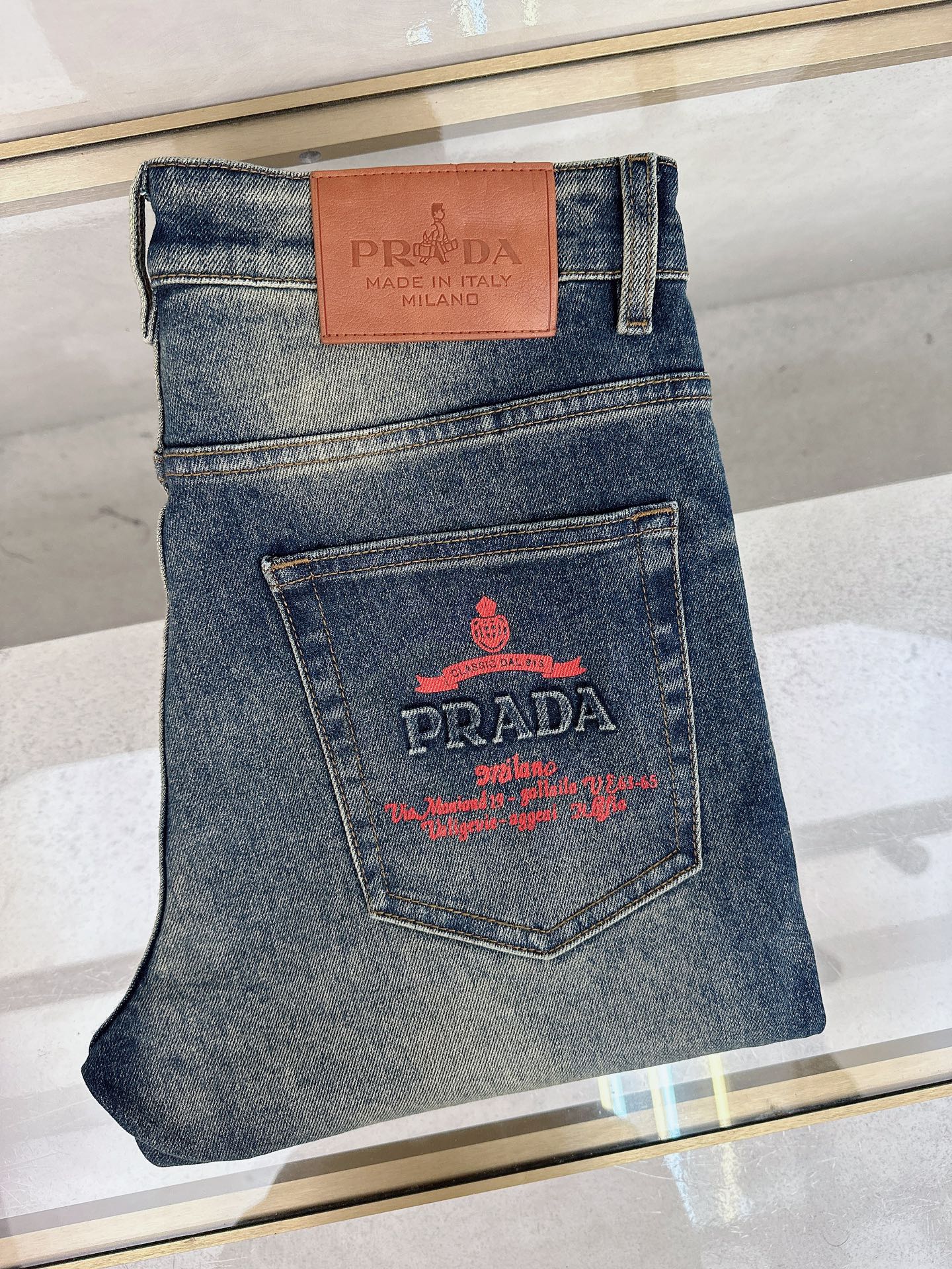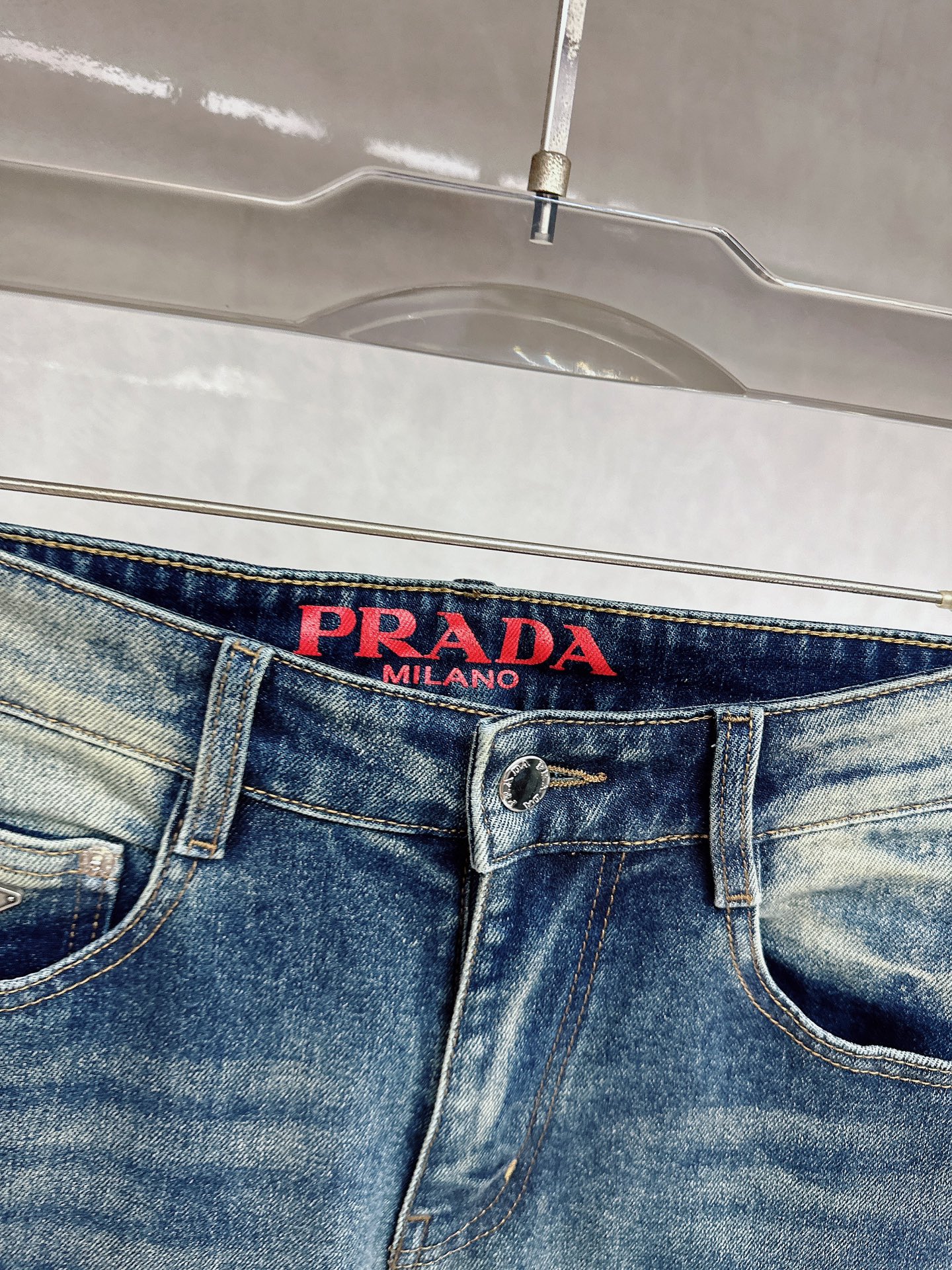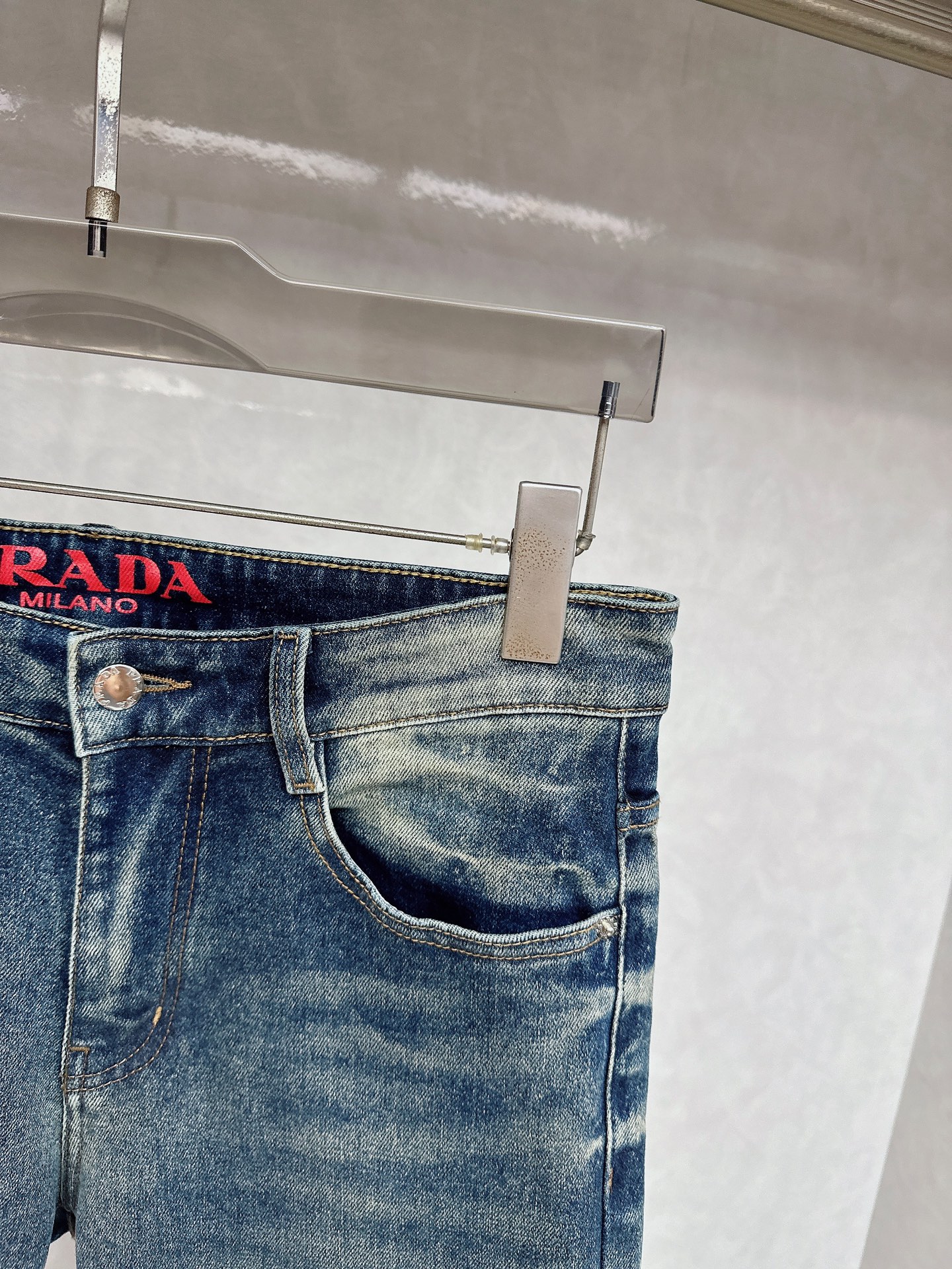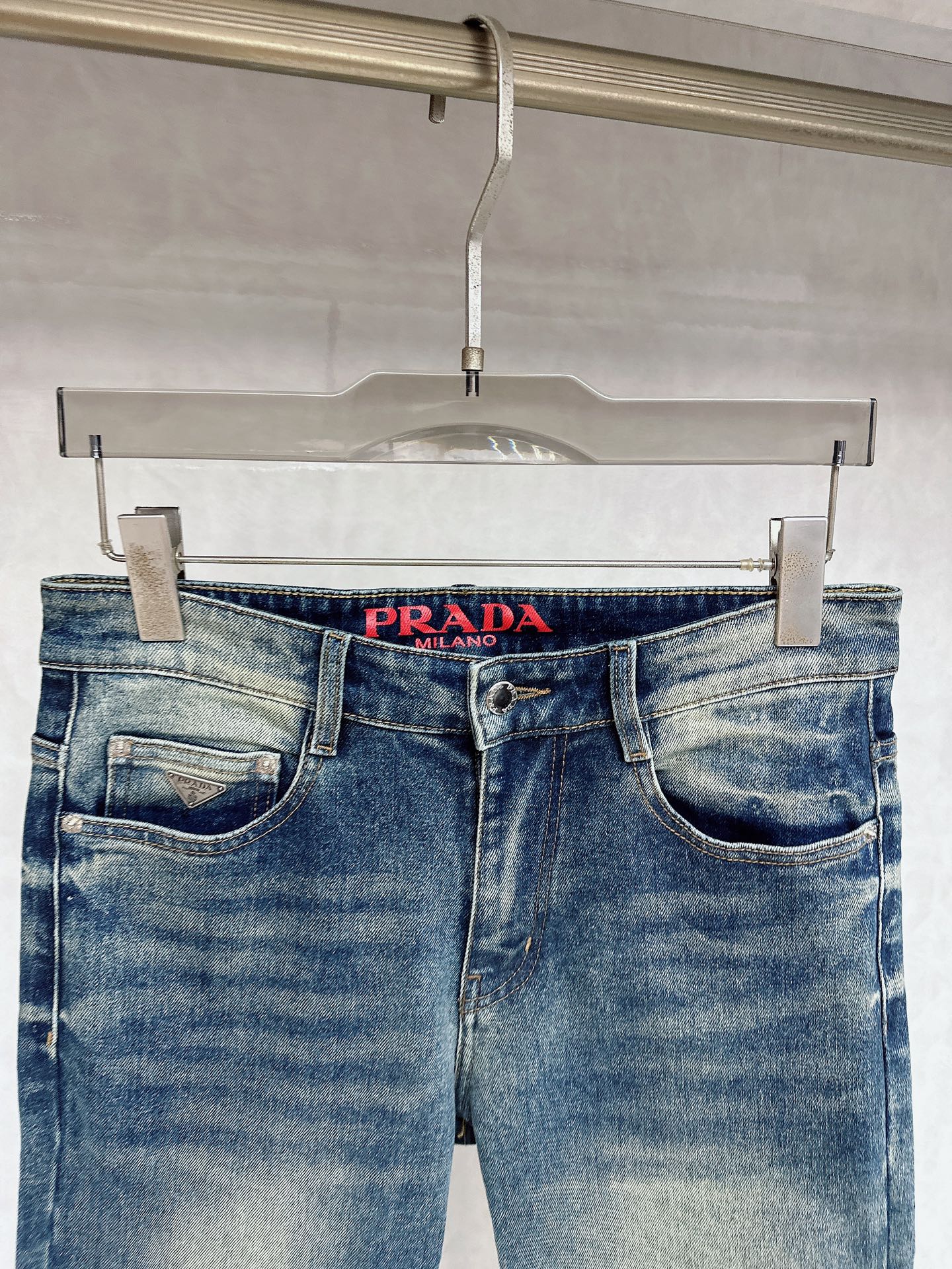 Prada 2025 Fall/Winter high-quality jeans. Slim fit, stretchy, comfortable. Classic logo, minimalist European style. Sizes 29-38.
