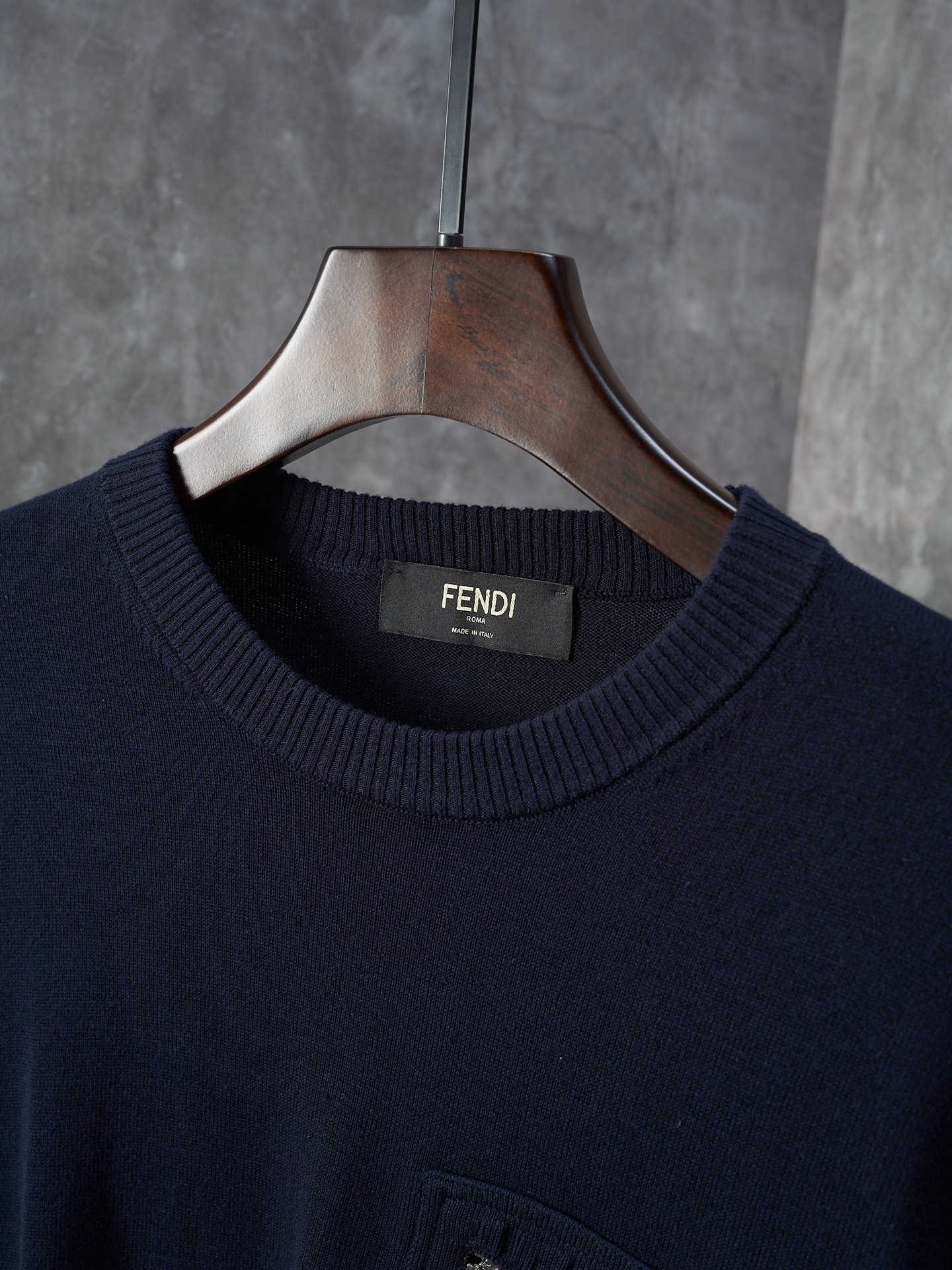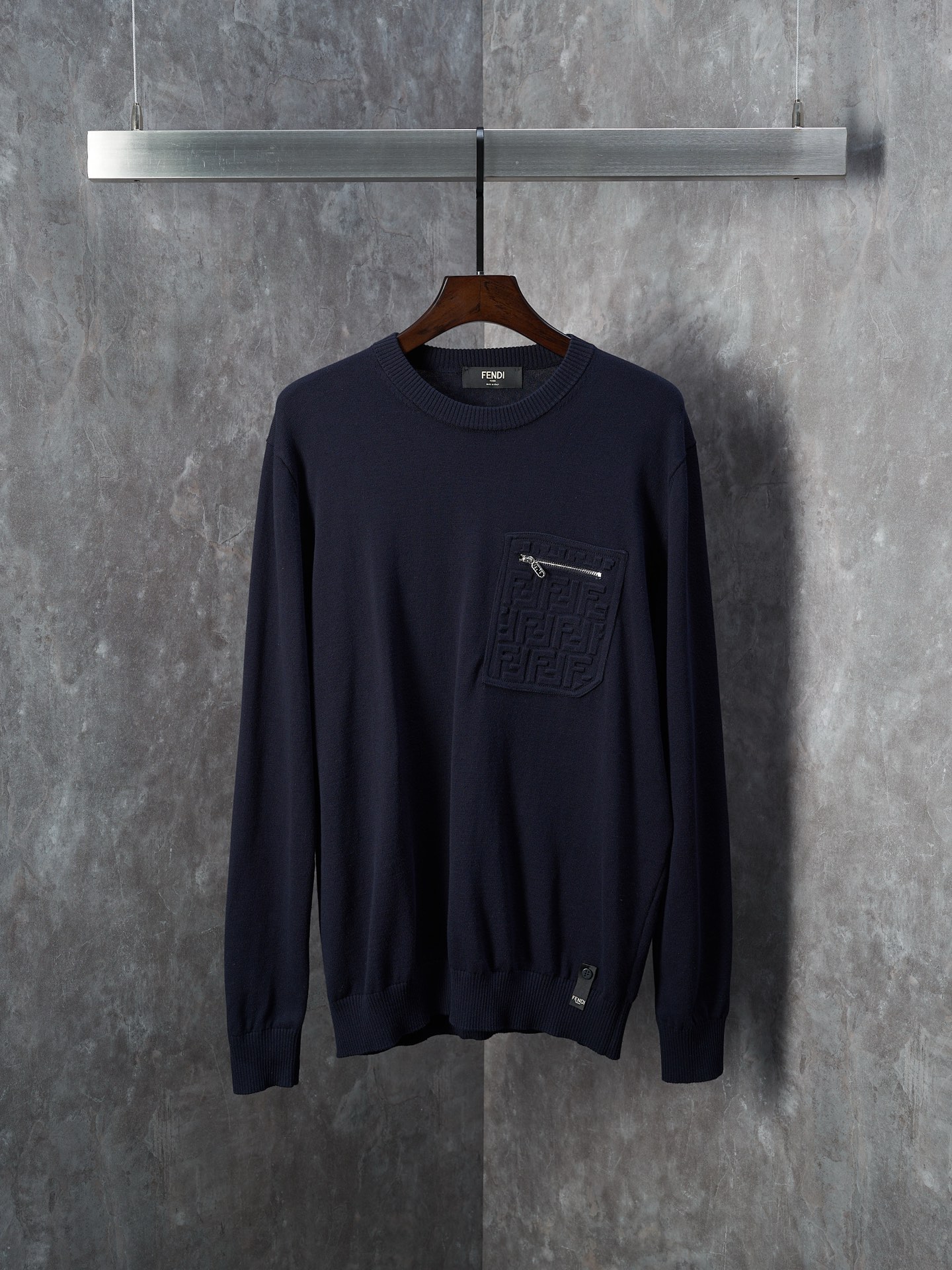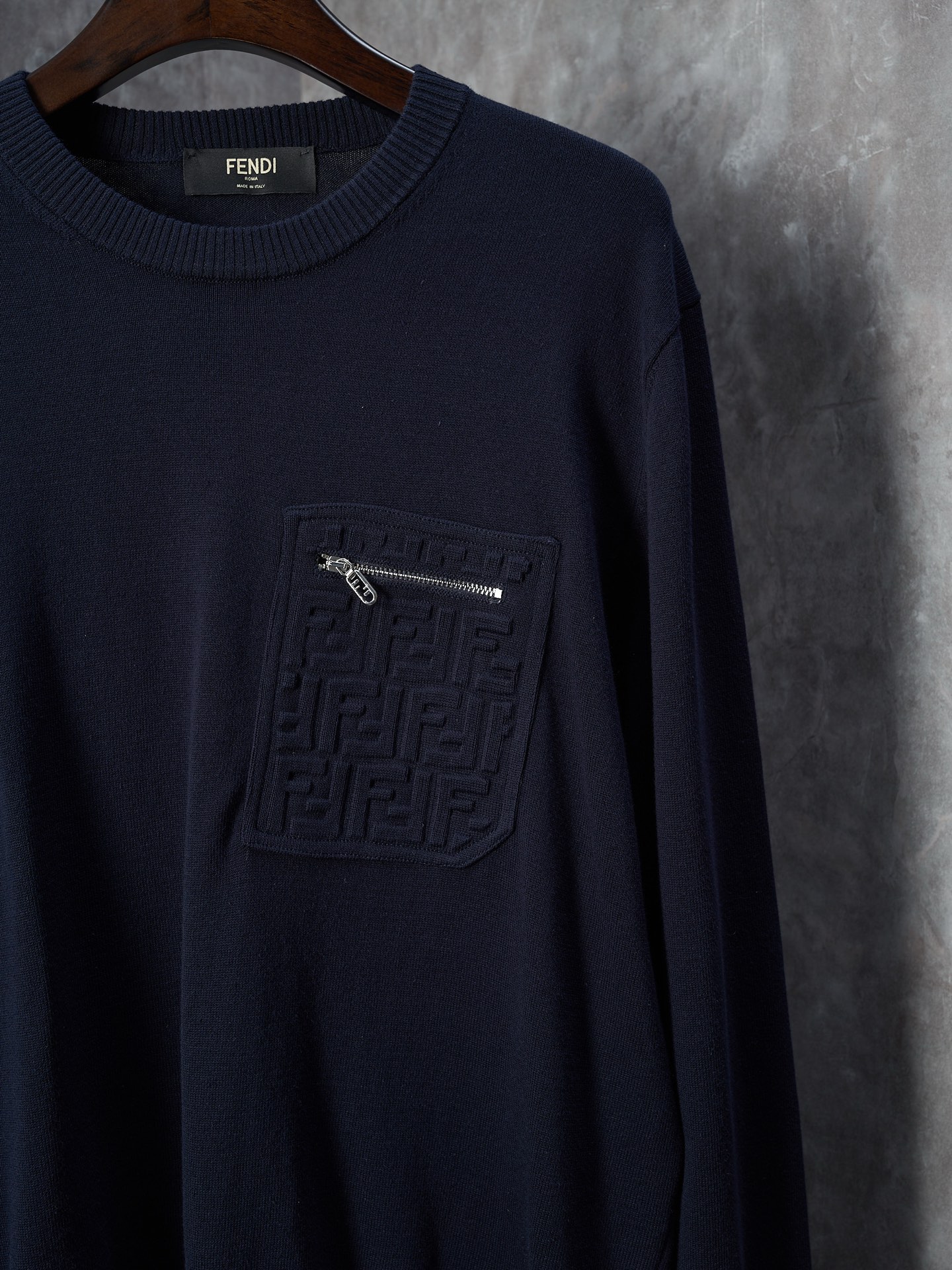 Physical Object Hanging Shot】 FENDI Navy Blue Zippered Pocket Embroidered Round Neck Sweater