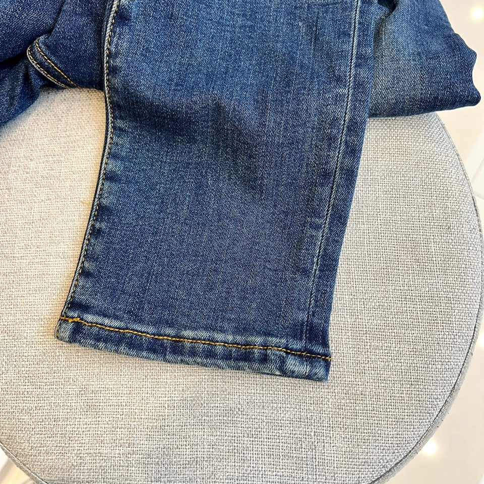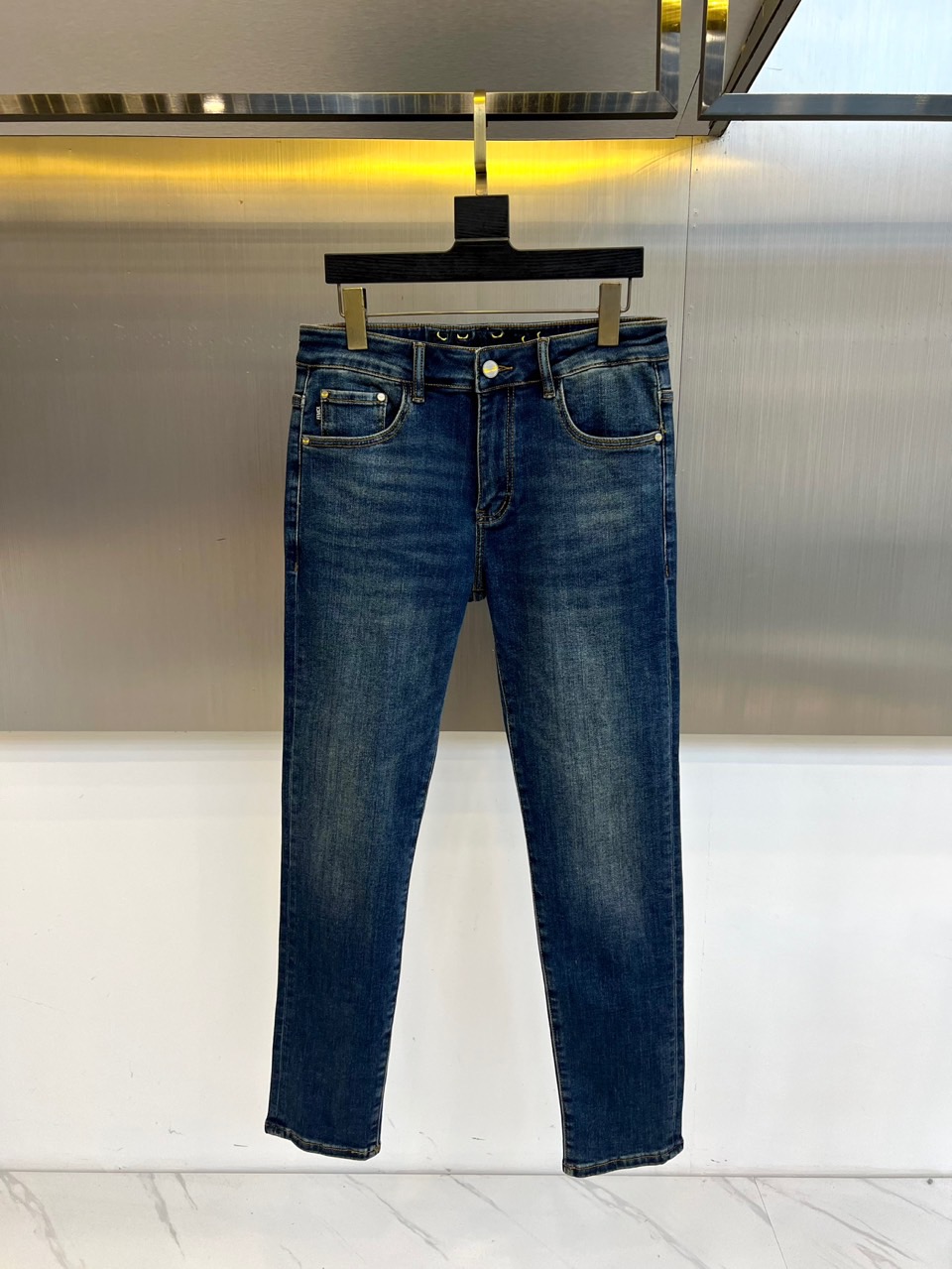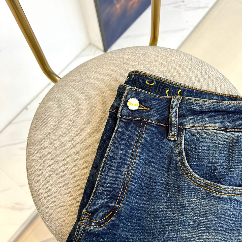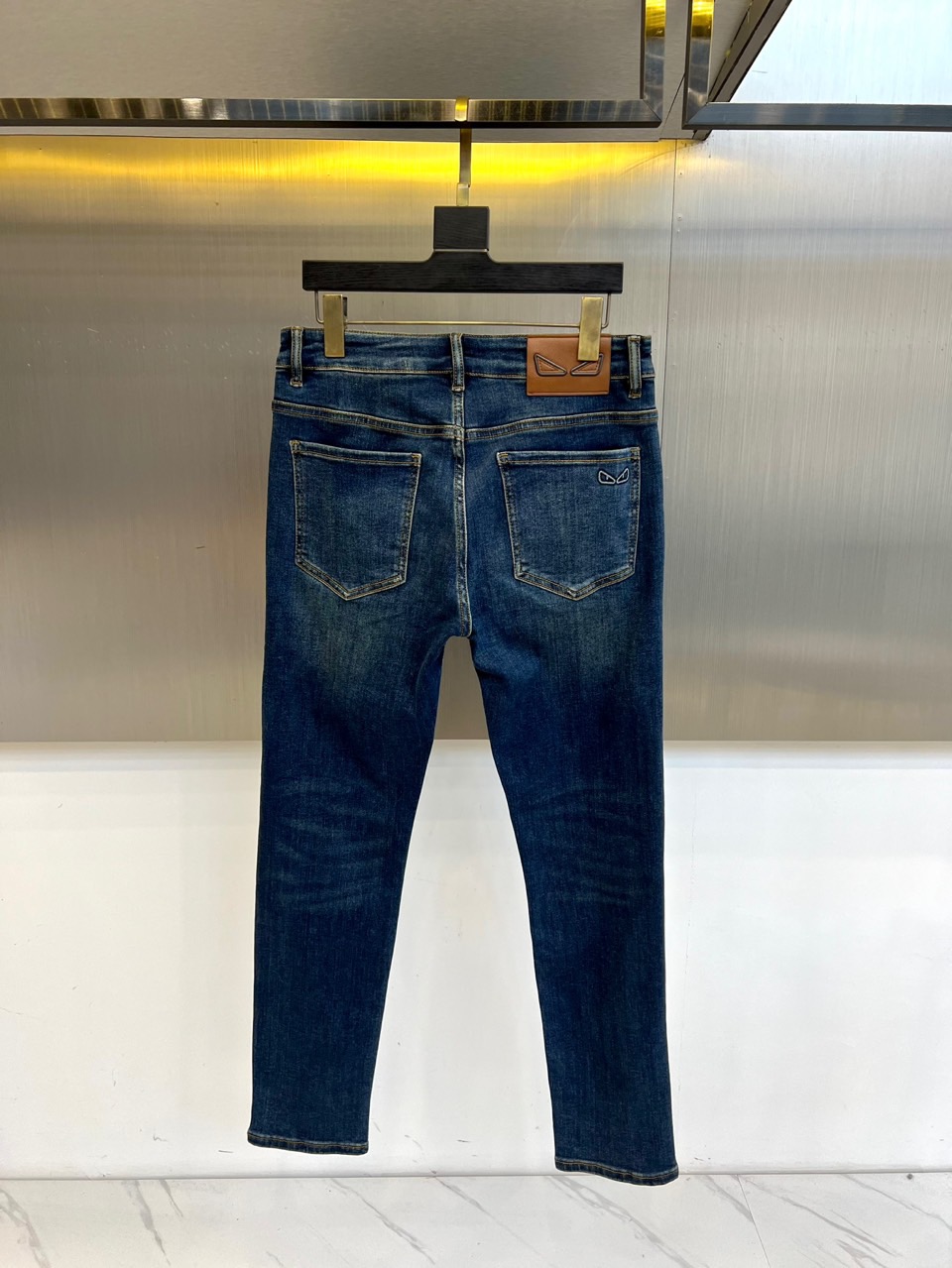 Fendi 2025 SS men's light blue vintage wash stretch jeans. 98% cotton, 2% elastane. Eco-friendly enzyme wash, soft yet structured. Embroidery, custom YKK zipper. Straight slim fit. Sizes 28-36, 38.