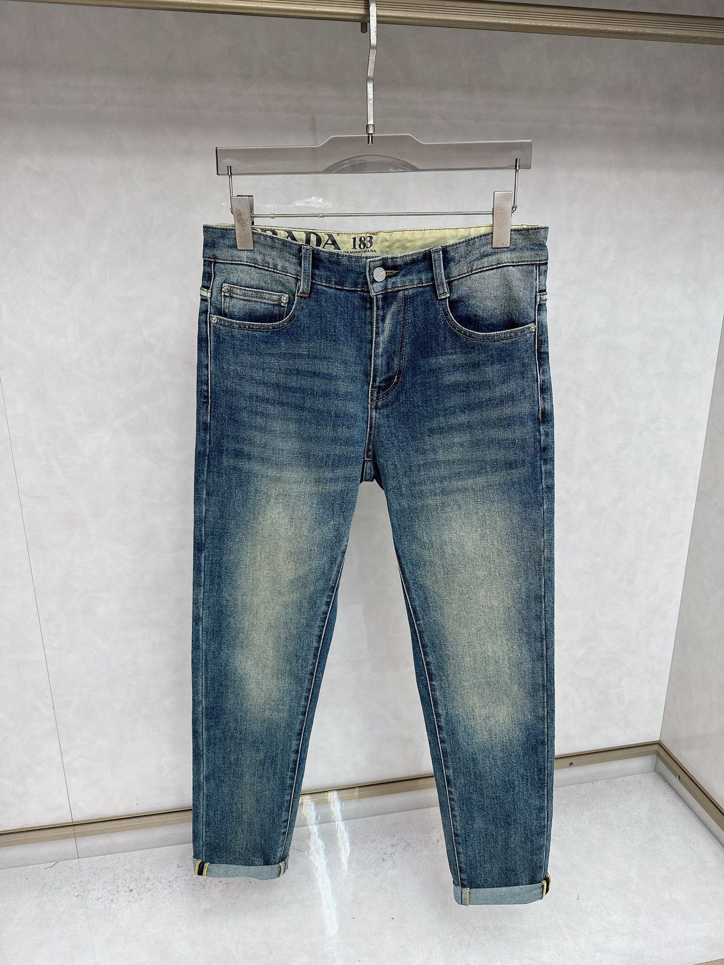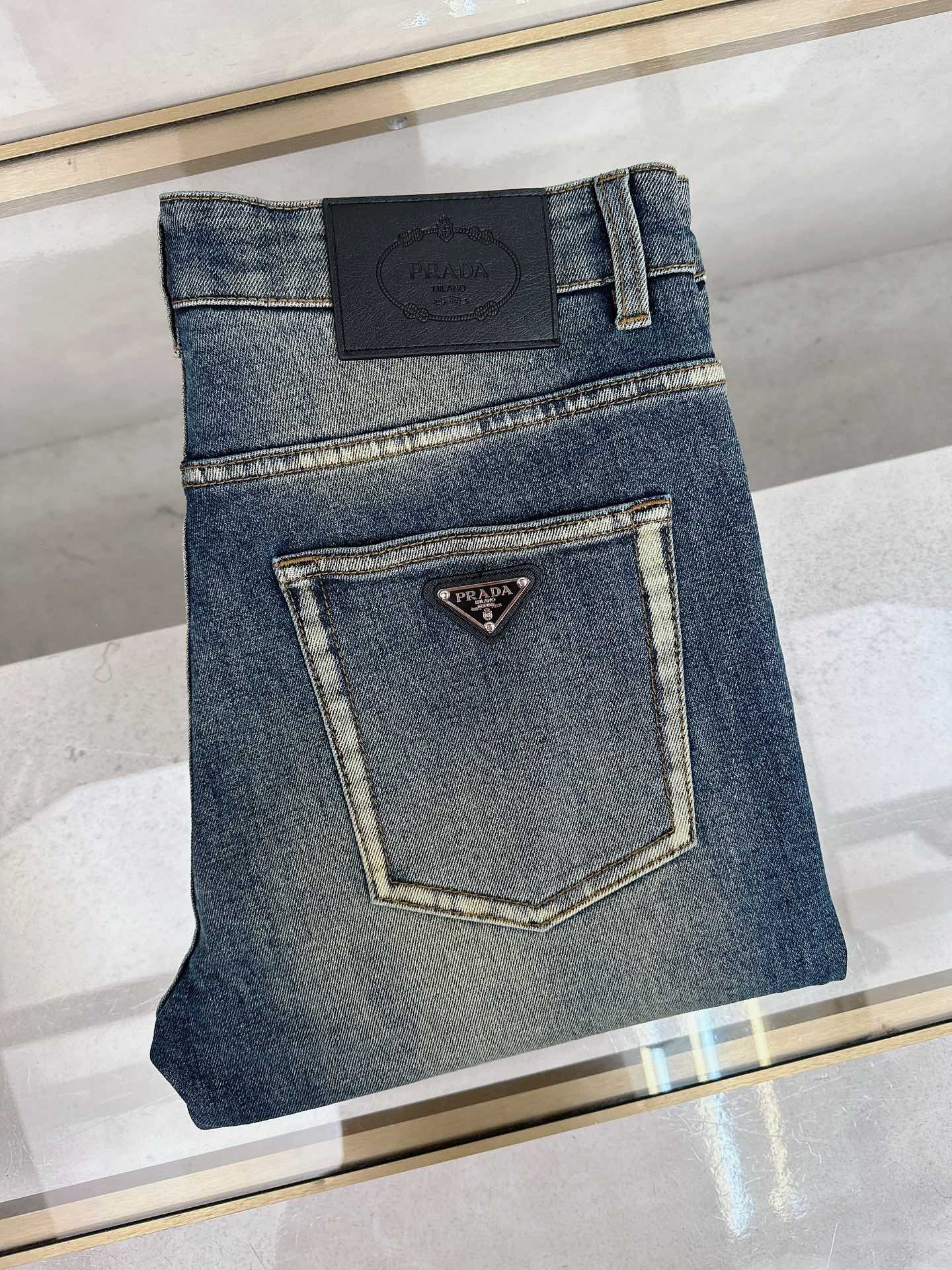 Prada 2025 Fall/Winter high-quality jeans, slim fit with stretch, comfortable. Classic logo, minimalist European style. Sizes 29-38.
