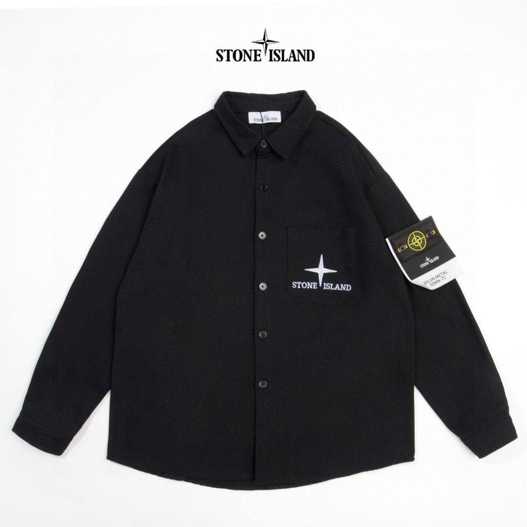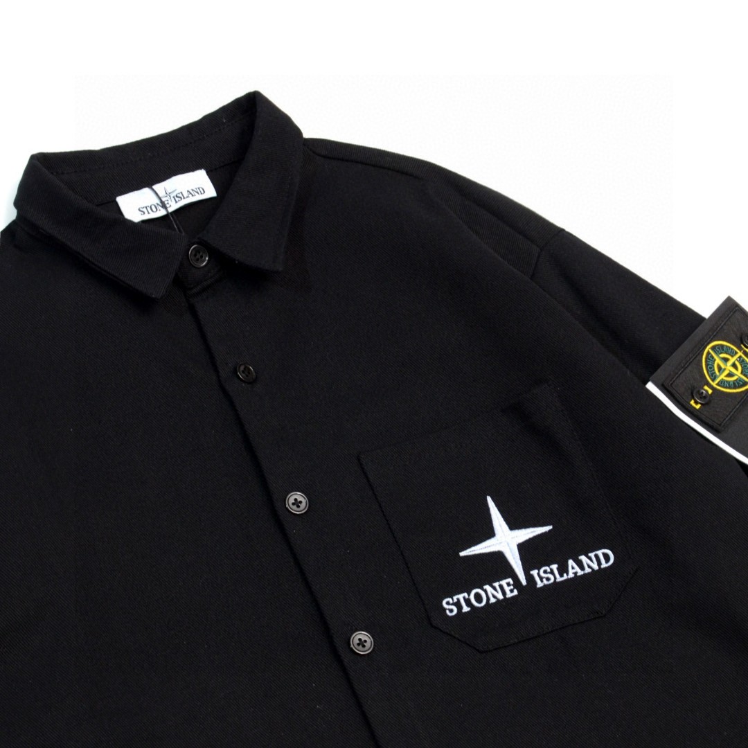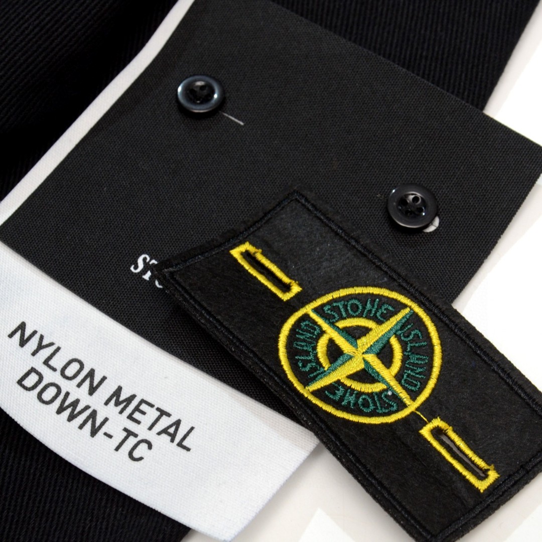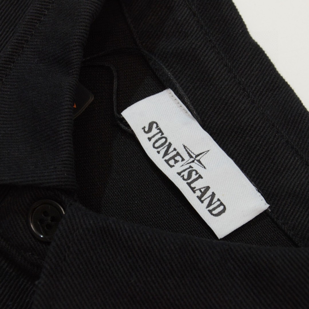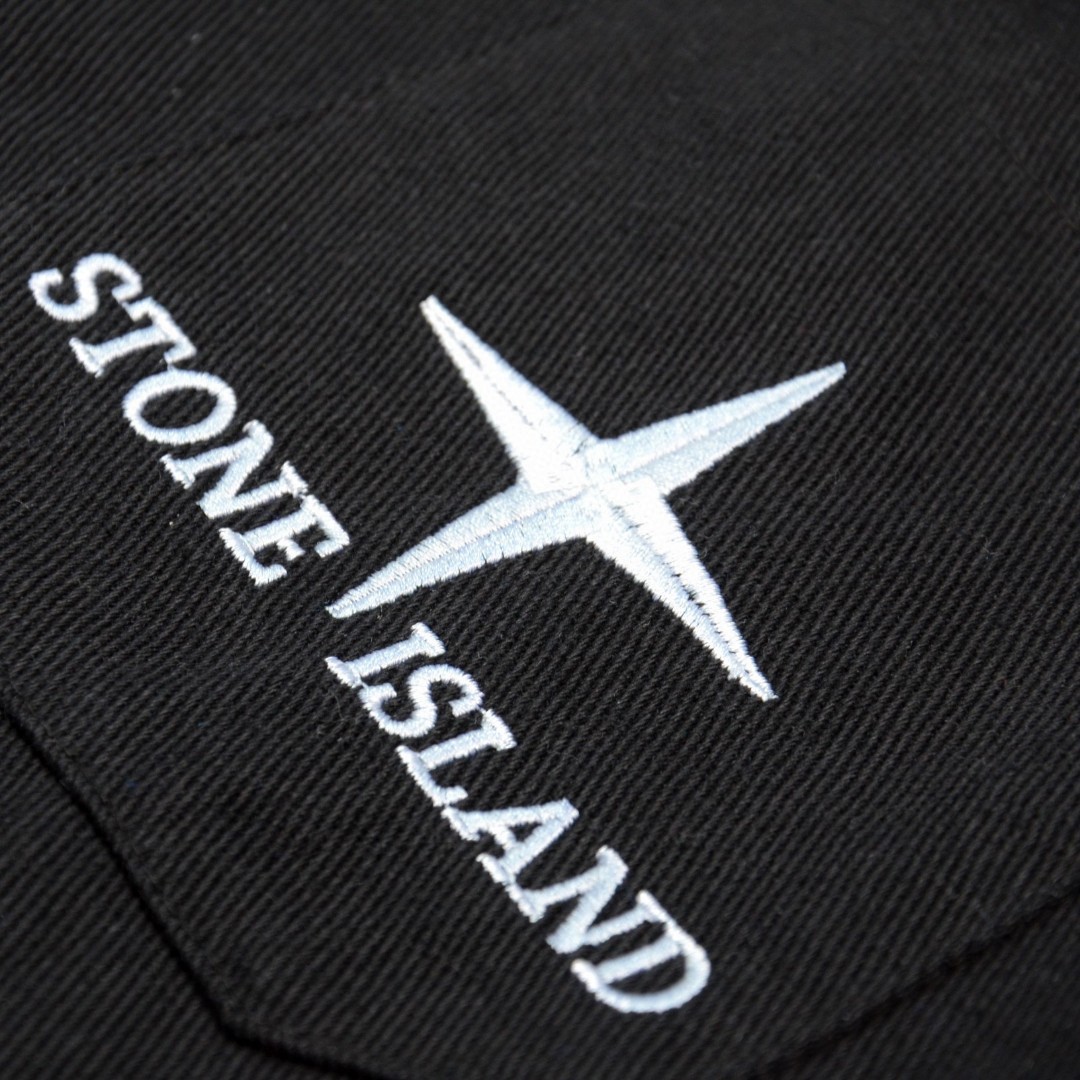 Stone Island embroidered compass logo denim jacket. Custom fabric, soft wash. Detachable badge. Unisex. Black. Sizes M-2XL.